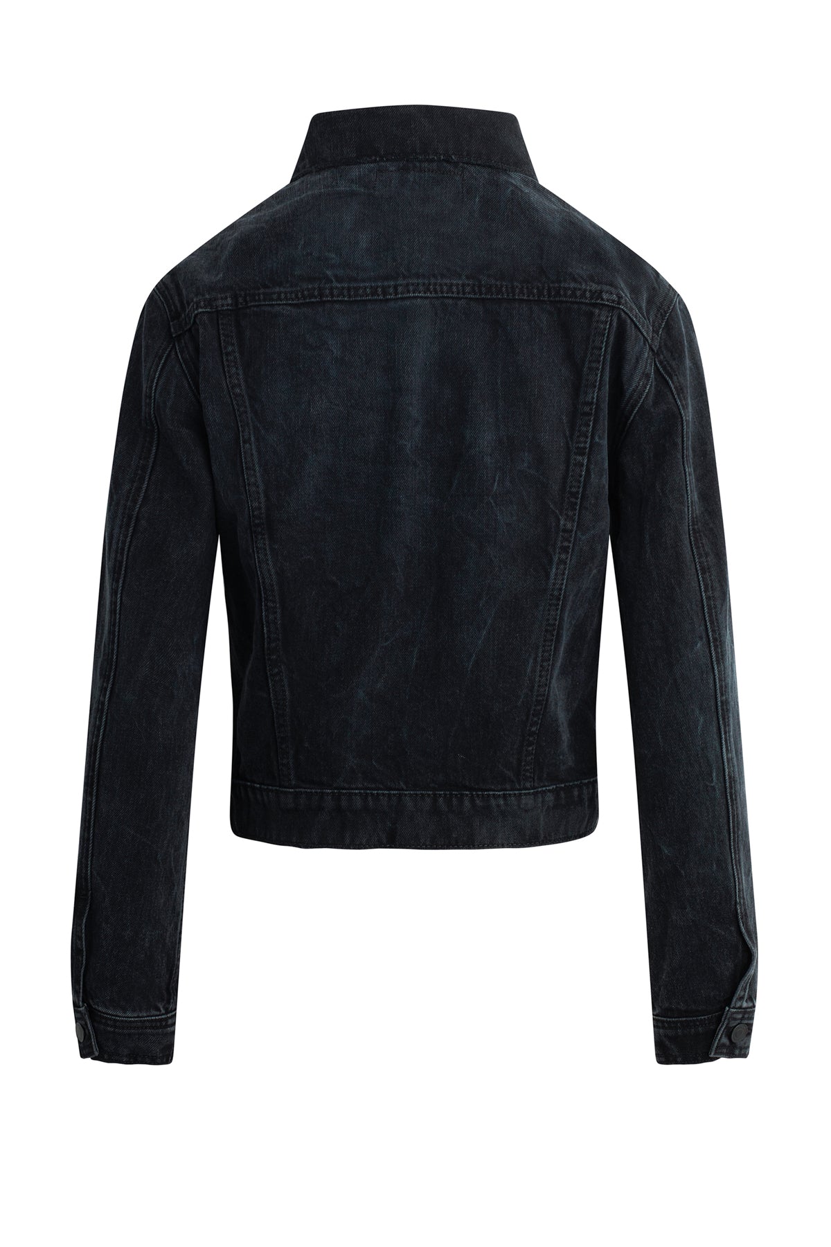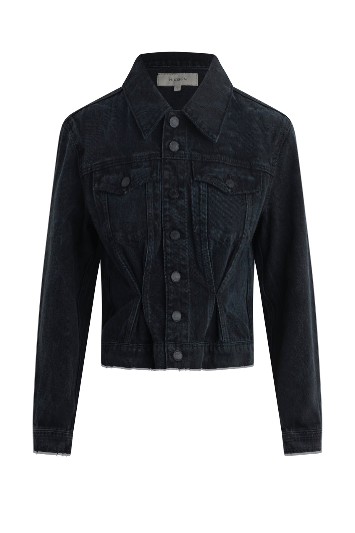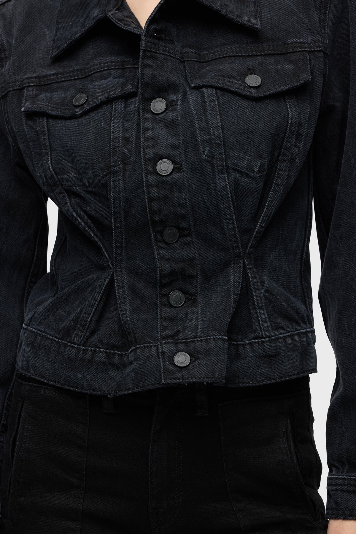Cut from premium Italian rigid denim, our Cinched Waist Jacket in washed black Dark Night has a pleated waist for a corset look and is finished with long sleeves, pointed collar and front buttons. -
