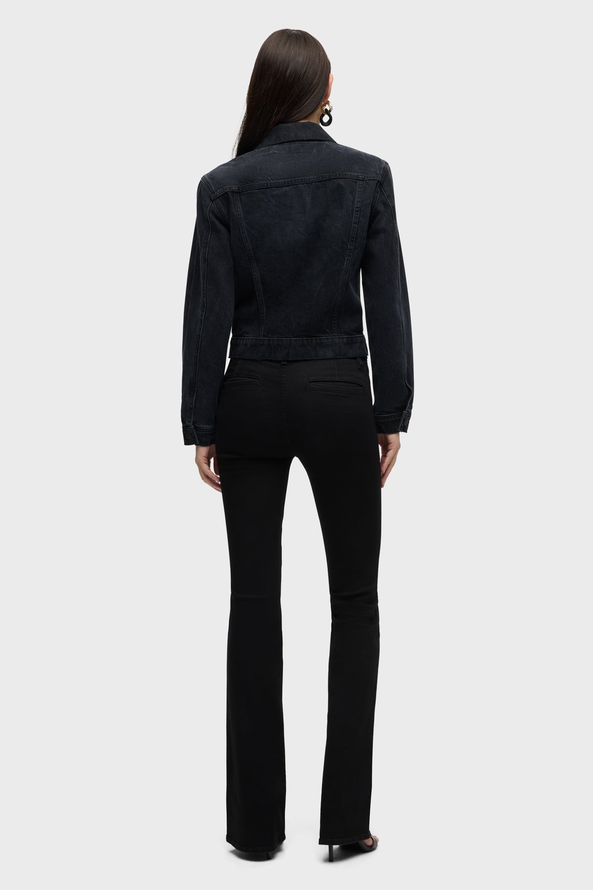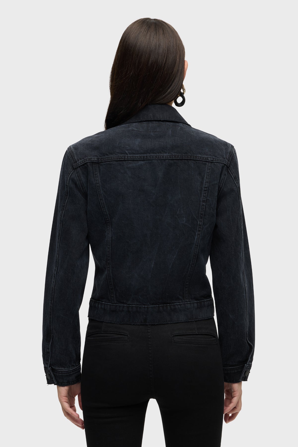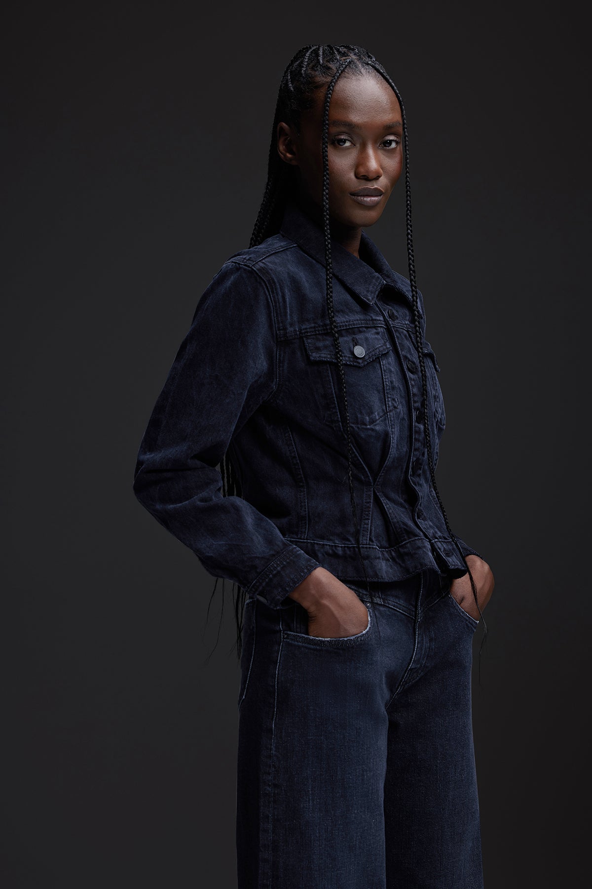 Cut from premium Italian rigid denim, our Cinched Waist Jacket in washed black Dark Night has a pleated waist for a corset look and is finished with long sleeves, pointed collar and front buttons. -