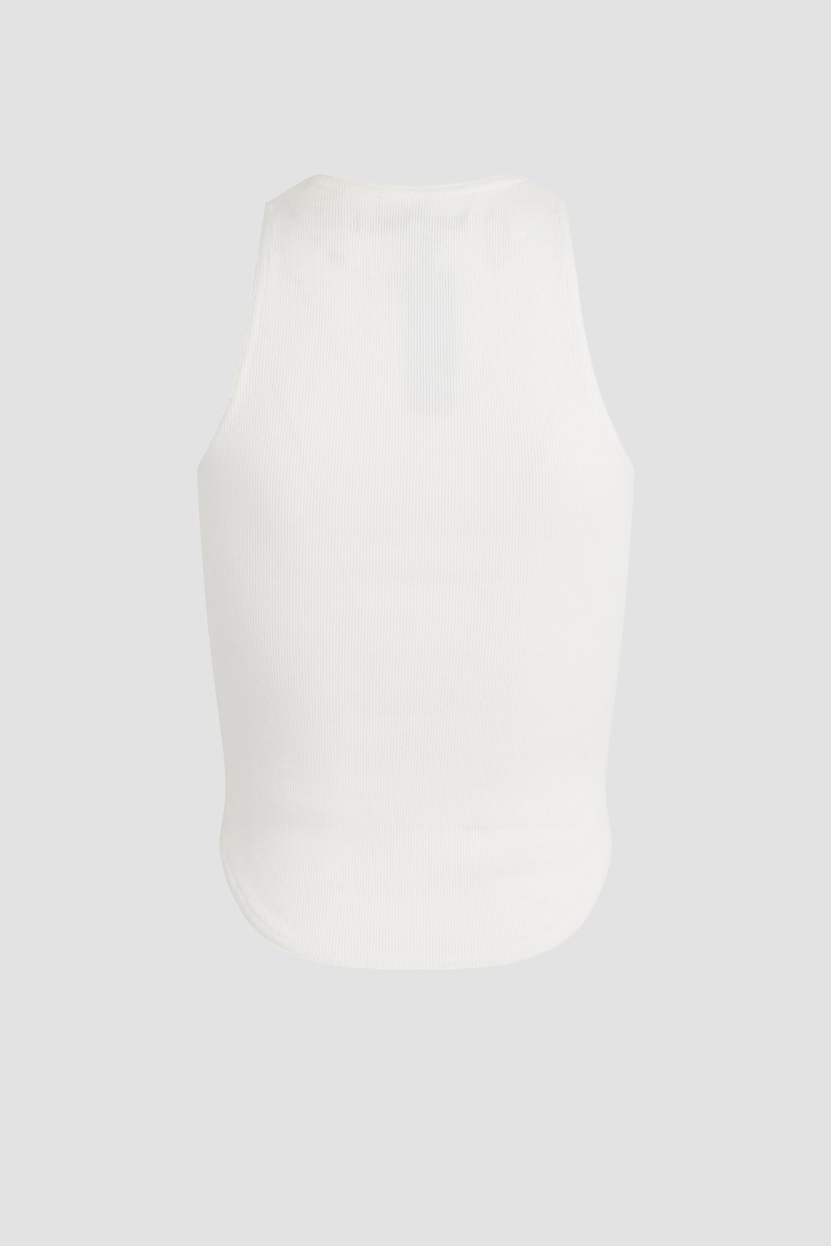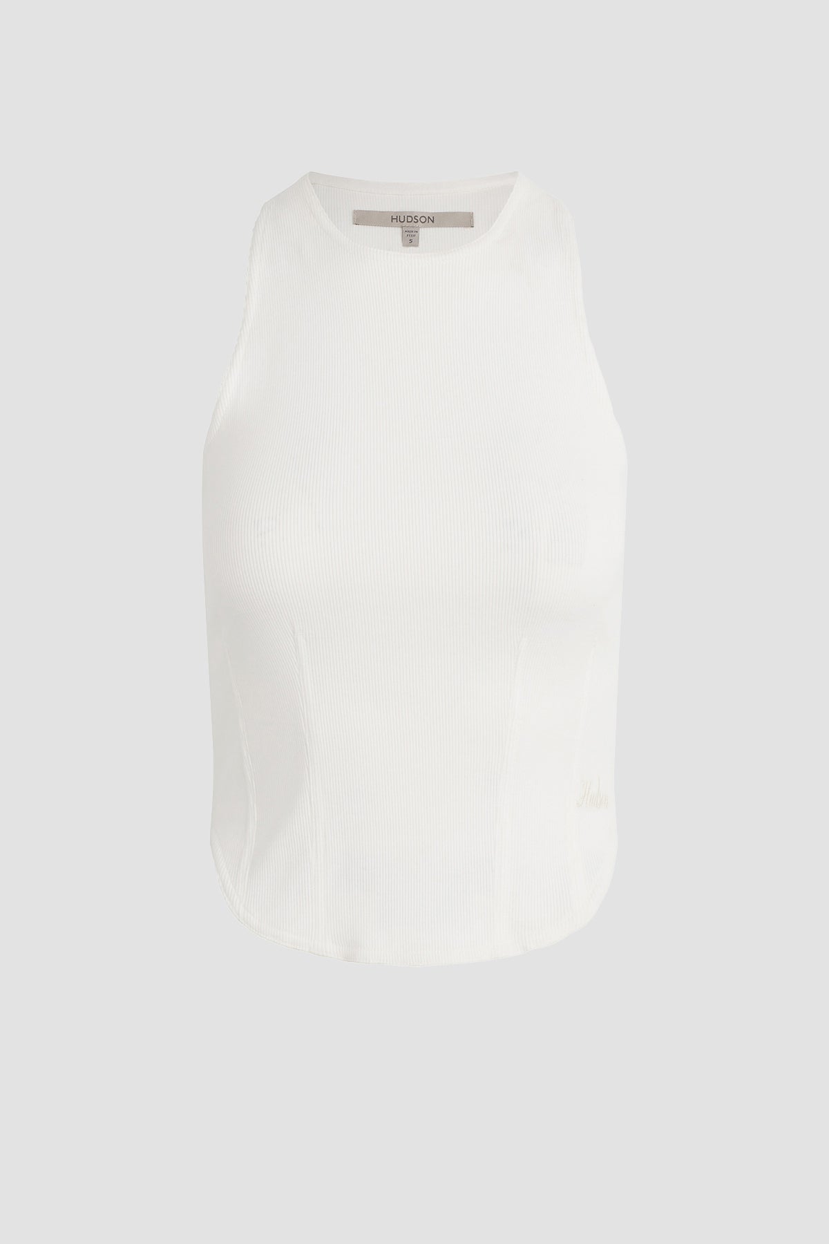 The Eco Darted Tank in White is a must. The curved hem and seam details give it a more contoured look. -
