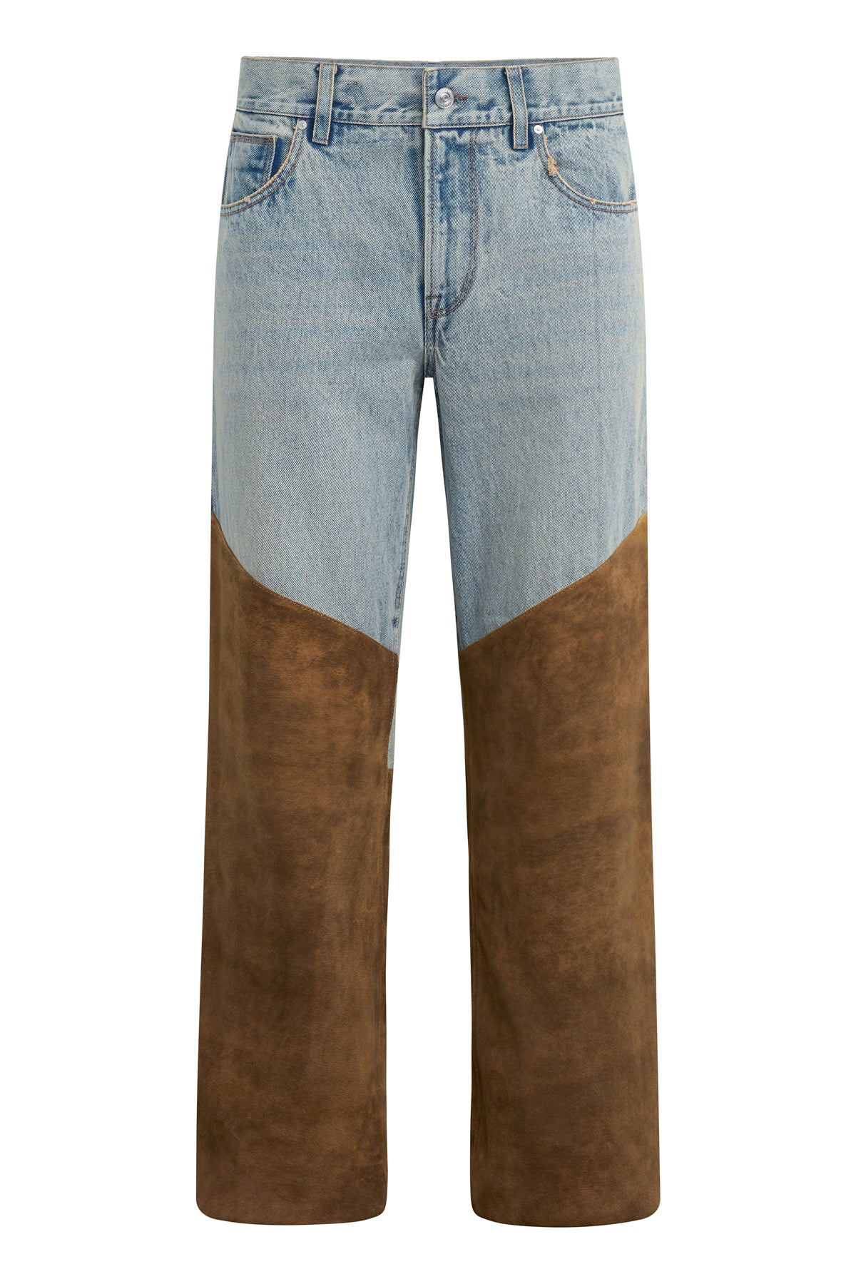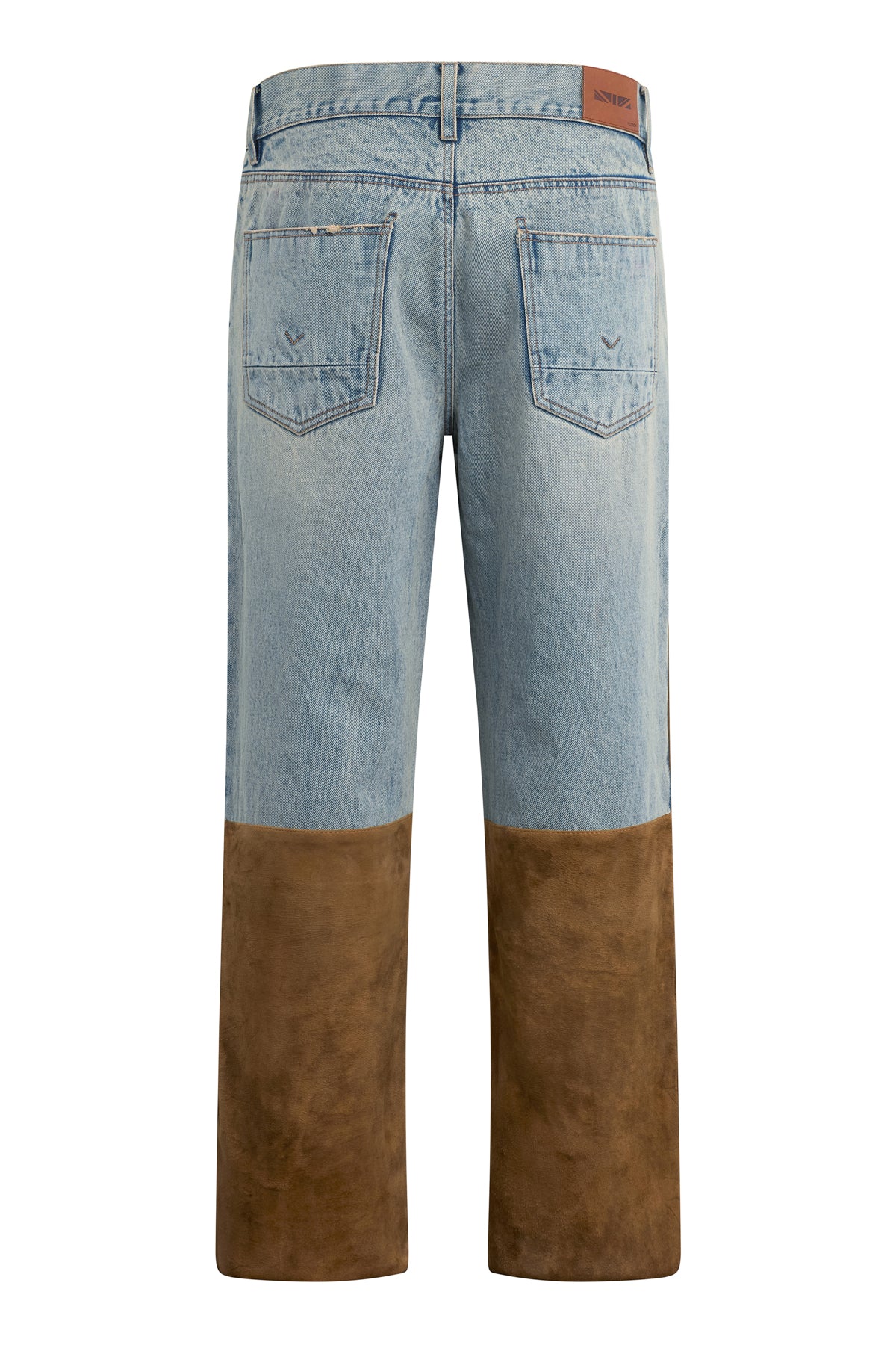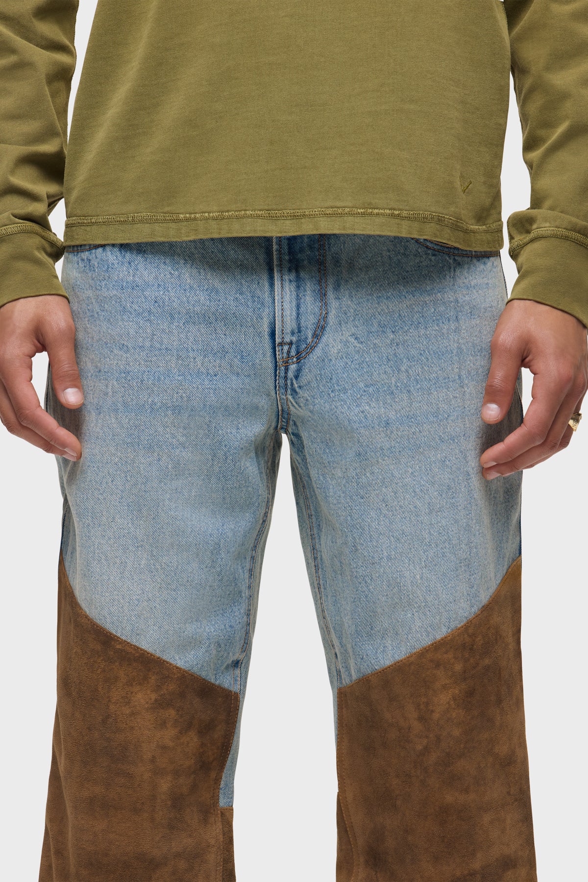 Our Denim Suede Work Pant in Monroe brings western vibes with the cool Hudson edge you love. This relaxed fit features vintage-inspired light indigo denim with genuine suede leather paneling from the knee down. -