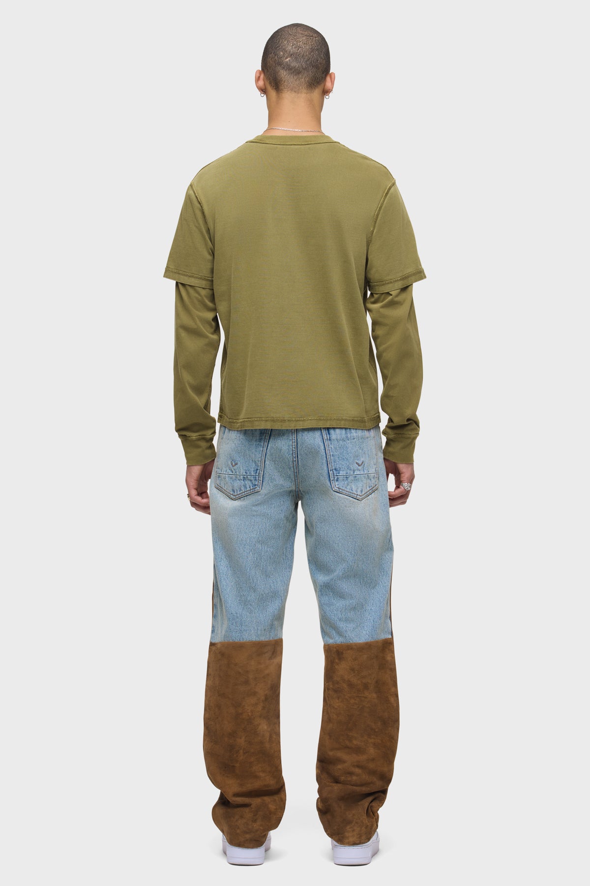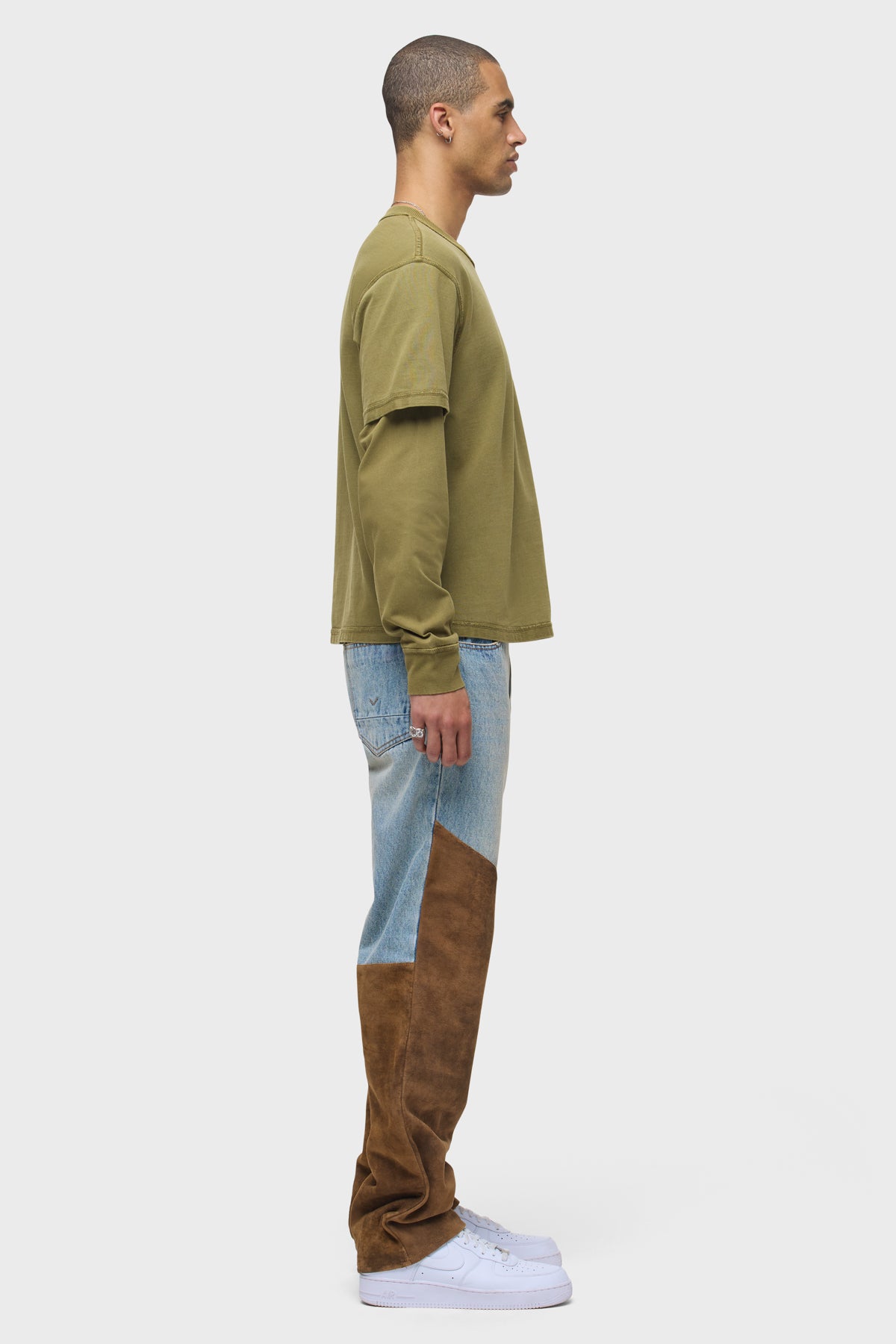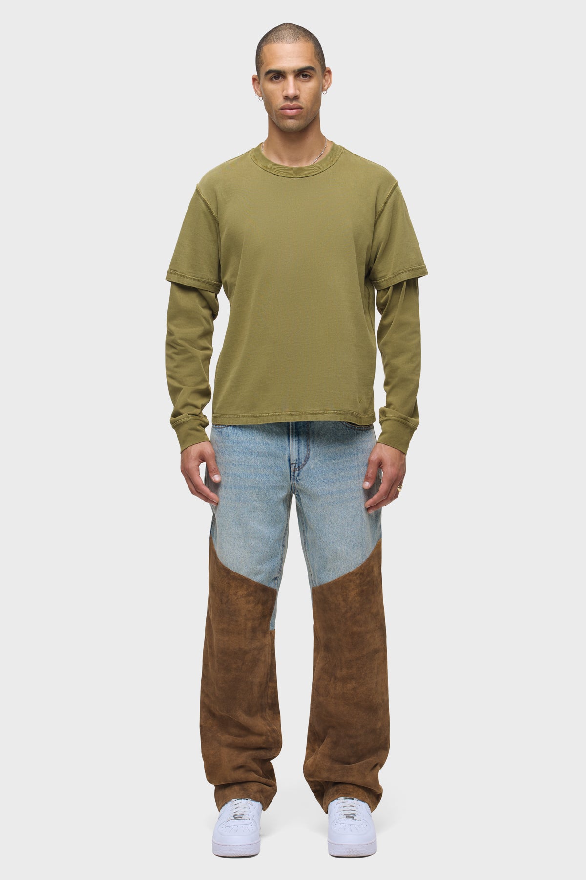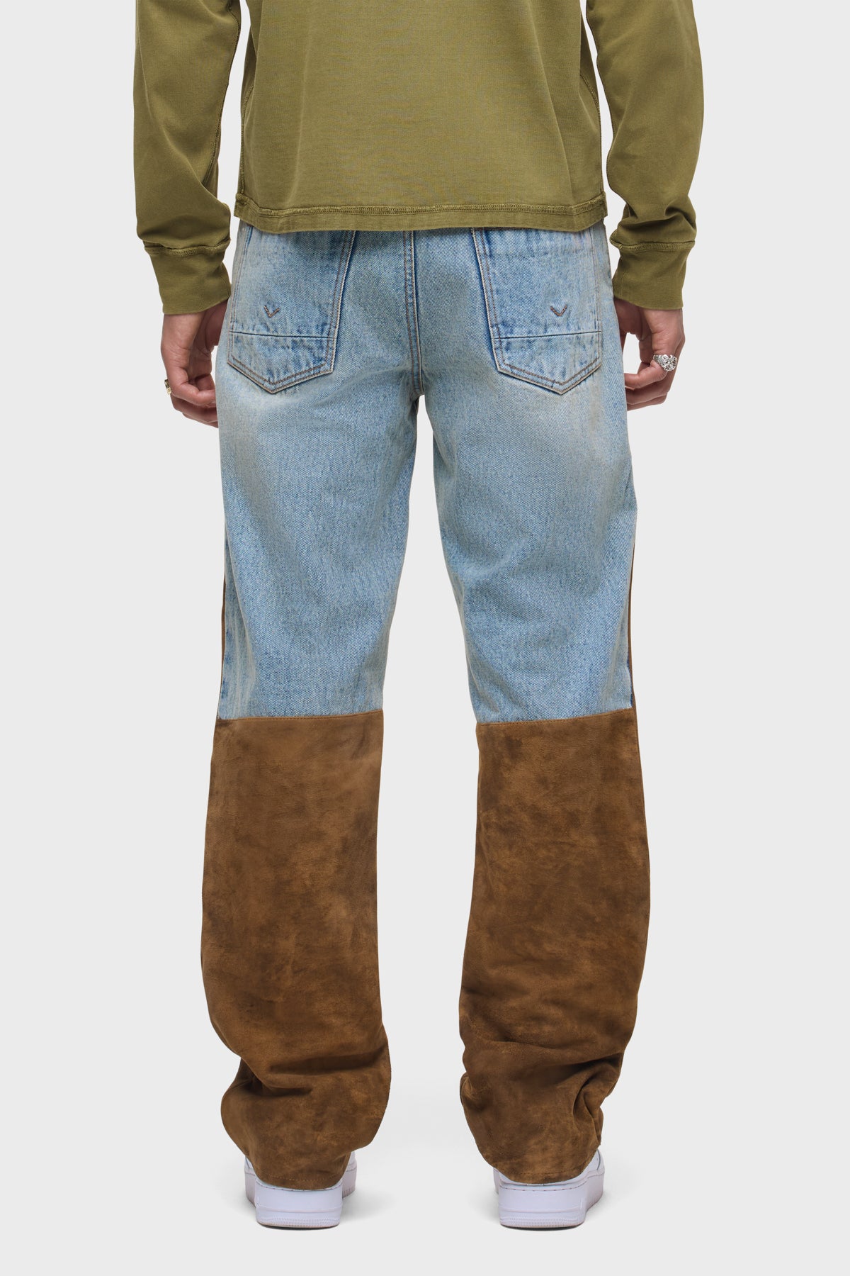 Our Denim Suede Work Pant in Monroe brings western vibes with the cool Hudson edge you love. This relaxed fit features vintage-inspired light indigo denim with genuine suede leather paneling from the knee down. -