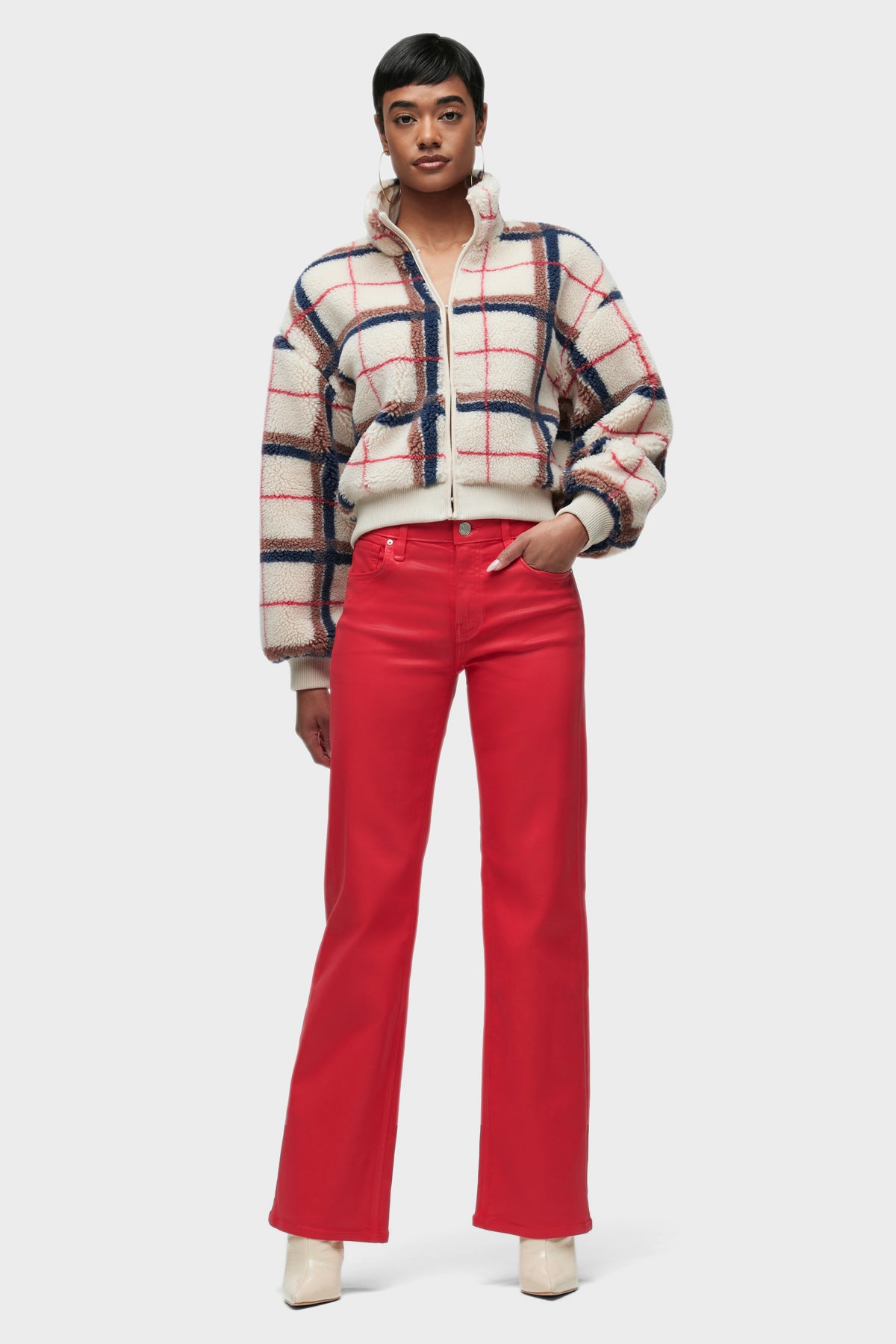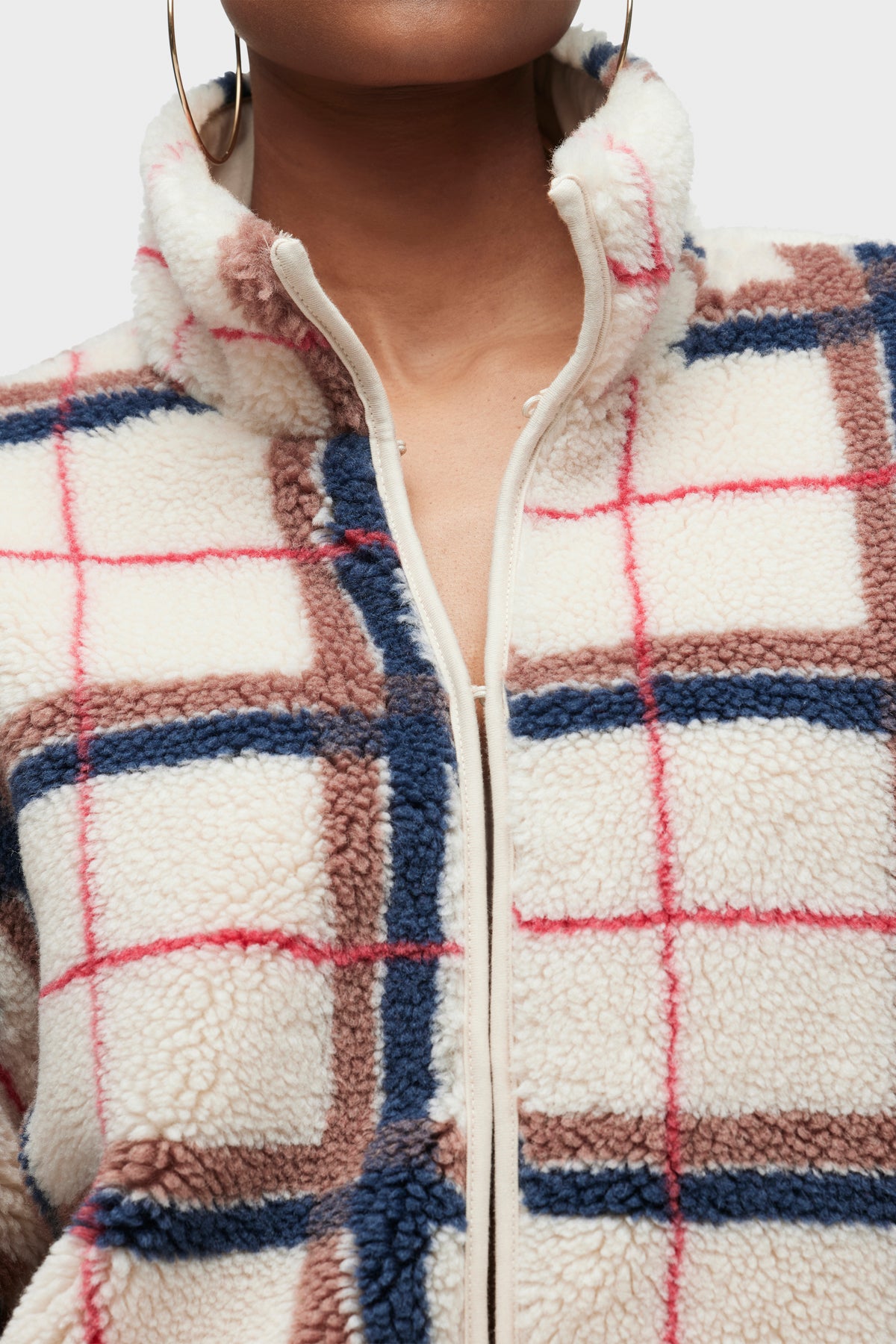The Hook & Eye Sherpa Jacket in Creme Plaid is both stylish and cozy. It features a plaid jacquard print, front zipper closure and ribbing at the sleeves and waistband with hook & eye detail. -