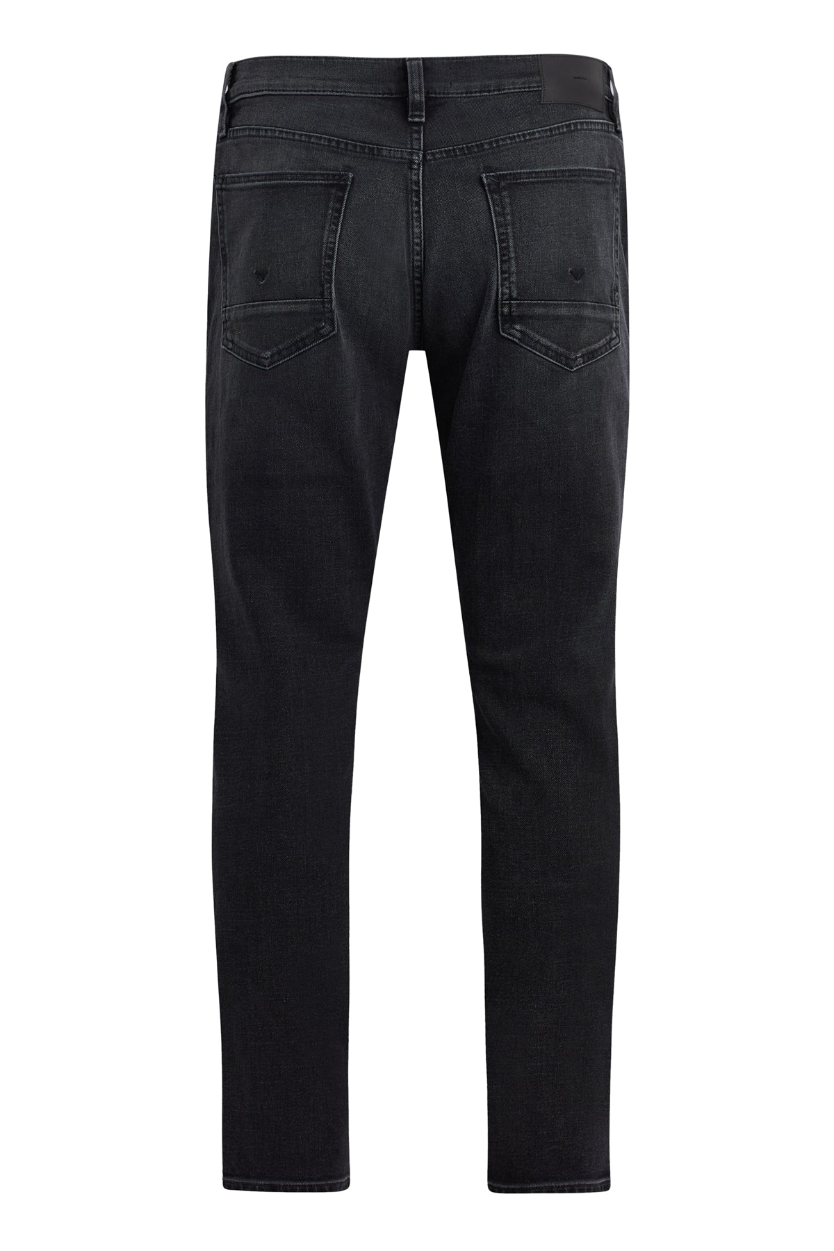 Can’t beat Blake, our modern, just-right fit. Mid-rise, slim through the hip and thigh with a tapered leg. A classic. The washed-black Caviar shade with whiskering and edge grinding is cut from premium comfort stretch denim that is super soft for a worn-in look. The pair is finished with dull nickel hardware and black leather back patch. -