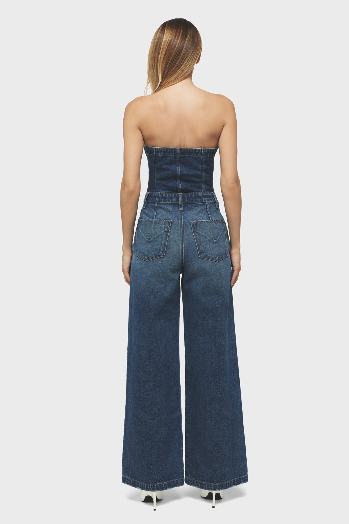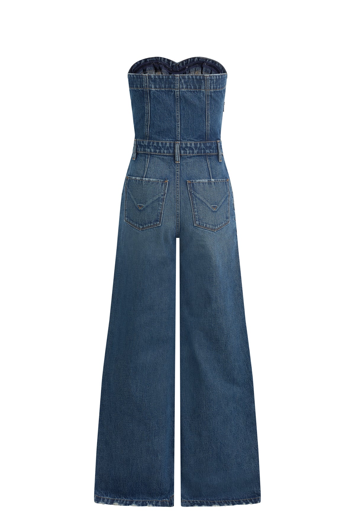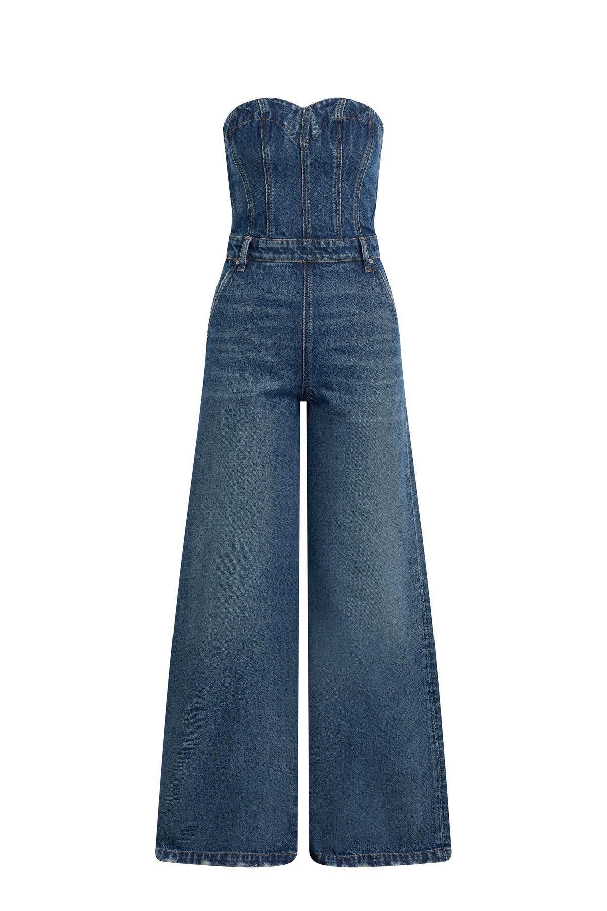 Designed in collaboration with RIVET UTILITY to create 'one & done' pieces, The Creator is a Sweetheart Wide Leg Jumpsuit in a rigid denim with a medium, vintage-inspired wash. The one-piece is complete with a strapless, sweetheart neckline, trouser pockets, side zipper, finished hem and 33" inseam. -