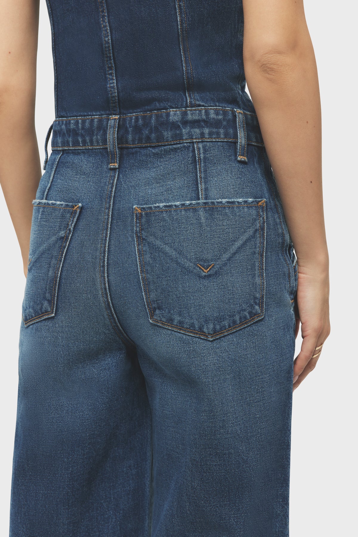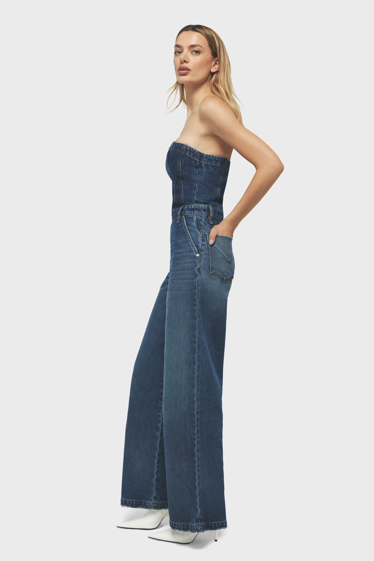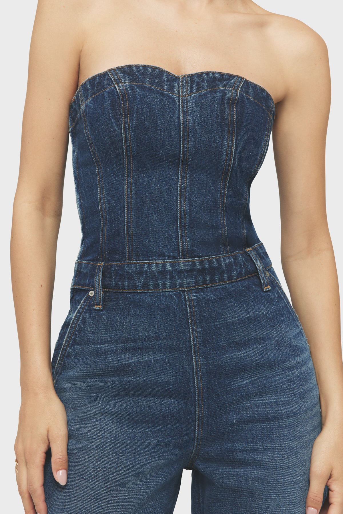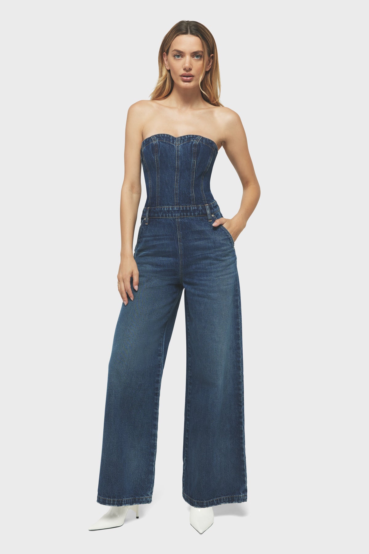 Designed in collaboration with RIVET UTILITY to create 'one & done' pieces, The Creator is a Sweetheart Wide Leg Jumpsuit in a rigid denim with a medium, vintage-inspired wash. The one-piece is complete with a strapless, sweetheart neckline, trouser pockets, side zipper, finished hem and 33" inseam. -