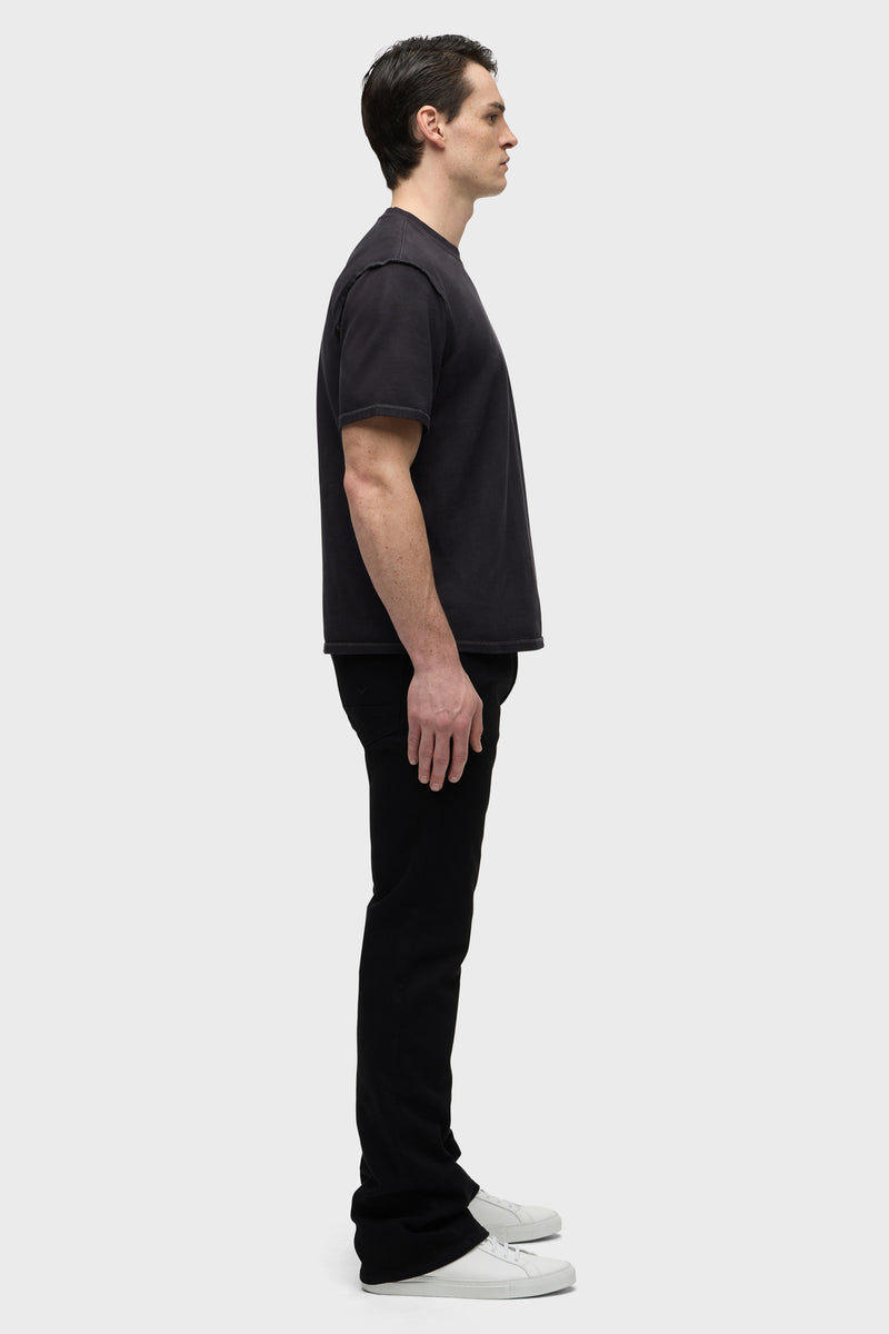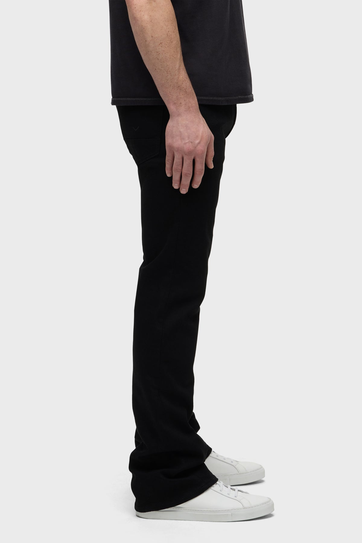 Our Walker Kick Flare is a mid-rise, slim through the hip and thigh with a flared bootcut hem. The black rinse Raven wash is finished with matte black hardware and black leather back patch. -