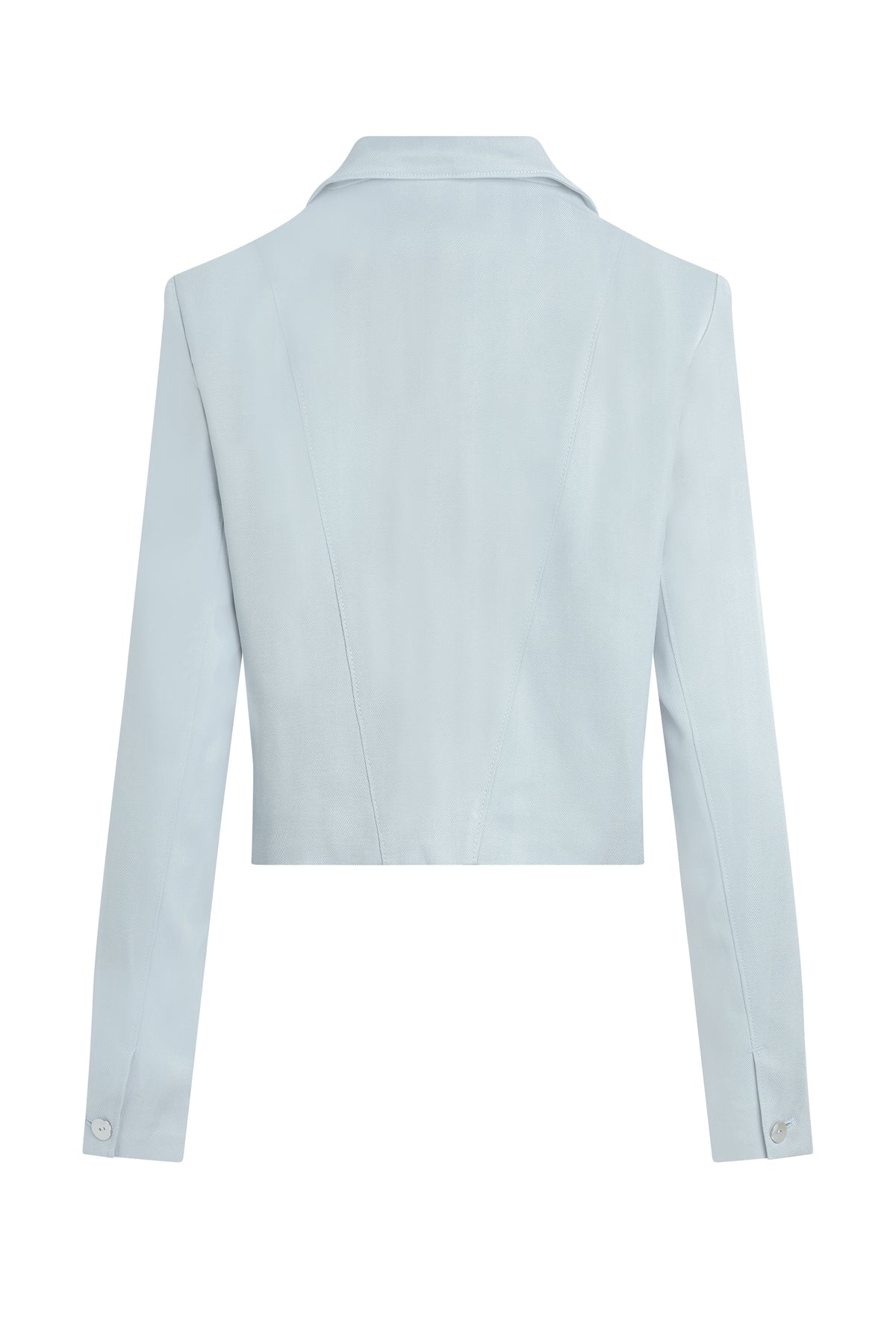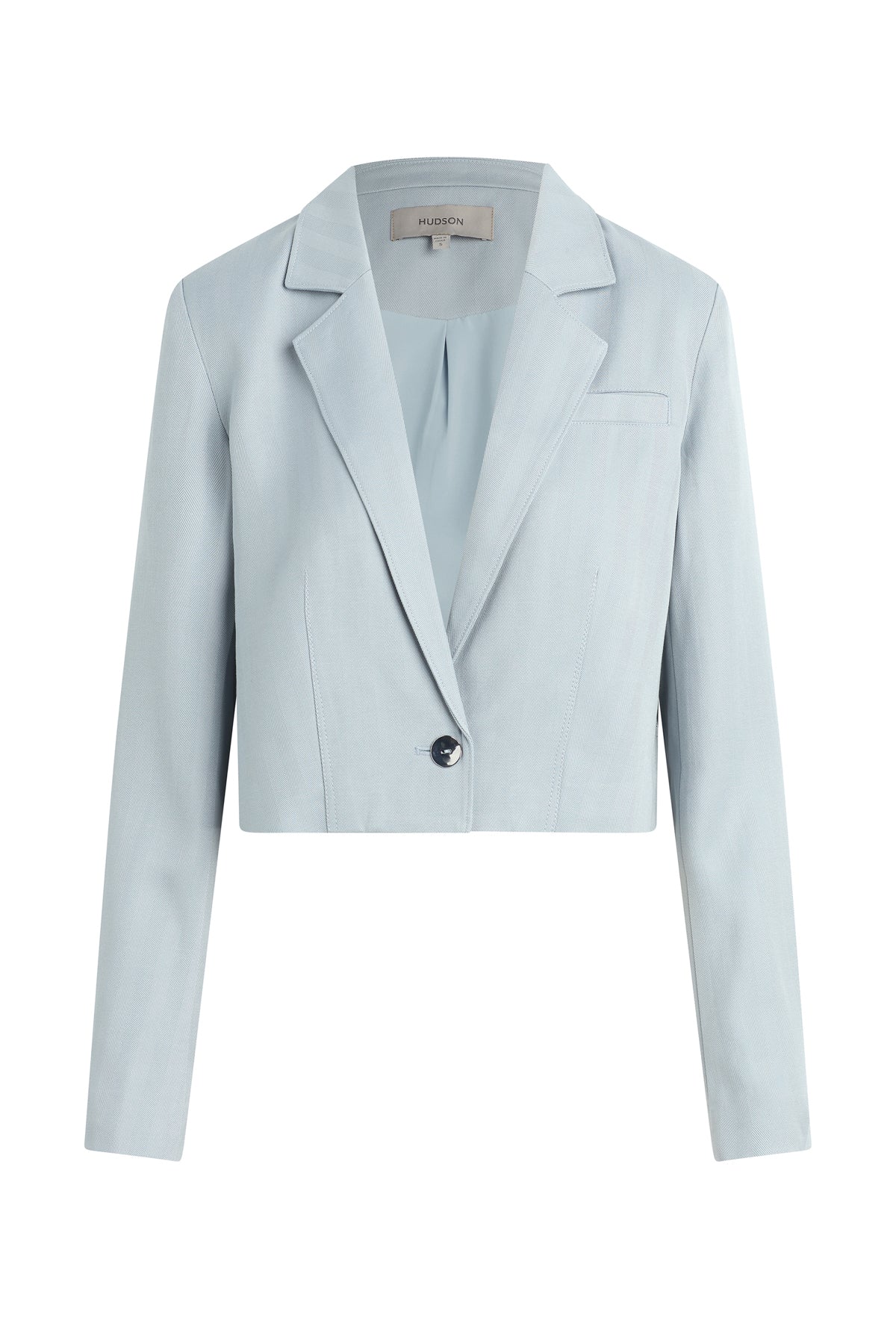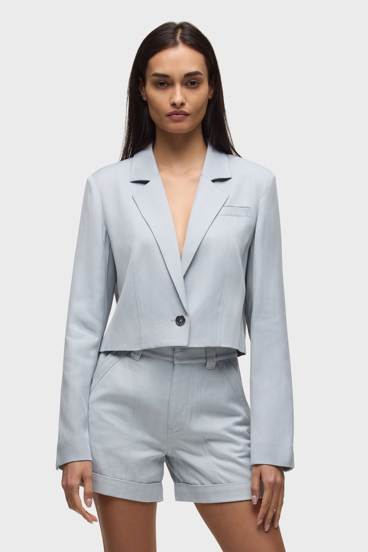 The Cropped Blazer in Herringbone High Rise is a sophisticated style with a cropped fit, a single button closure and buttons at the sleeve placket. This style features a blue-grey herringbone suiting fabrication. -