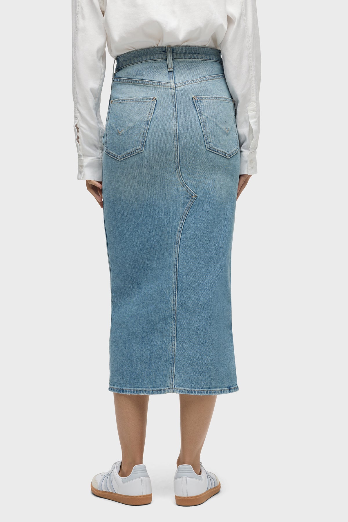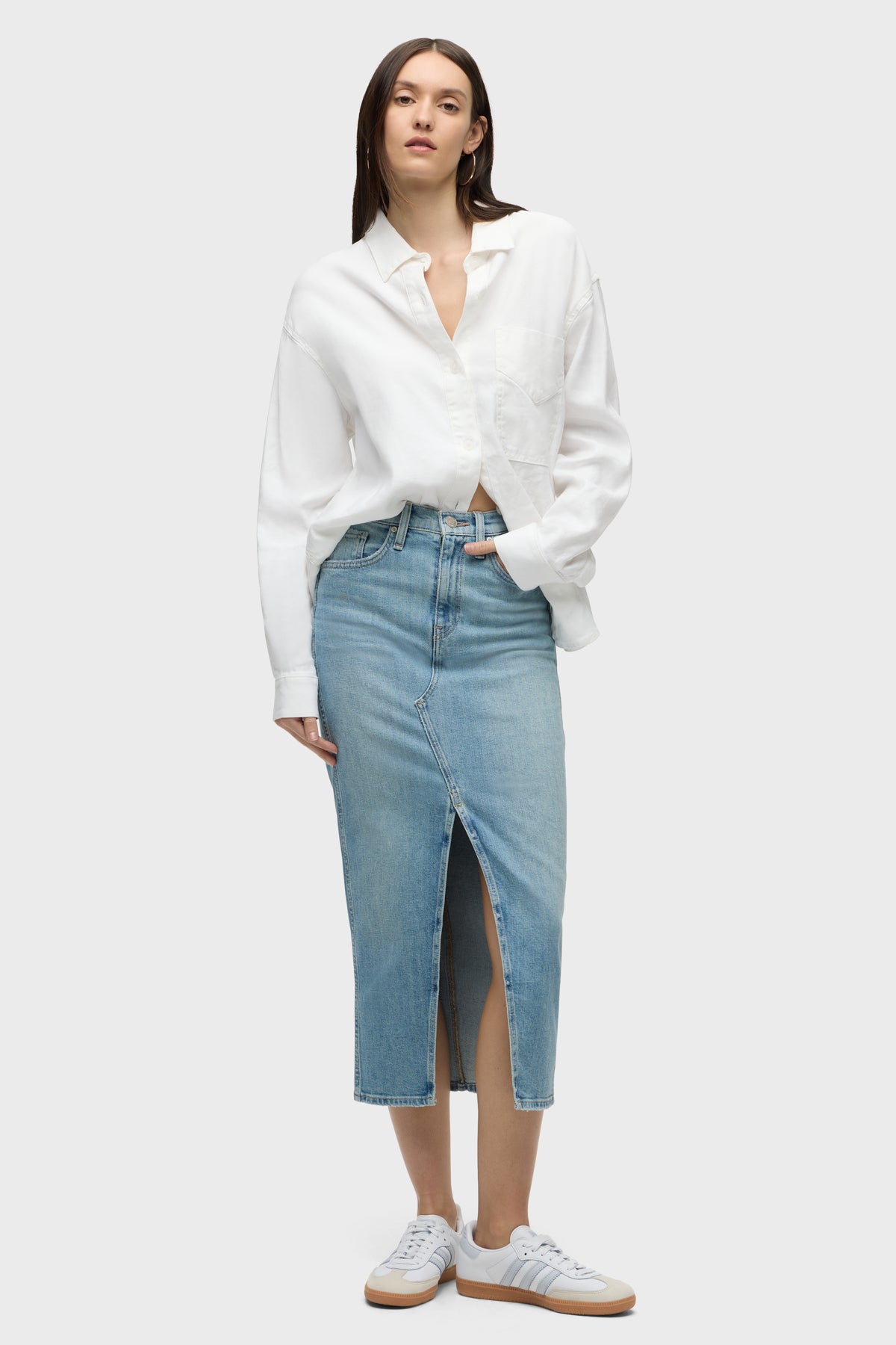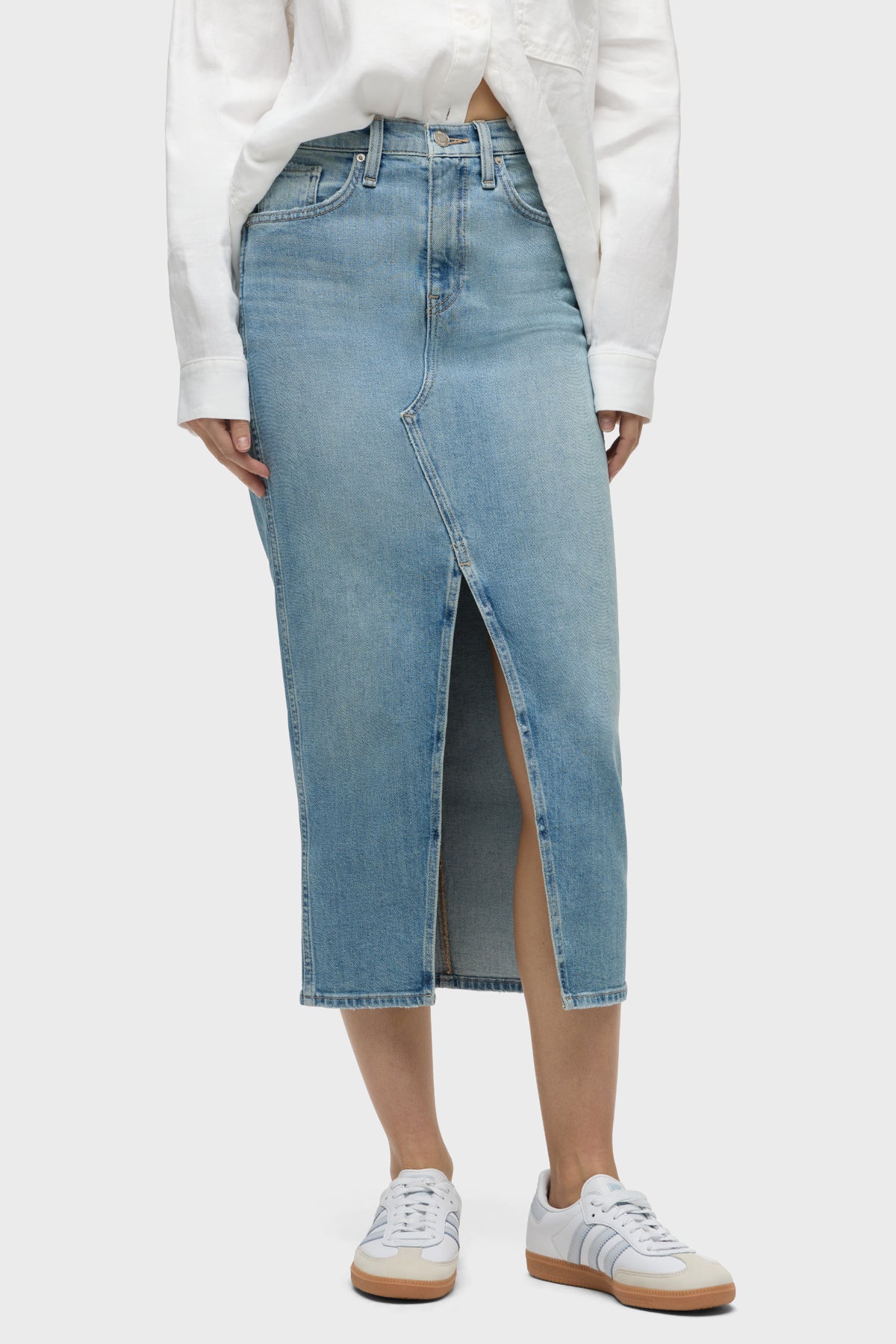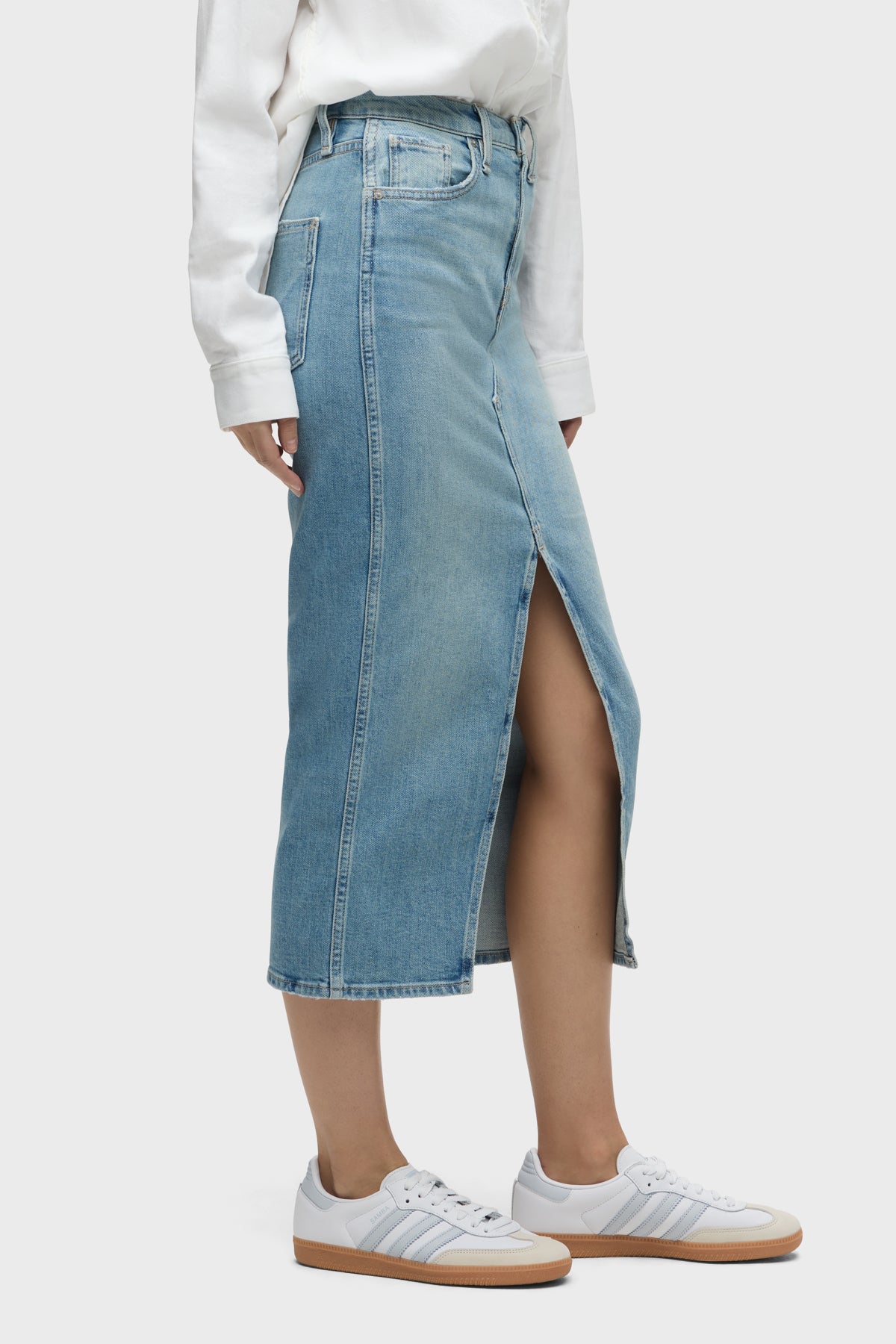Long and sleek, our Reconstructed Skirt in Offshore is cut from premium comfort stretch denim with a high center slit and gentle fading for vintage appeal. -
