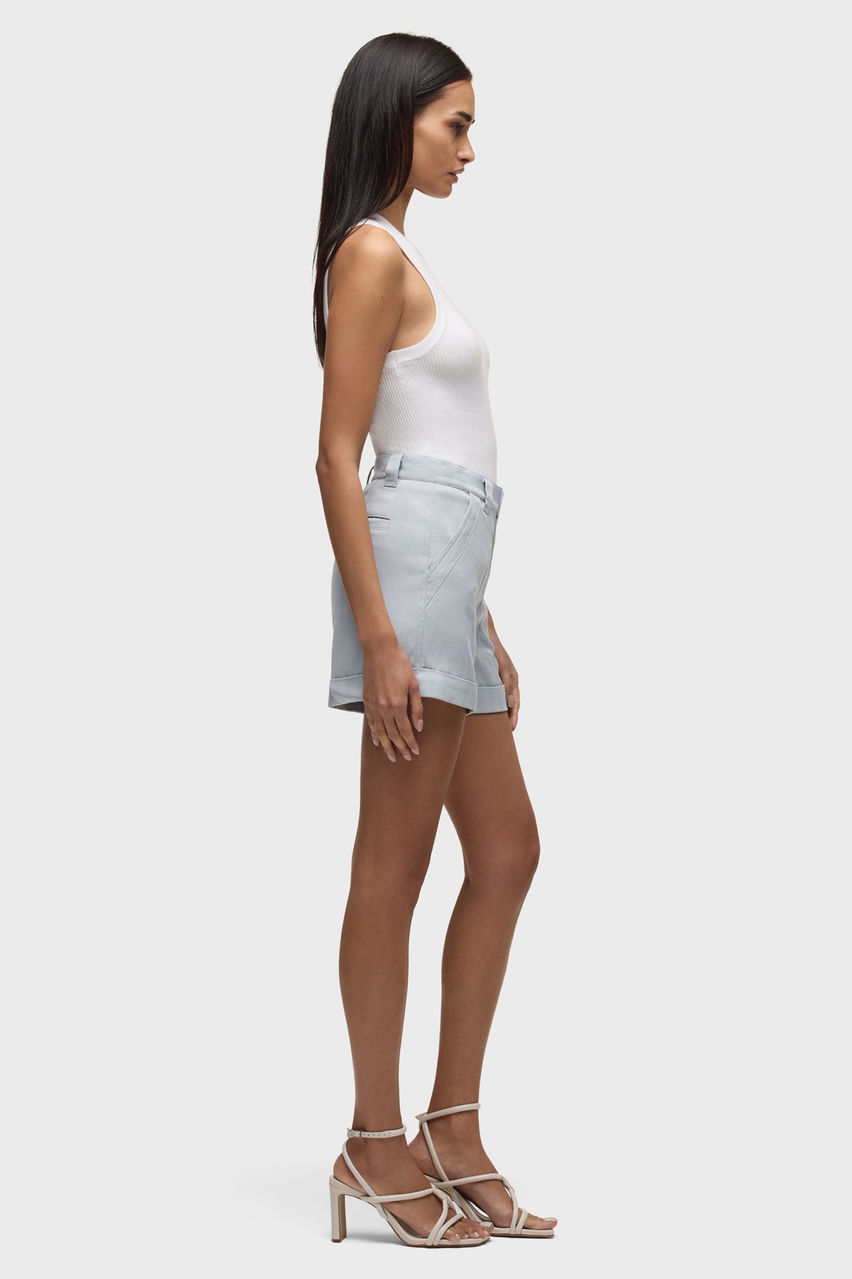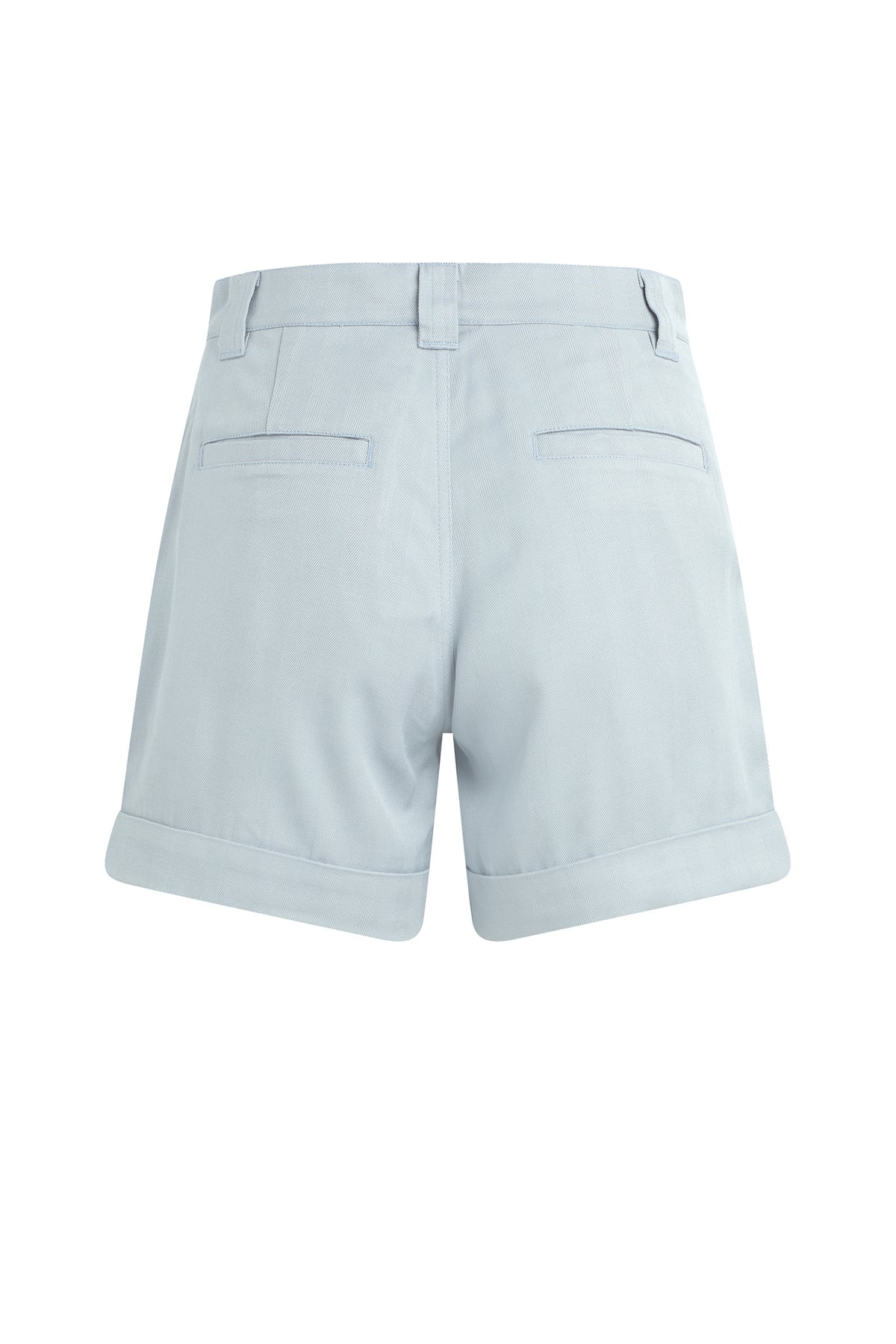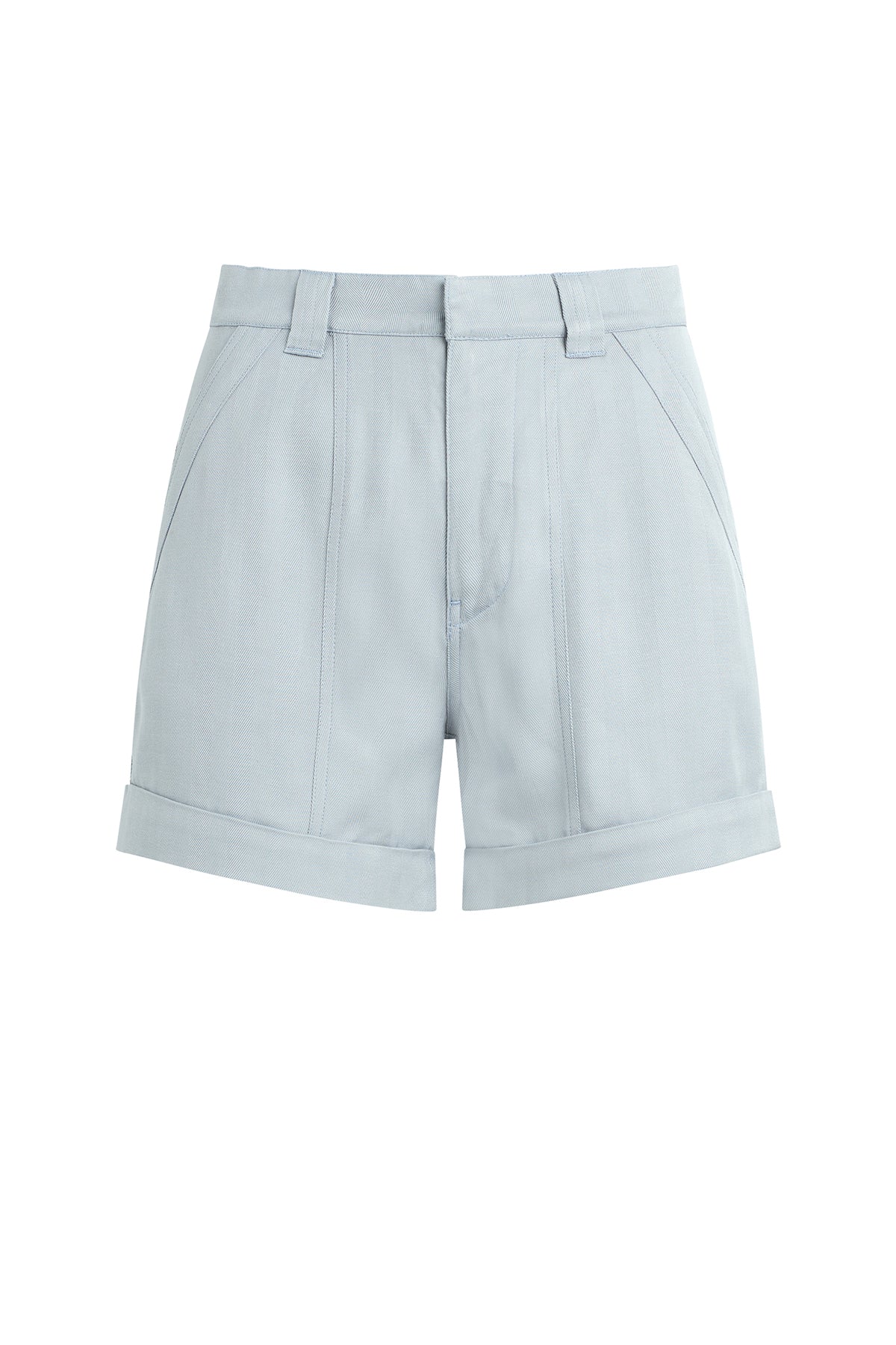 The Trouser Short in Herringbone High Rise is a sophisticated tailored fit with trouser pockets, a cuffed hem and a zipper front with a hook-and-bar at center front. This style features a blue grey herringbone suiting fabrication. -
