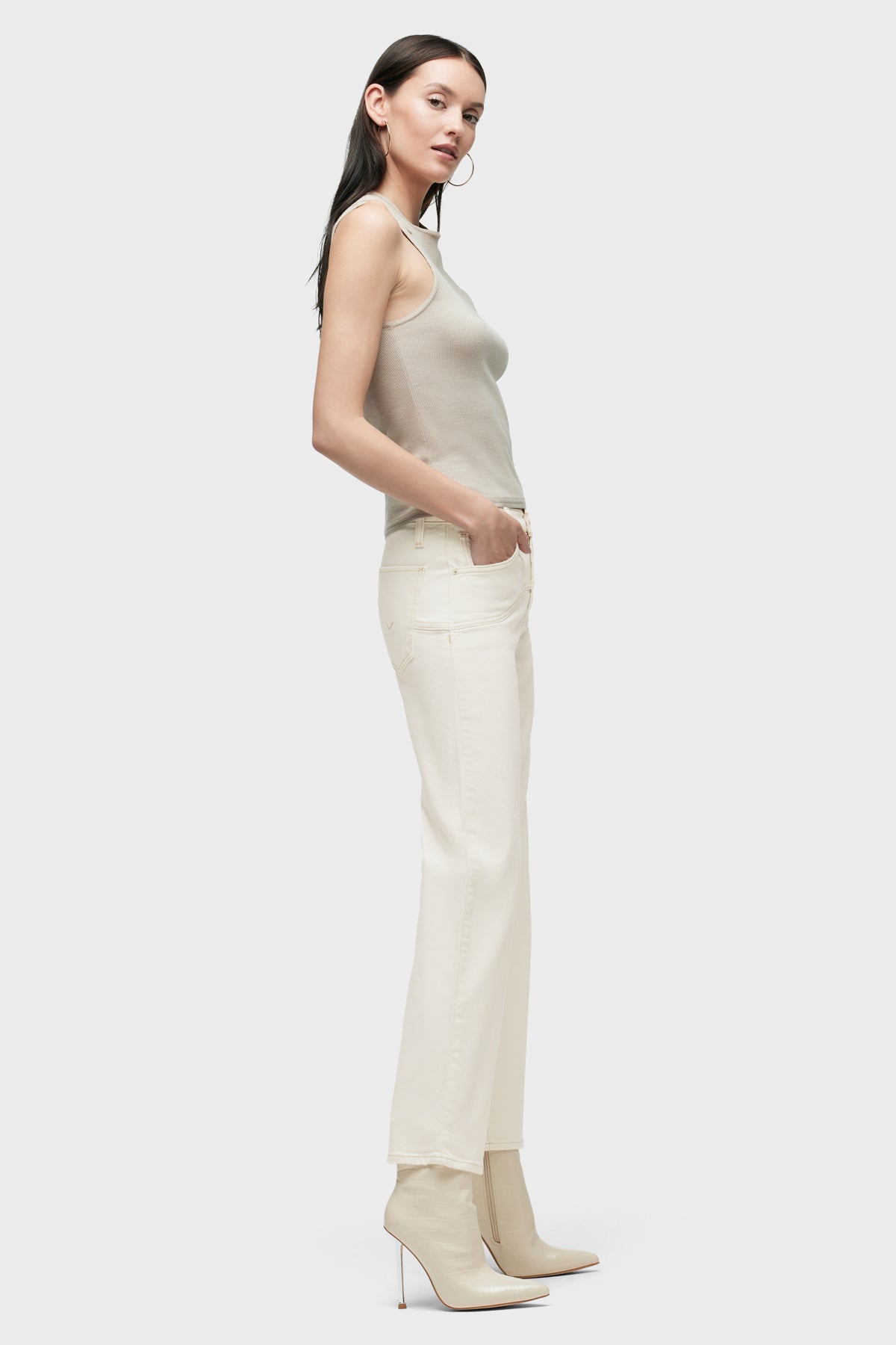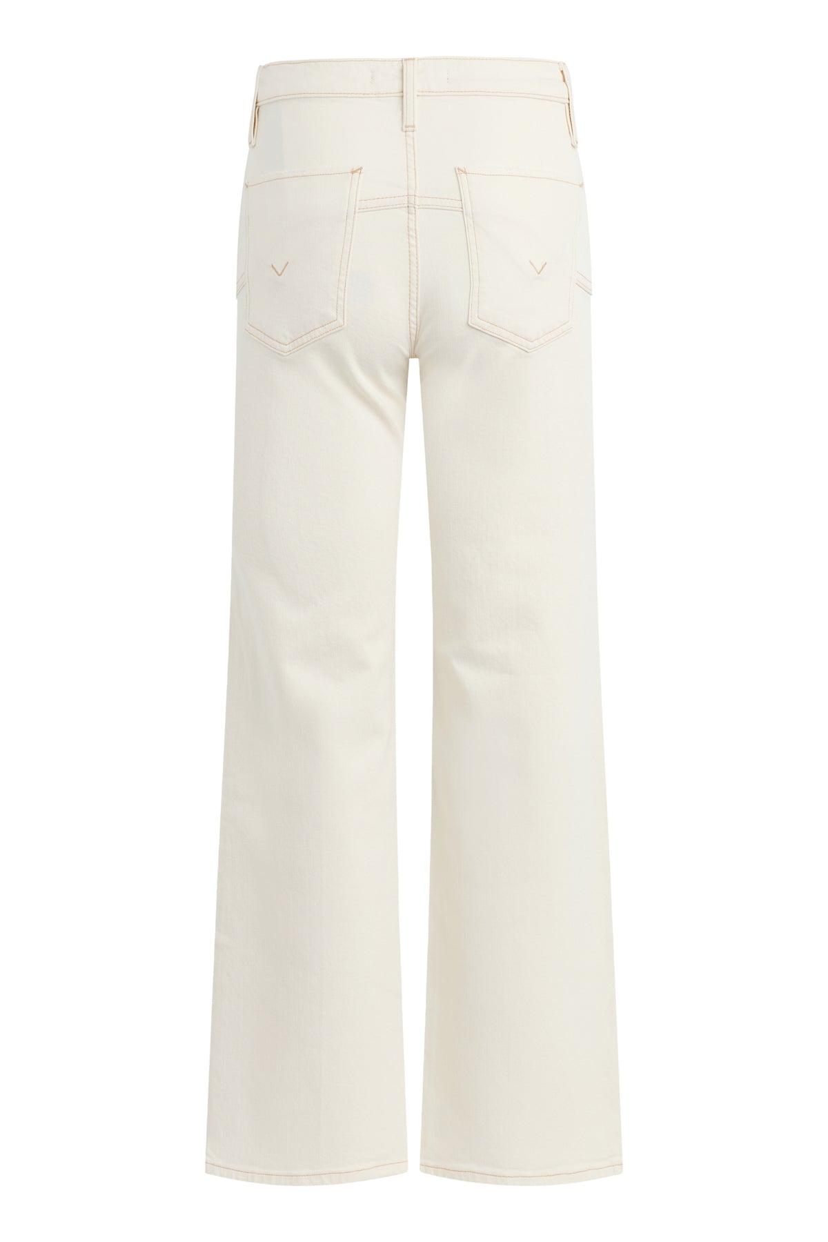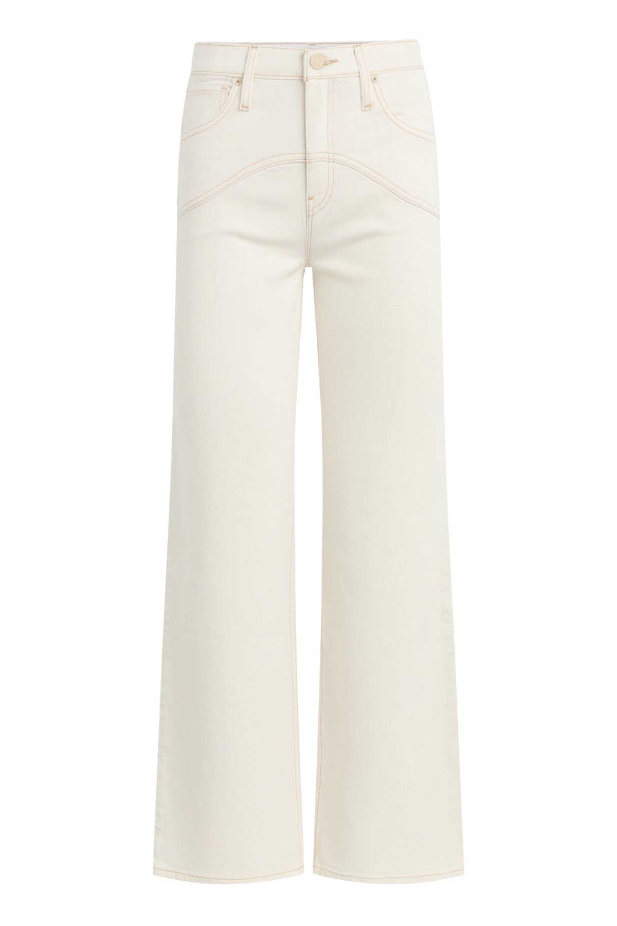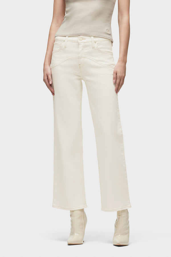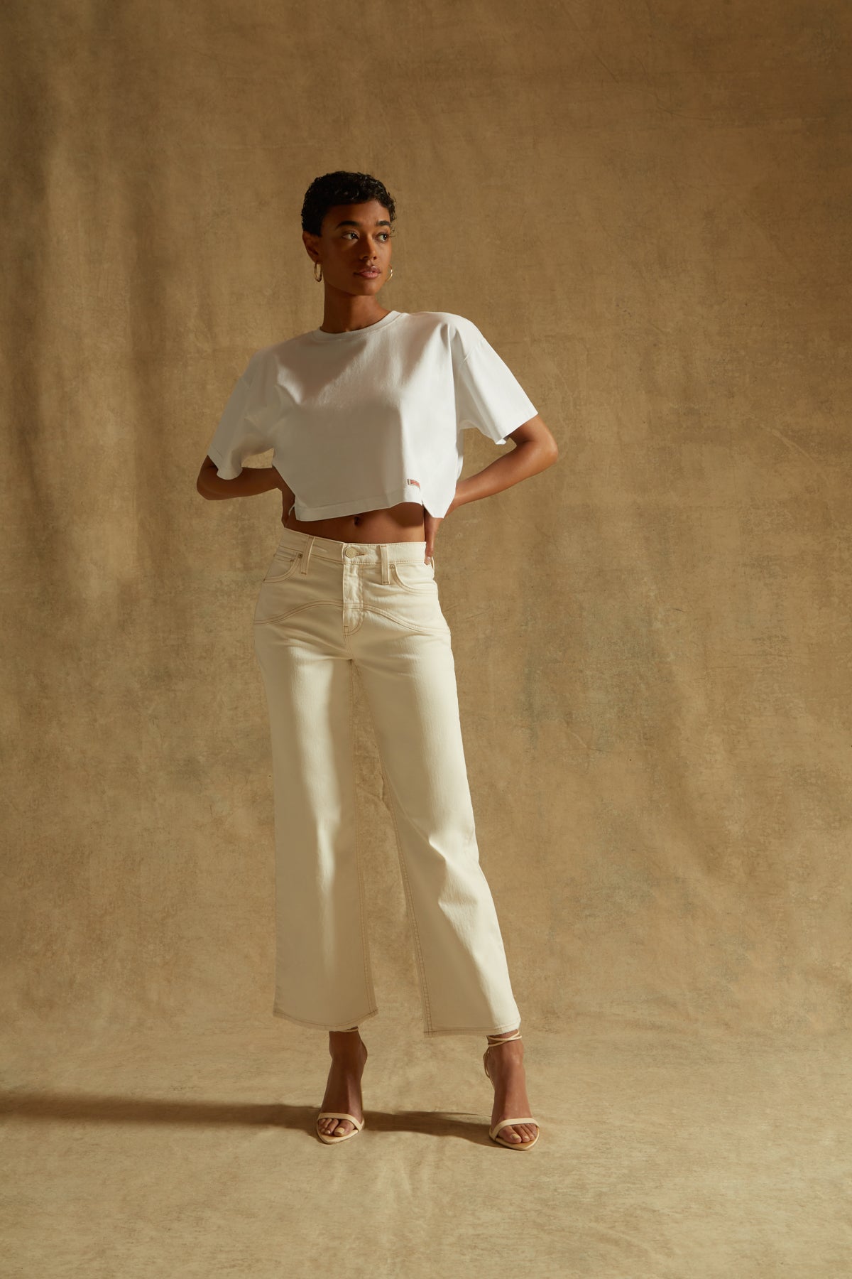 Re-up with our Rosie High-Rise Front Yoke Wide Leg Ankle Jean, cut with an elevated waistline and ankle-length, roomy leg. Crafted from premium comfort stretch denim in overdyed Ecru with front and back yoke detailing, subtle contrast topstitching and a raw hem. -