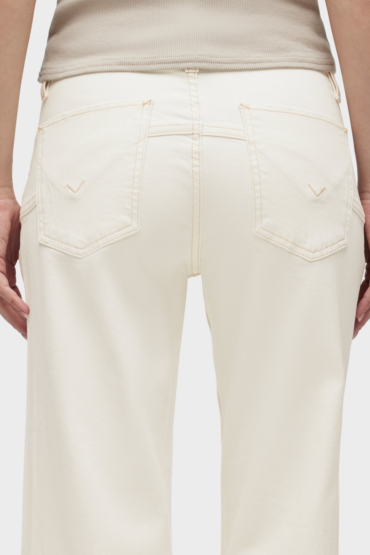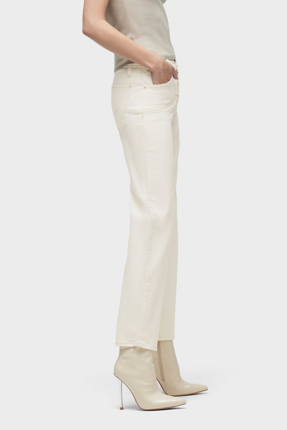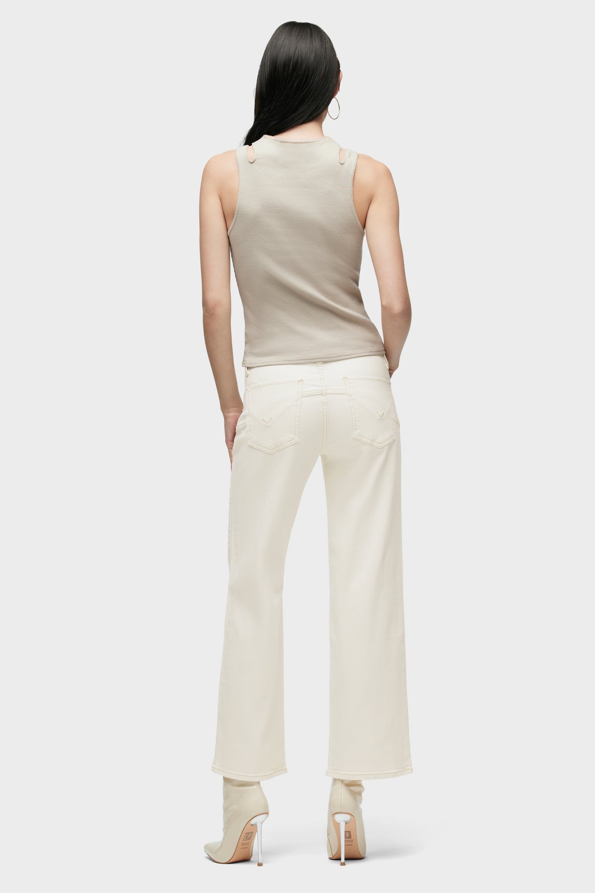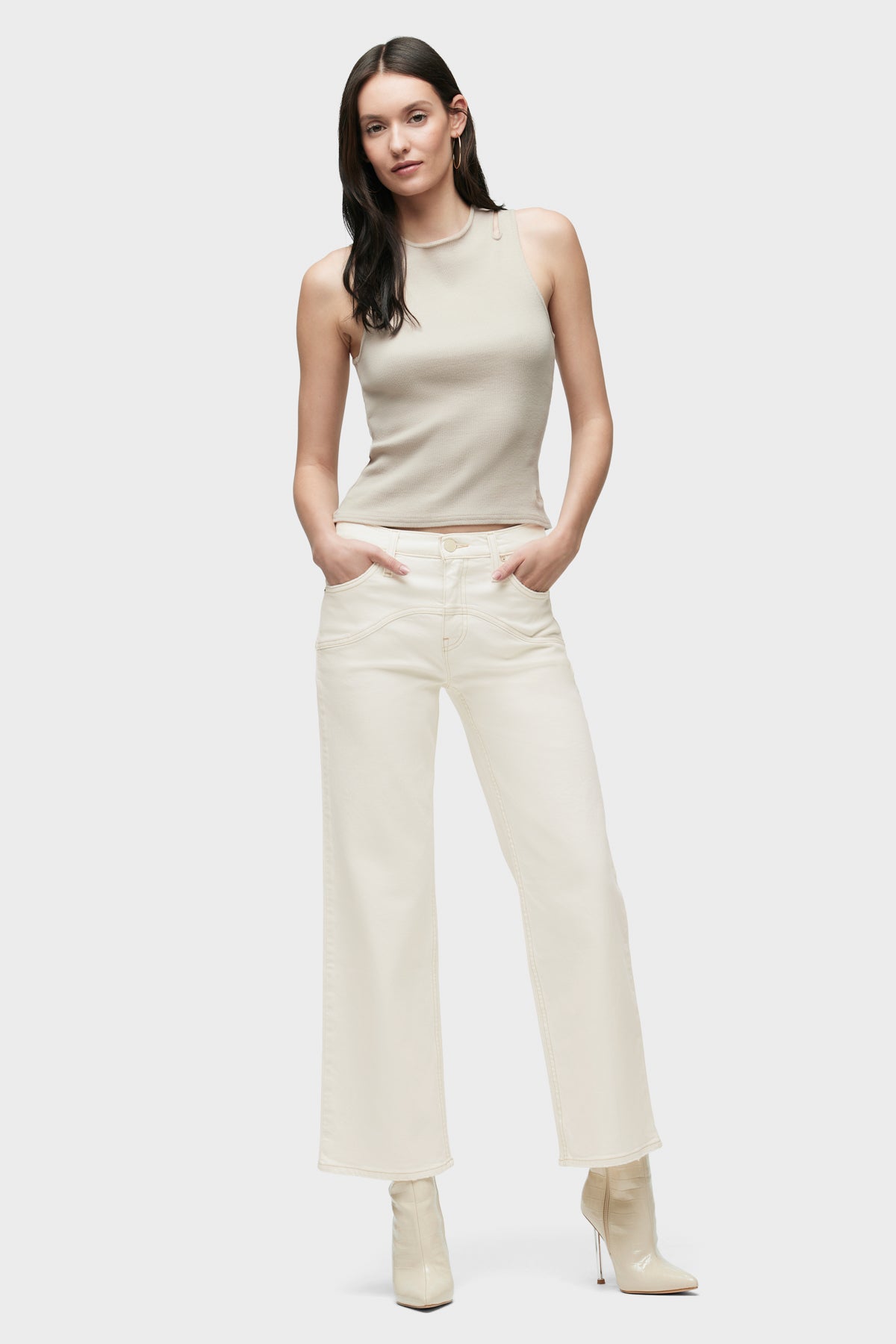 Re-up with our Rosie High-Rise Front Yoke Wide Leg Ankle Jean, cut with an elevated waistline and ankle-length, roomy leg. Crafted from premium comfort stretch denim in overdyed Ecru with front and back yoke detailing, subtle contrast topstitching and a raw hem. -