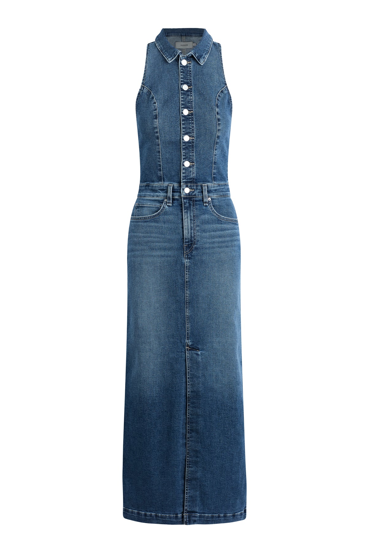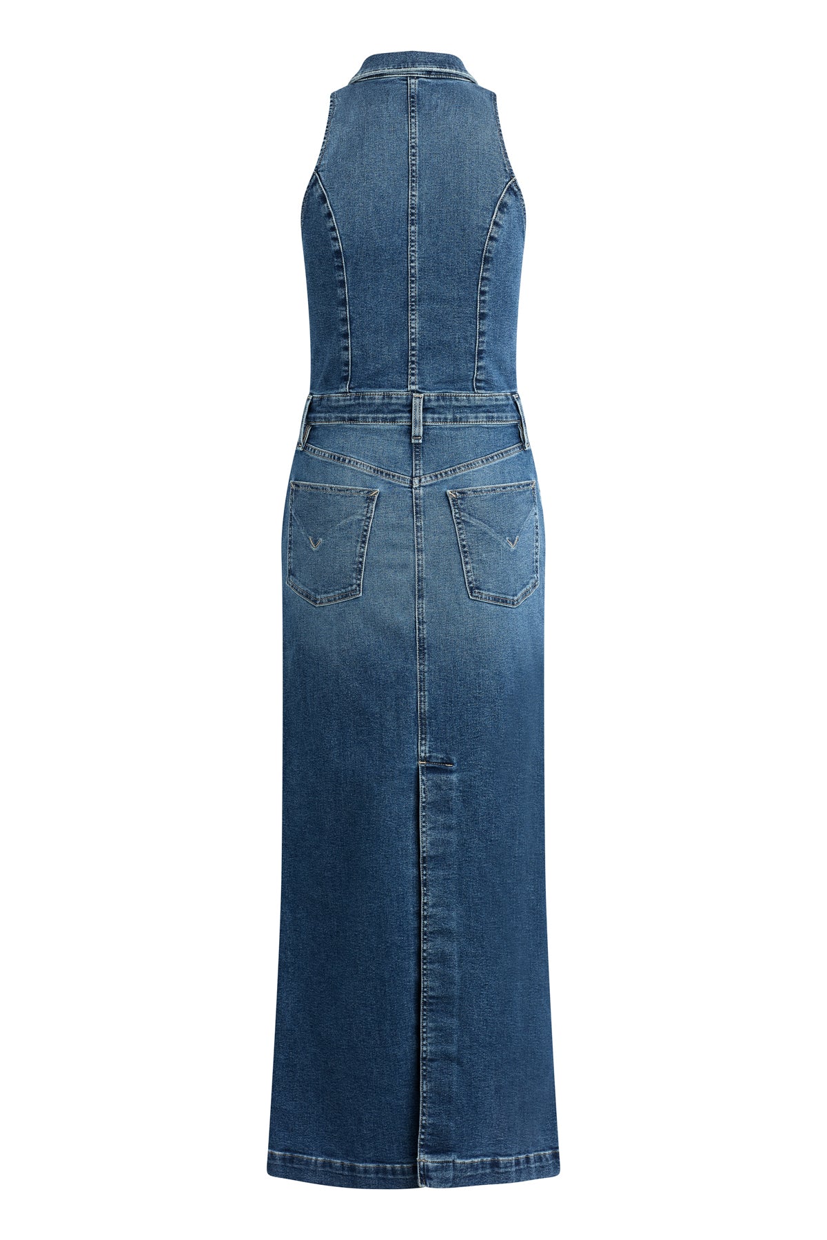Our signature halter styling, now in a new maxi-length dress. The Halter Maxi Dress in medium-blue Riches features a pointed collar, button placket, five-pocket details, subtle edge grinding, and slits in the front and back. -