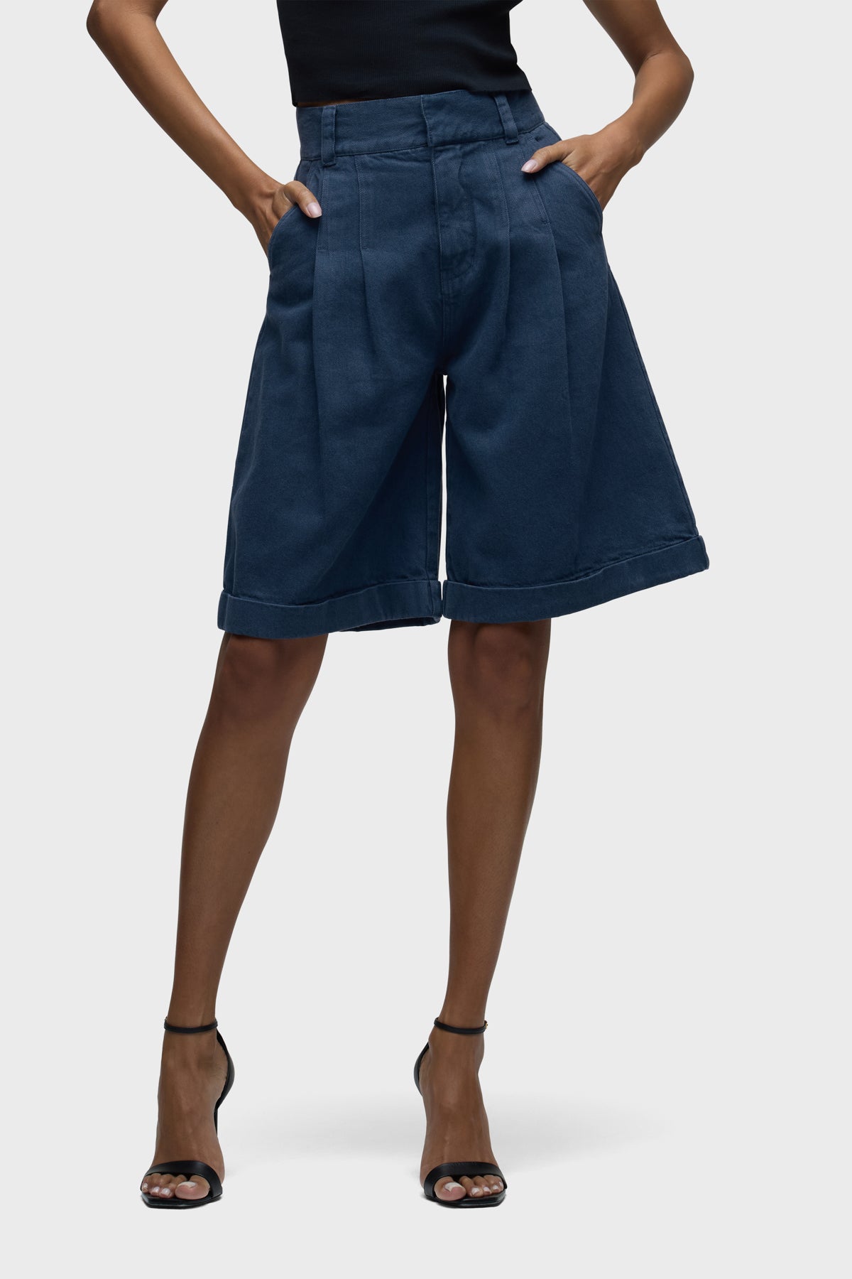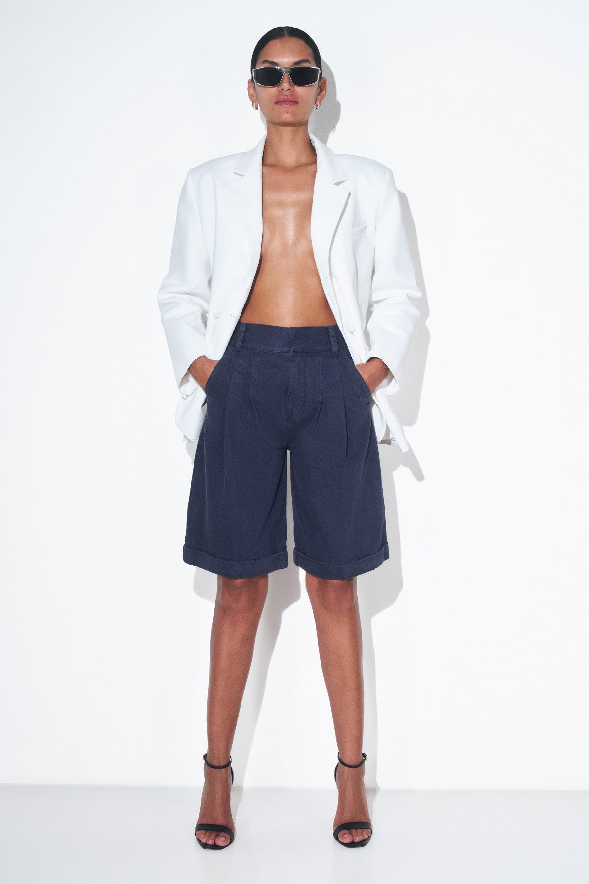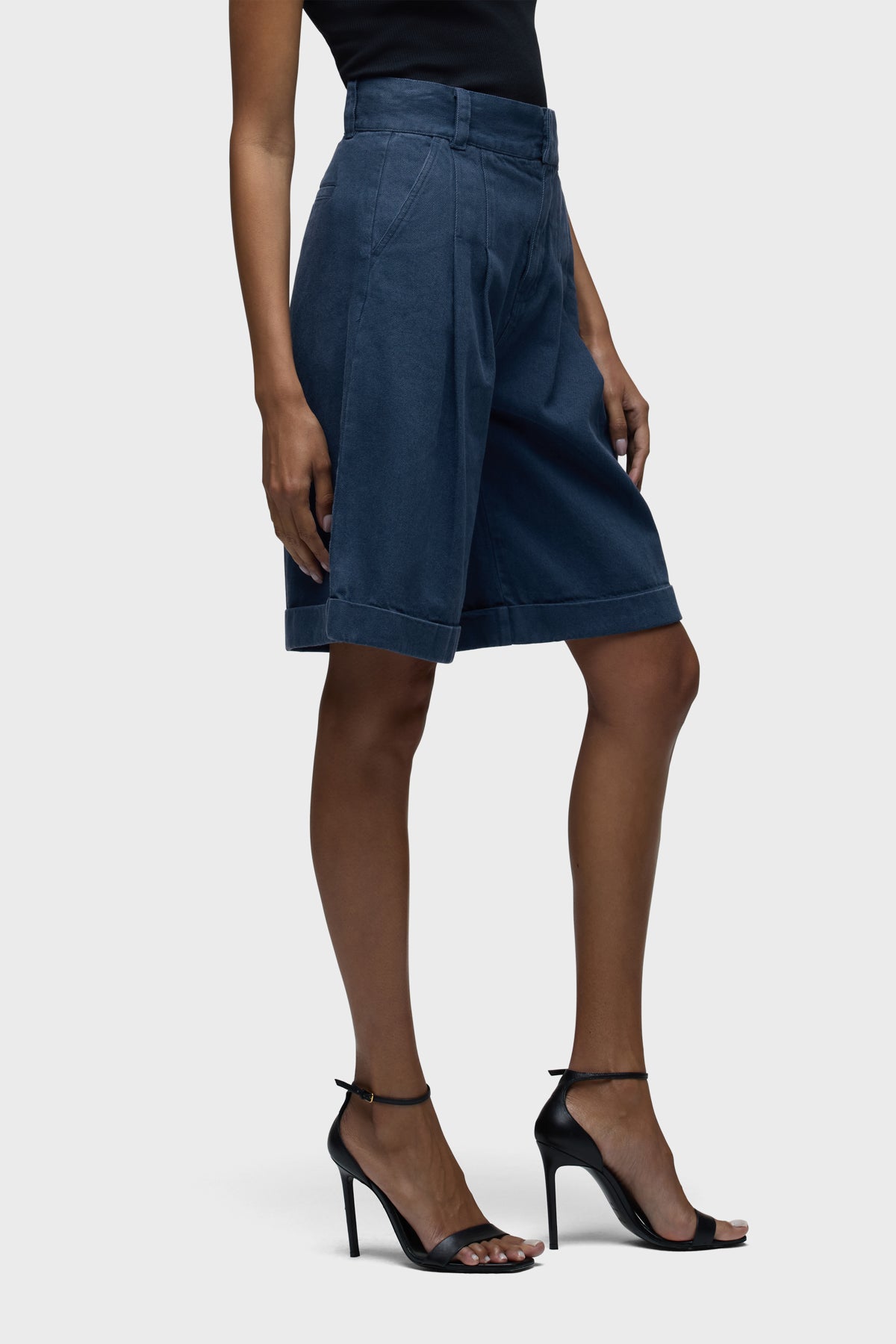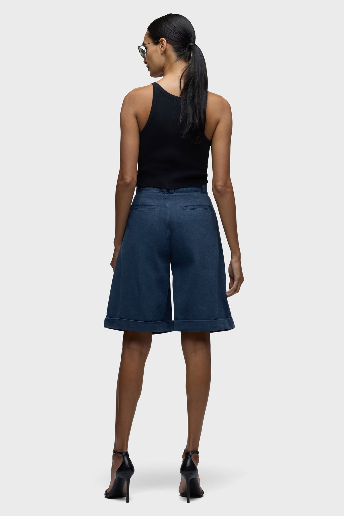 Part of our Brooks Nader collab capsule, the Brooks Bermuda Short in Moonlit Ocean is fitted at the waist with a wider leg opening and a cuffed hem. It also features trouser pockets, pleats at front and a hook-and-bar closure. This pair is cut from an overdyed deep blue linen fabric, made to be reminiscent of denim. This capsule was curated by model Brooks Nader and features her personal closet must-haves. -