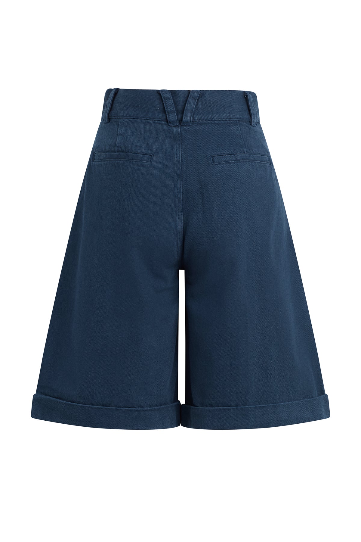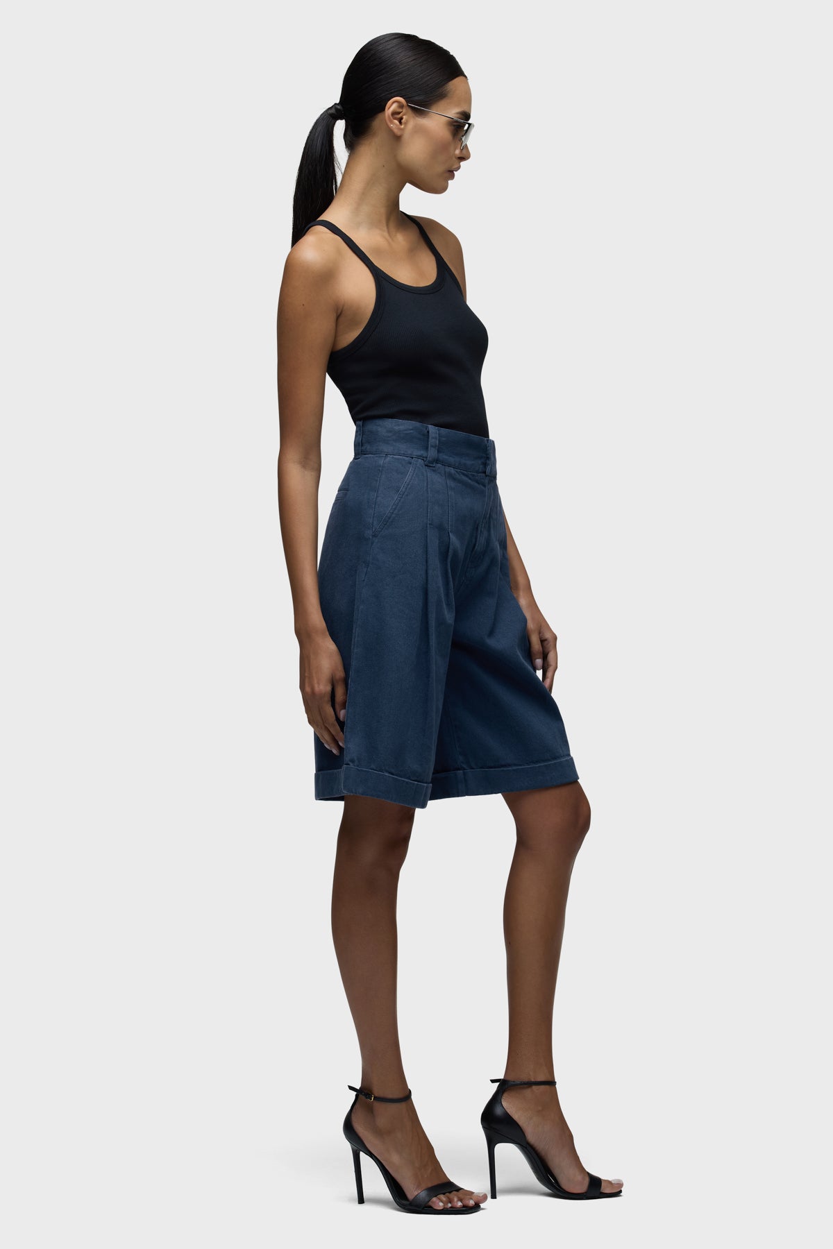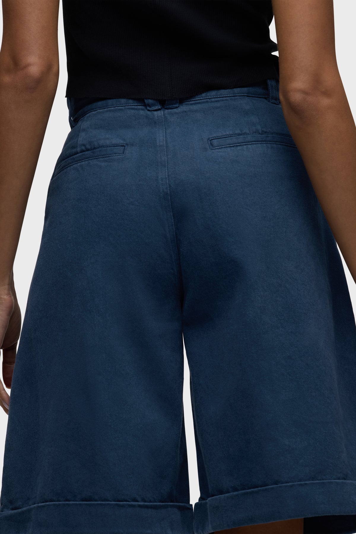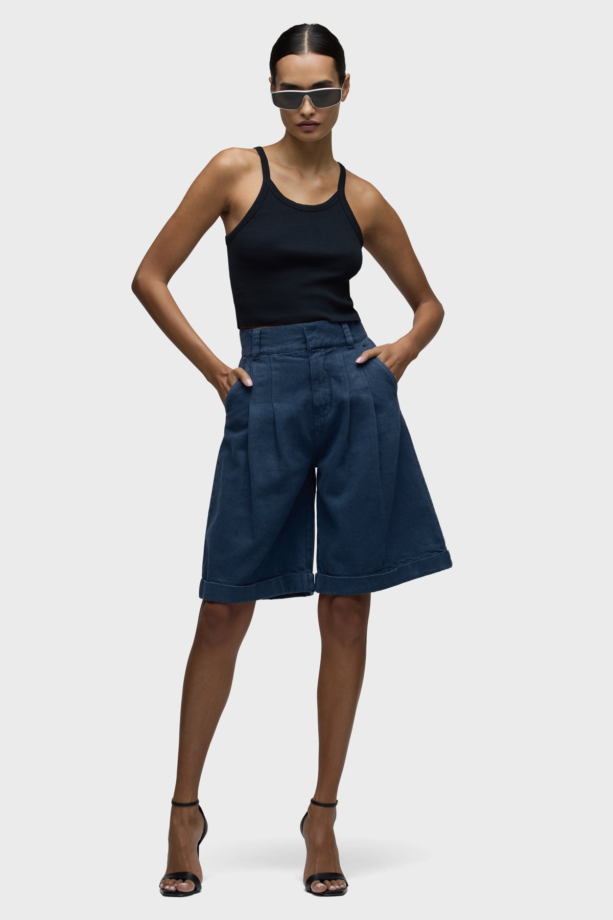 Part of our Brooks Nader collab capsule, the Brooks Bermuda Short in Moonlit Ocean is fitted at the waist with a wider leg opening and a cuffed hem. It also features trouser pockets, pleats at front and a hook-and-bar closure. This pair is cut from an overdyed deep blue linen fabric, made to be reminiscent of denim. This capsule was curated by model Brooks Nader and features her personal closet must-haves. -