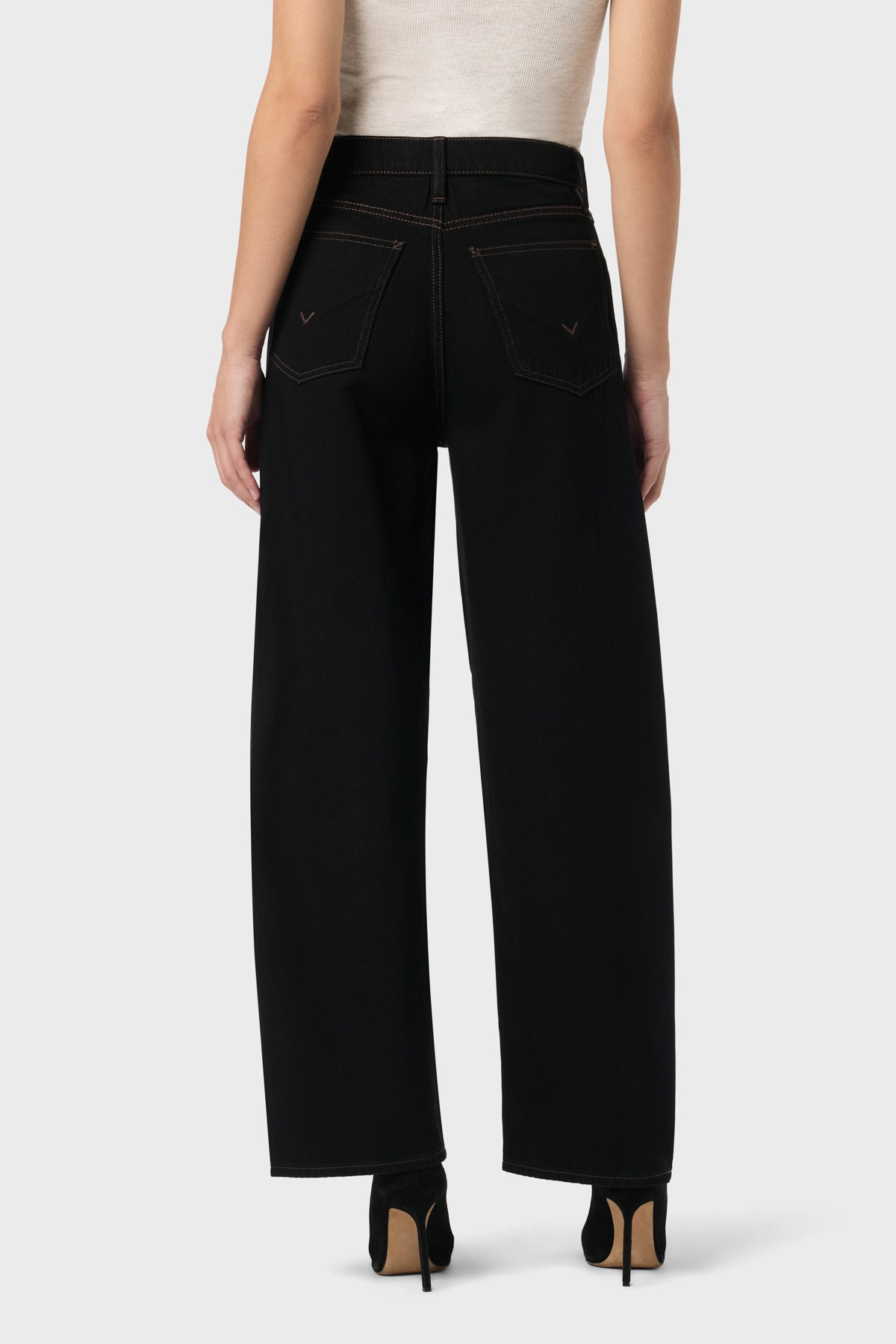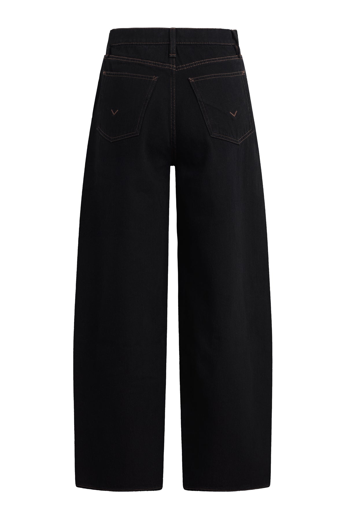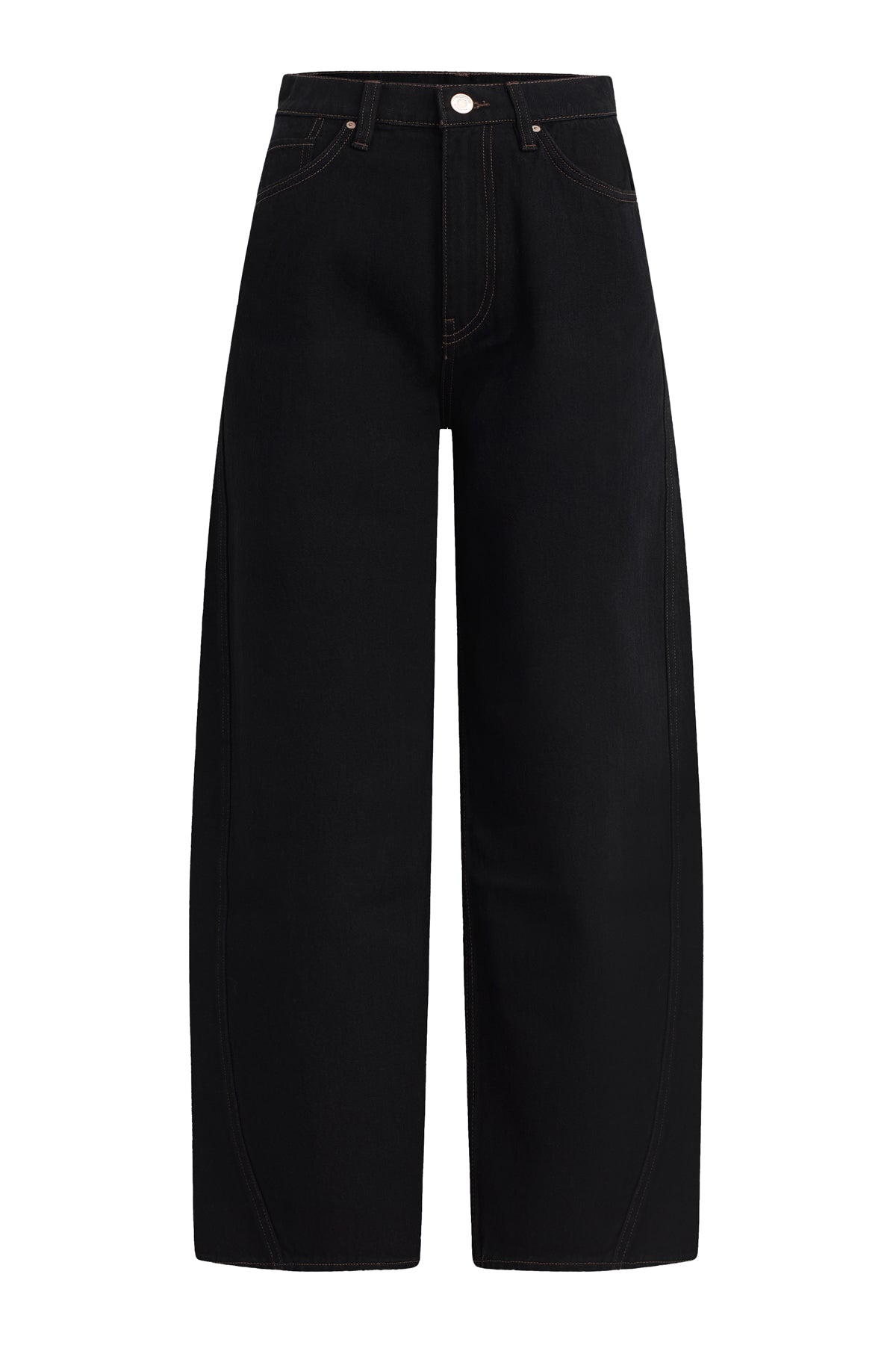 Our Bailey Relaxed Barrel Jean in White is an on-trend, fashion-forward fit that features a rounded outseam to accentuate its barrel look. This relaxed jean has a 30" inseam with a raw hem, and it is made of black rigid denim. -