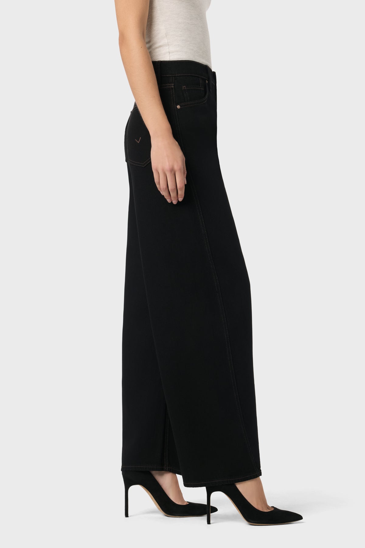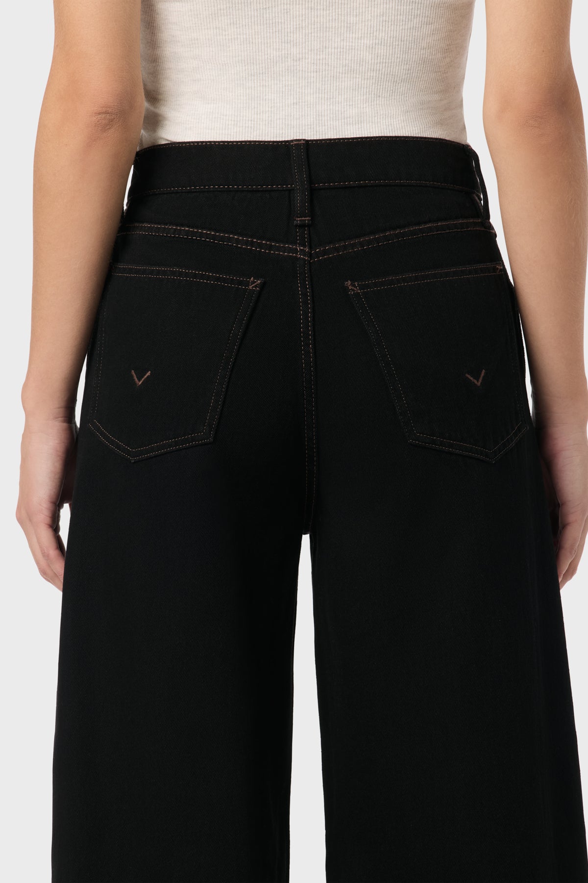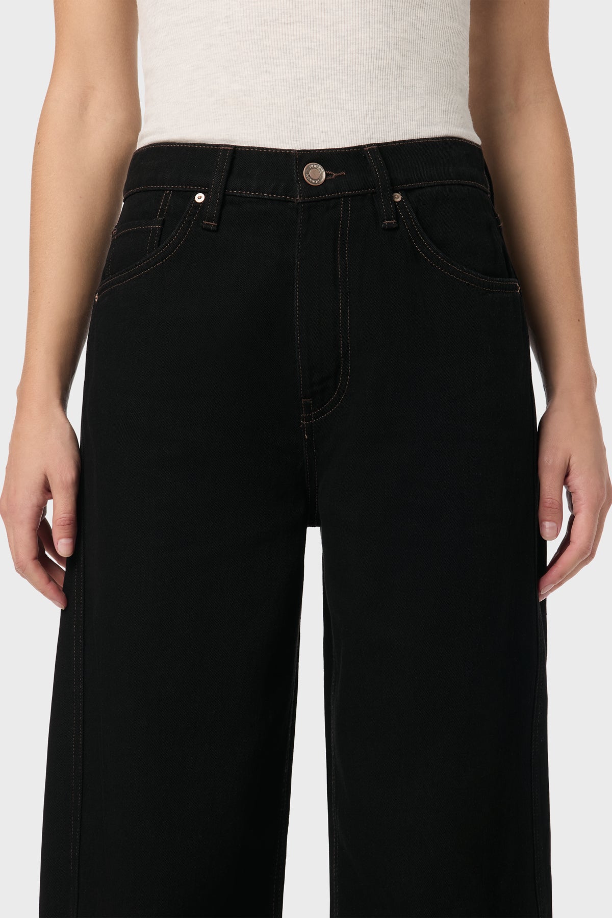 Our Bailey Relaxed Barrel Jean in White is an on-trend, fashion-forward fit that features a rounded outseam to accentuate its barrel look. This relaxed jean has a 30" inseam with a raw hem, and it is made of black rigid denim. -