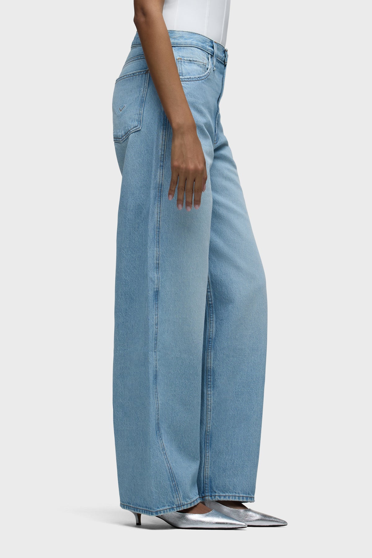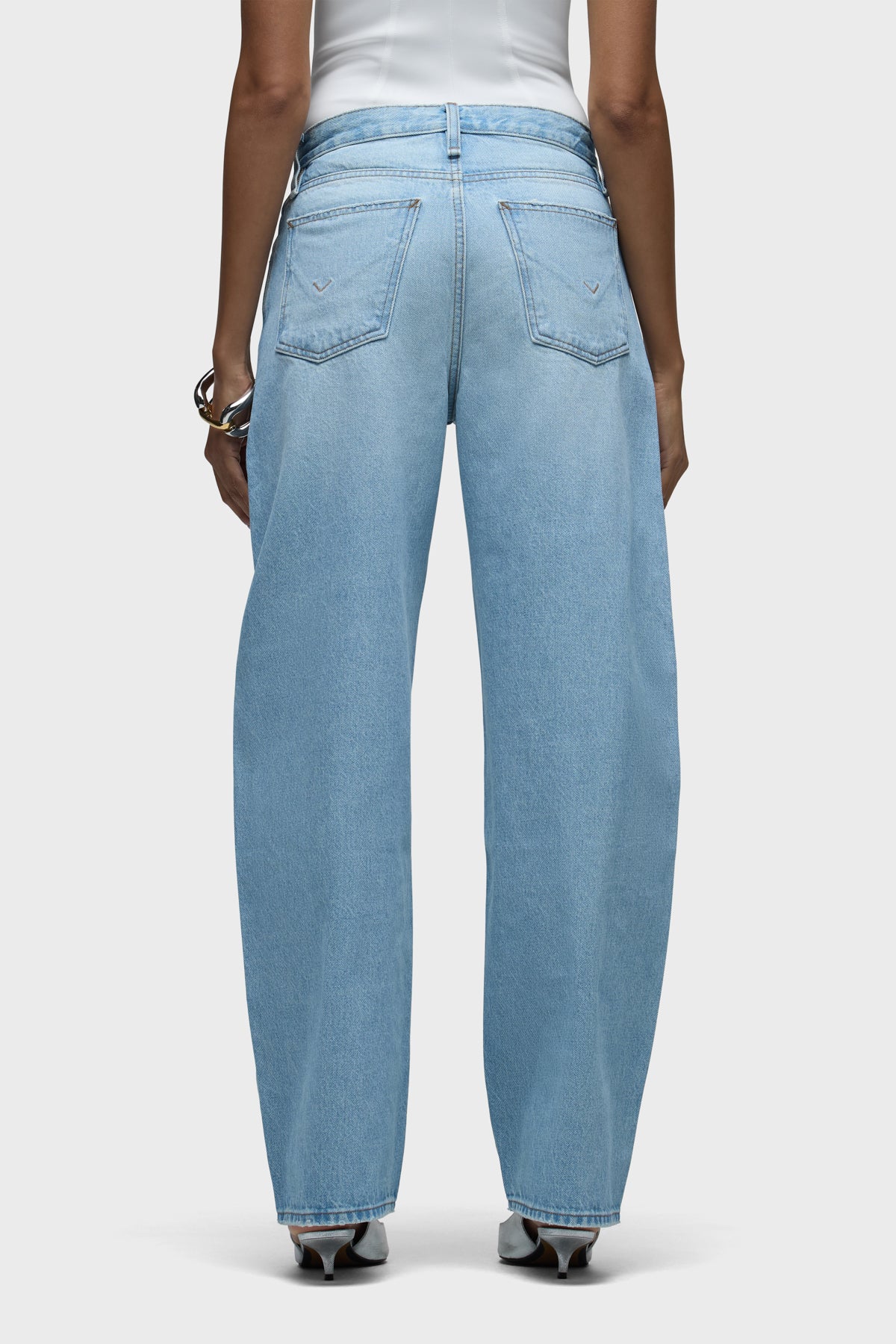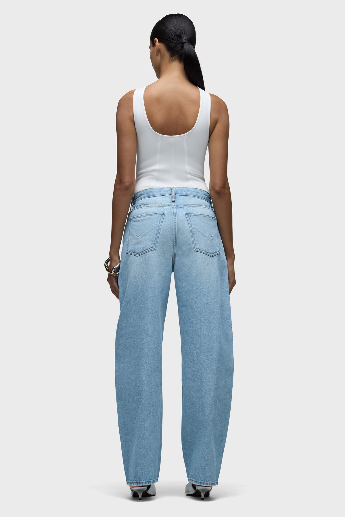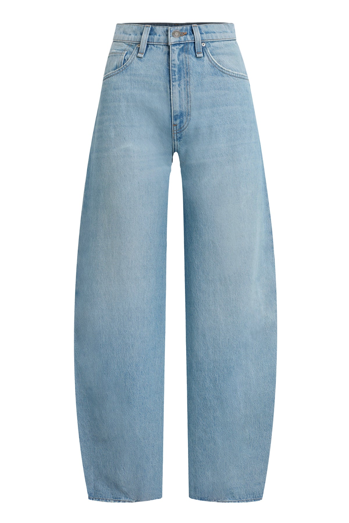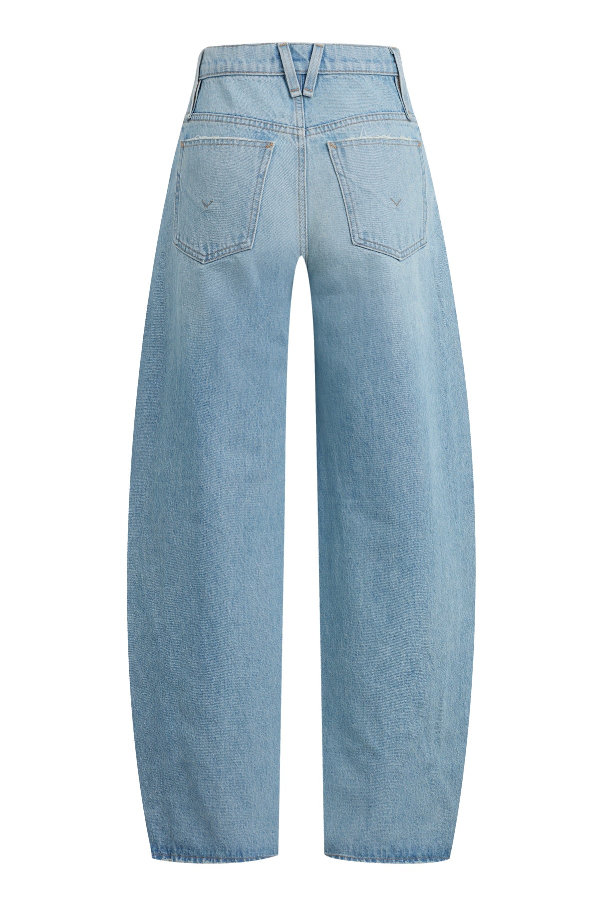 Our Bailey Relaxed Barrel Jean in Fighter is an on-trend, fashion-forward fit that features a rounded outseam to accentuate its "barrel" look. This relaxed jean has a 30" inseam with a finished hem. It features a light indigo wash with heavy stone washing, bleaching, whiskering and edge grinding. -