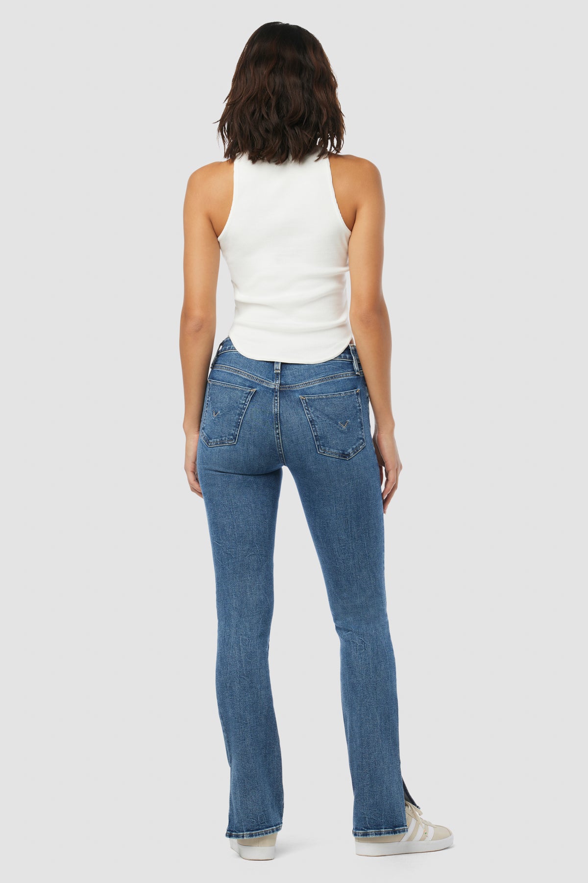 Streamlined and flattering, our Barbara High-Rise Baby Bootcut Jean w/ Slit Hem in medium dark Lottery is cut for a slim, contoured fit with an elevated waistline and a gently flared leg. Made from premium stretch denim, it’s finished with grinding along the edges and seam slit. -