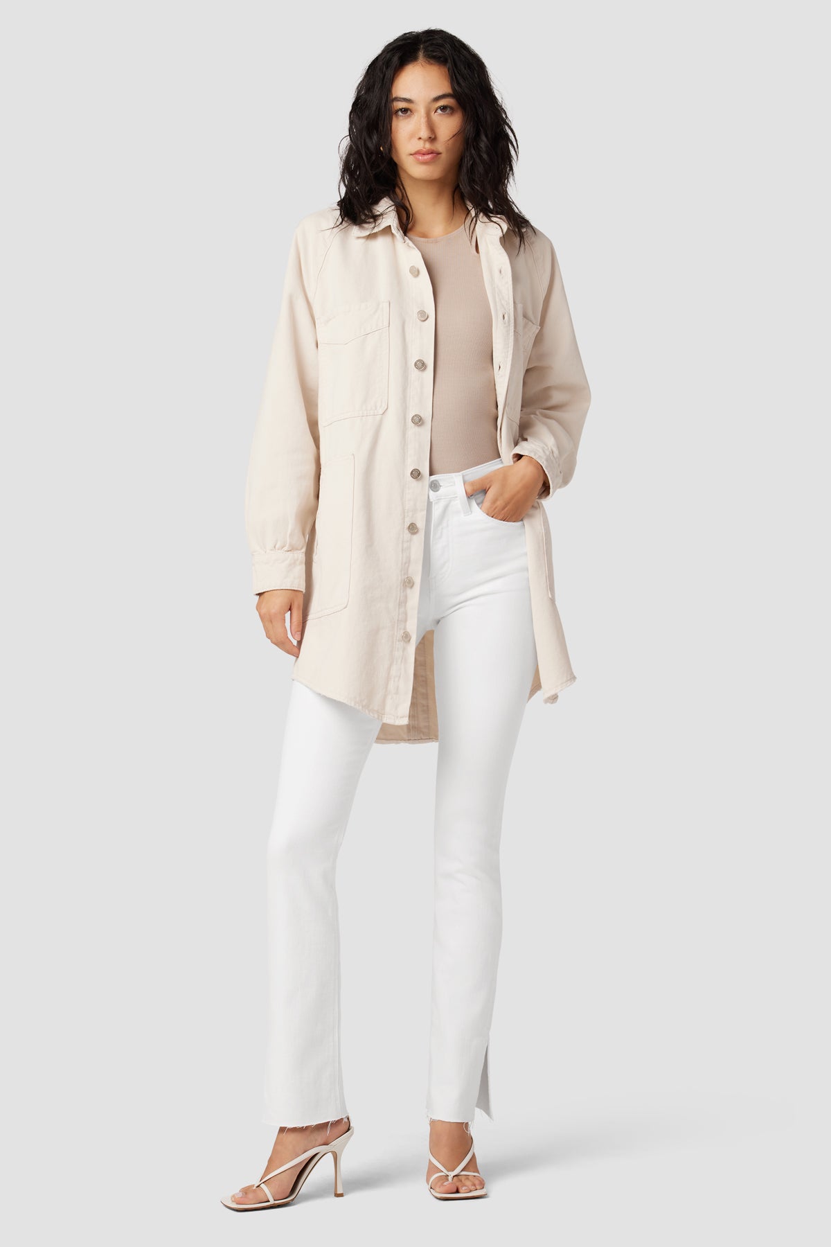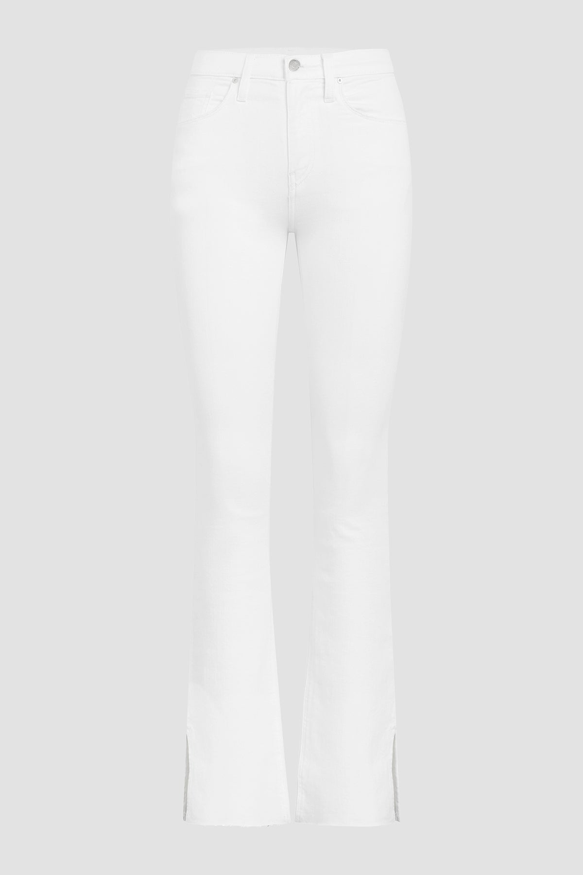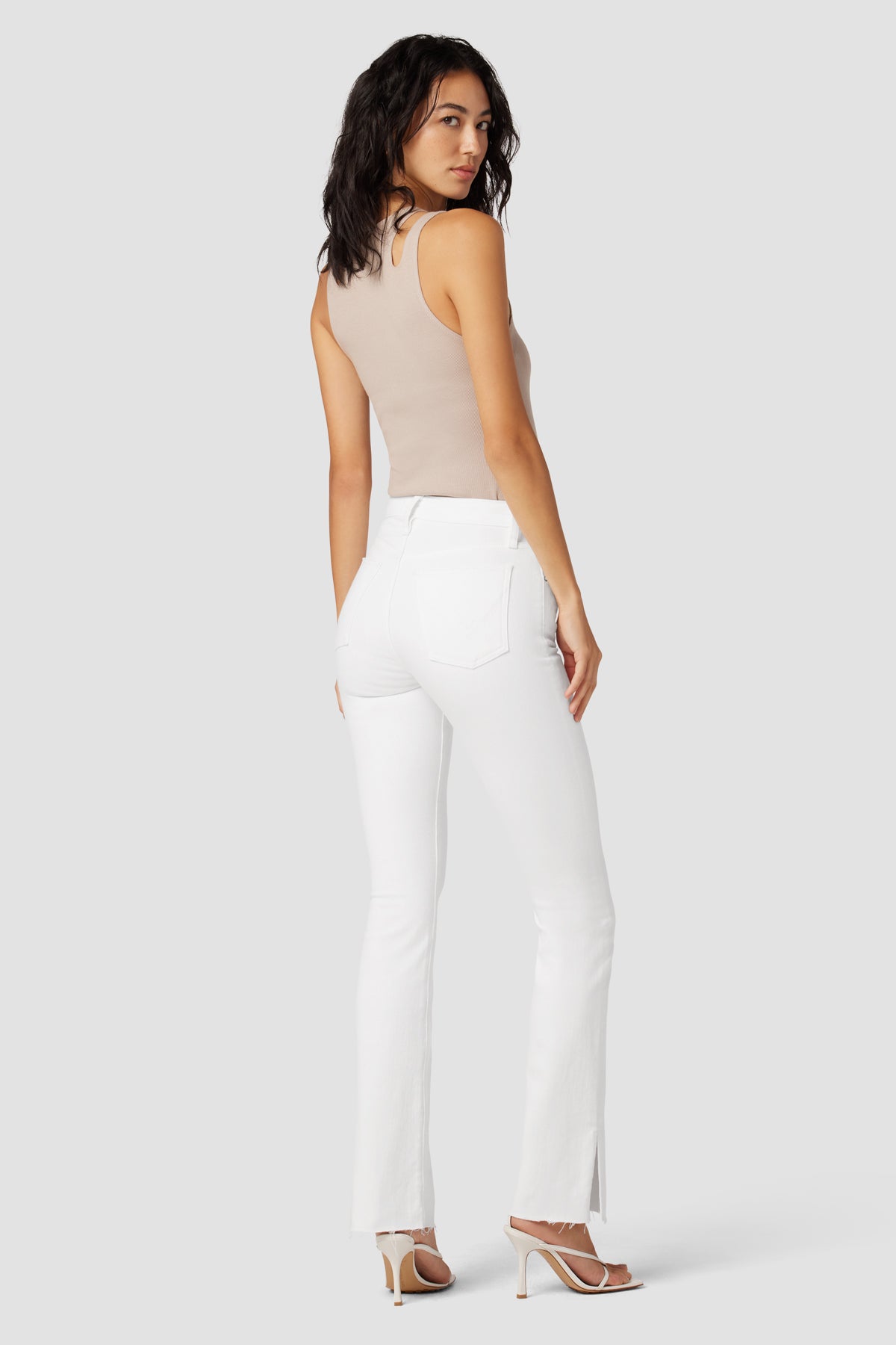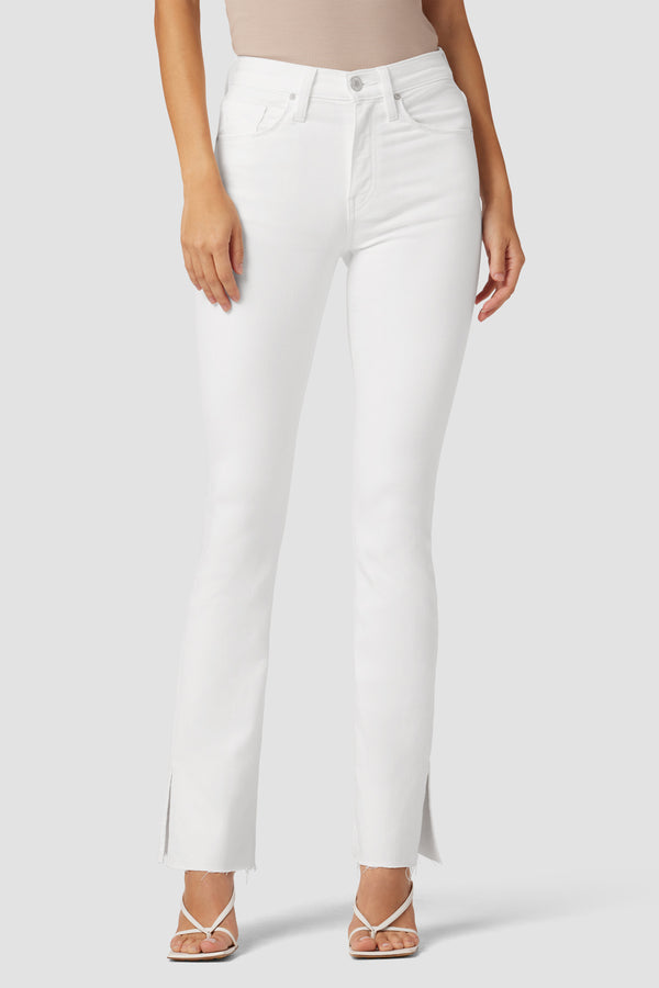 Streamlined and flattering, our Barbara High-Rise Baby Bootcut w/ Slit Jean in crisp White is cut for a slim, contoured fit from premium super stretch denim. Features an elevated waistline and a gently flared leg with a raw hem and inseam slit. -