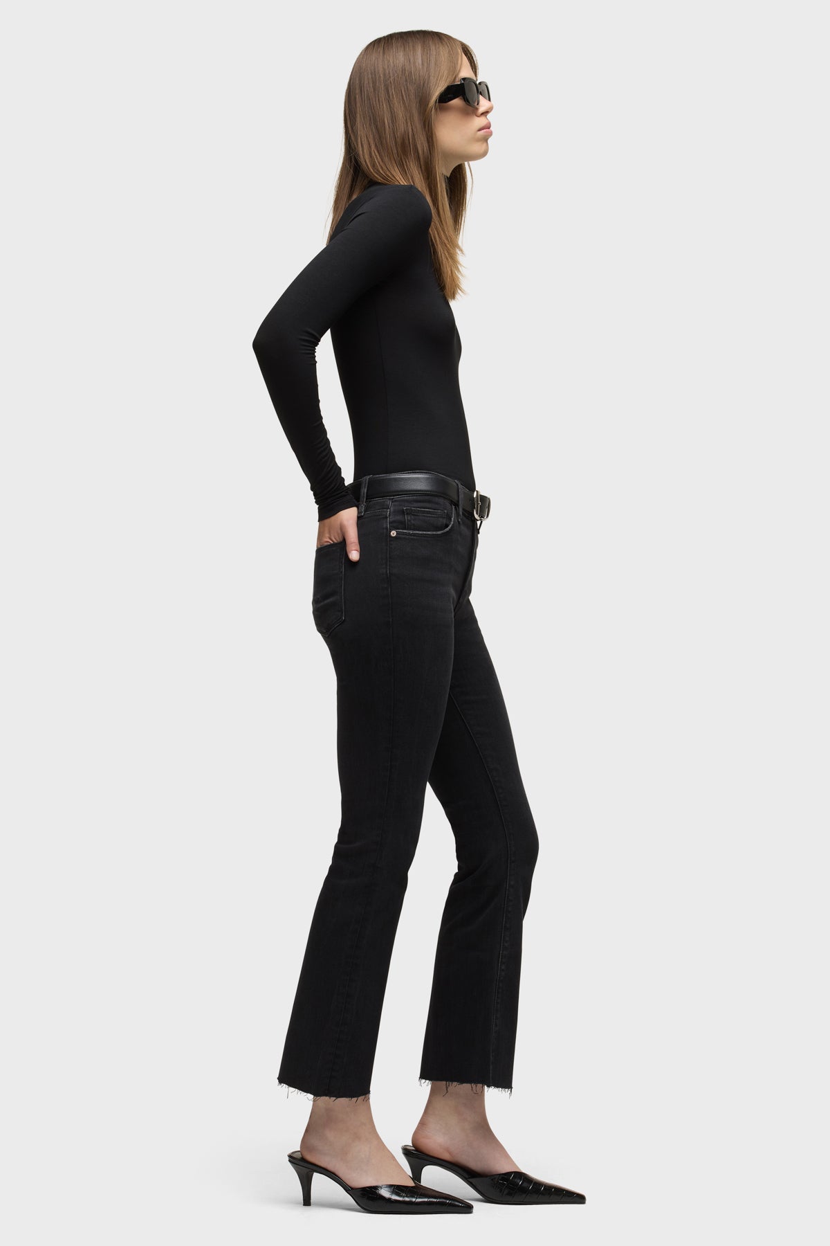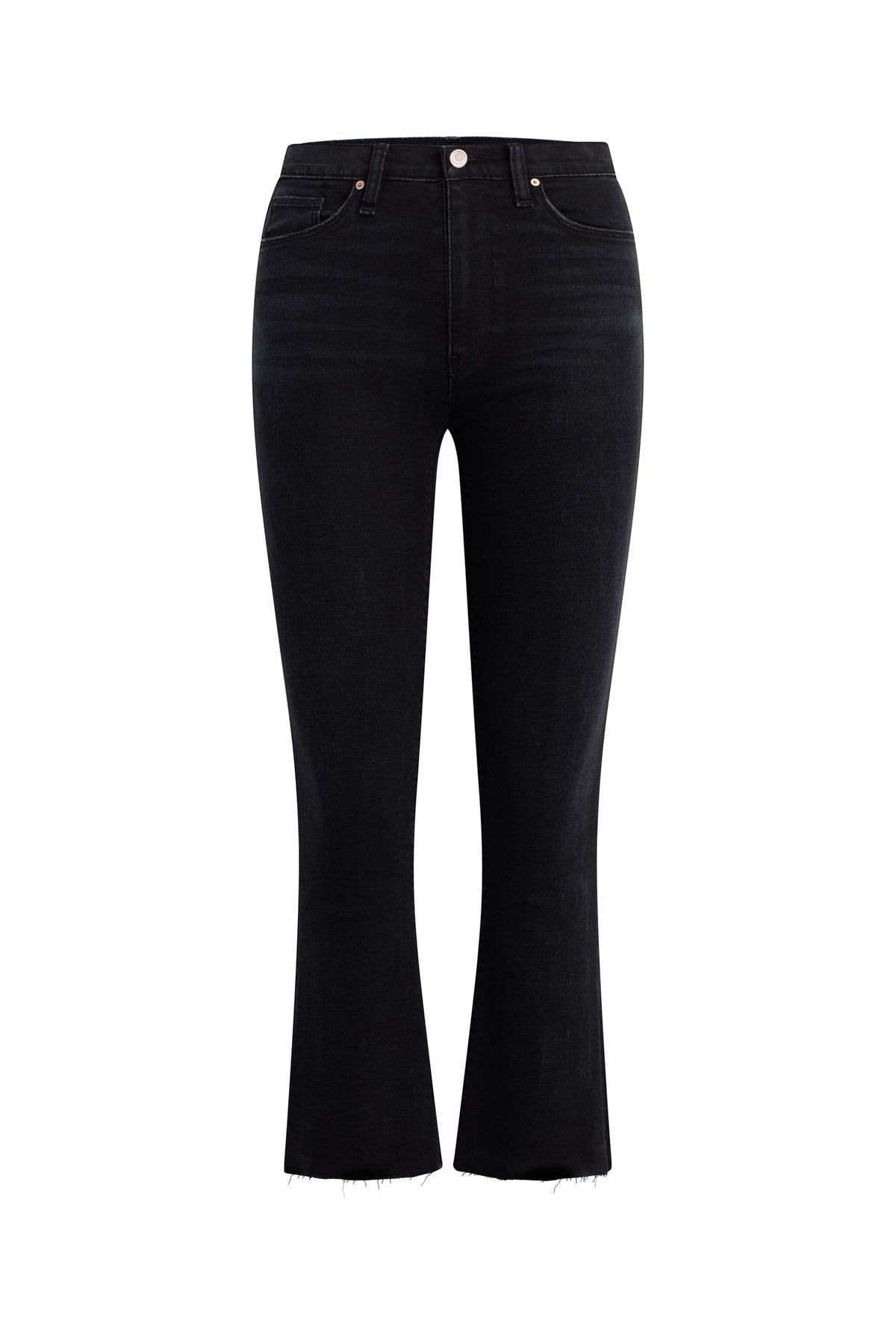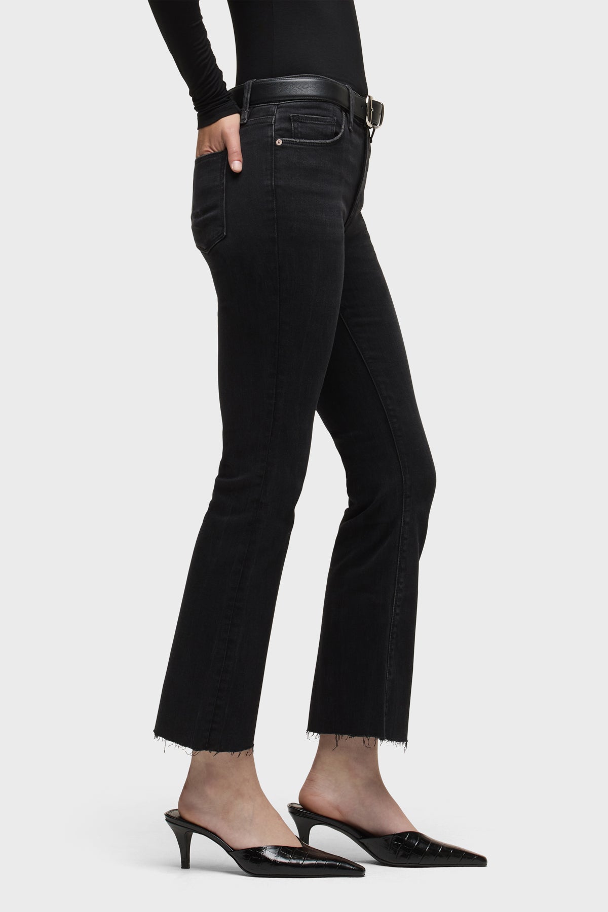 Streamlined and flattering, our Barbara High-Rise Bootcut Crop Jean in Dark Raven is cut from black stretch denim for a slim, contoured fit with an elevated waistline and a gently flared, cropped leg with a 27" inseam. It is finished with classic five-pocket styling and a raw hem. -