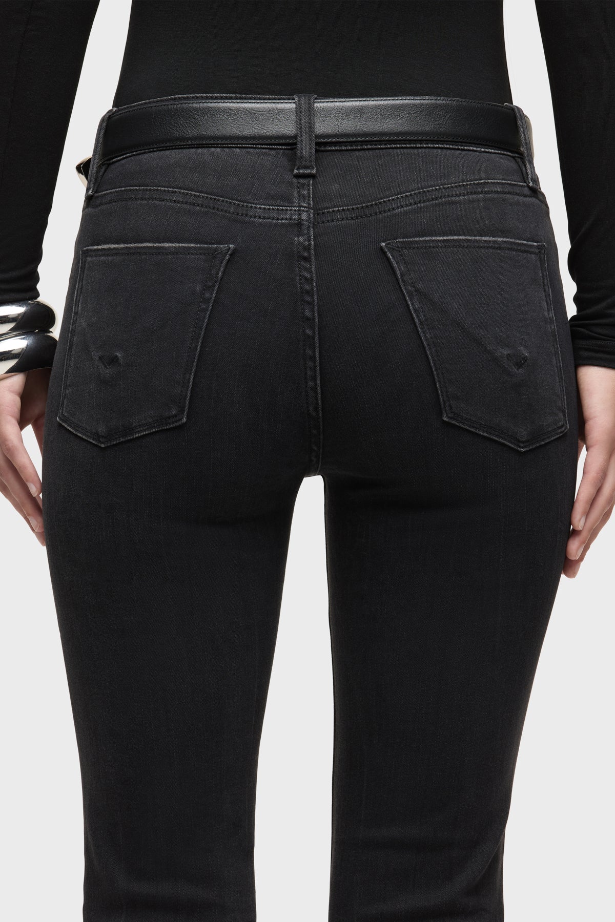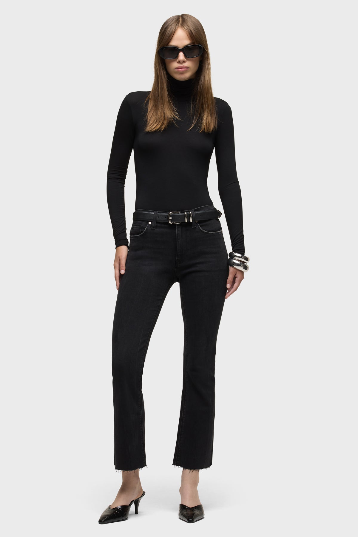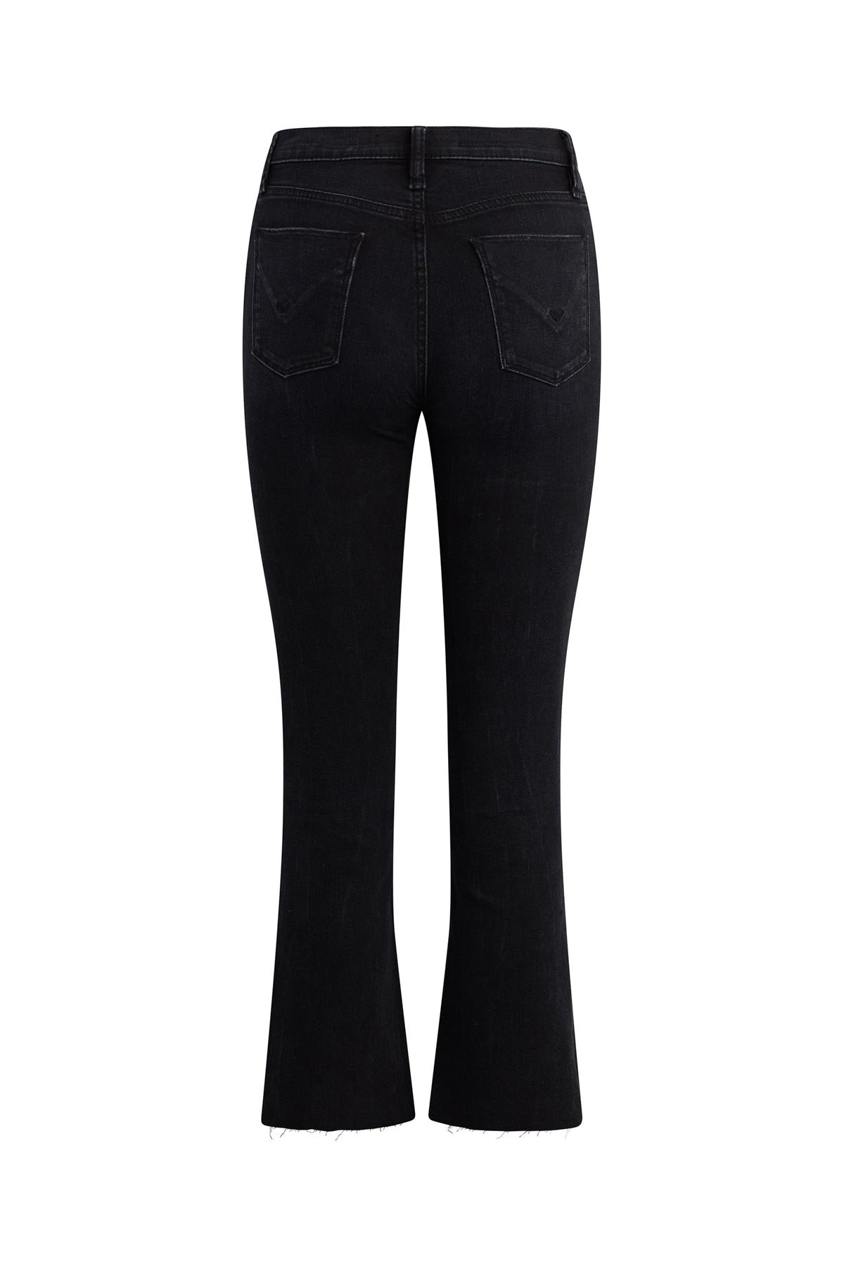 Streamlined and flattering, our Barbara High-Rise Bootcut Crop Jean in Dark Raven is cut from black stretch denim for a slim, contoured fit with an elevated waistline and a gently flared, cropped leg with a 27" inseam. It is finished with classic five-pocket styling and a raw hem. -