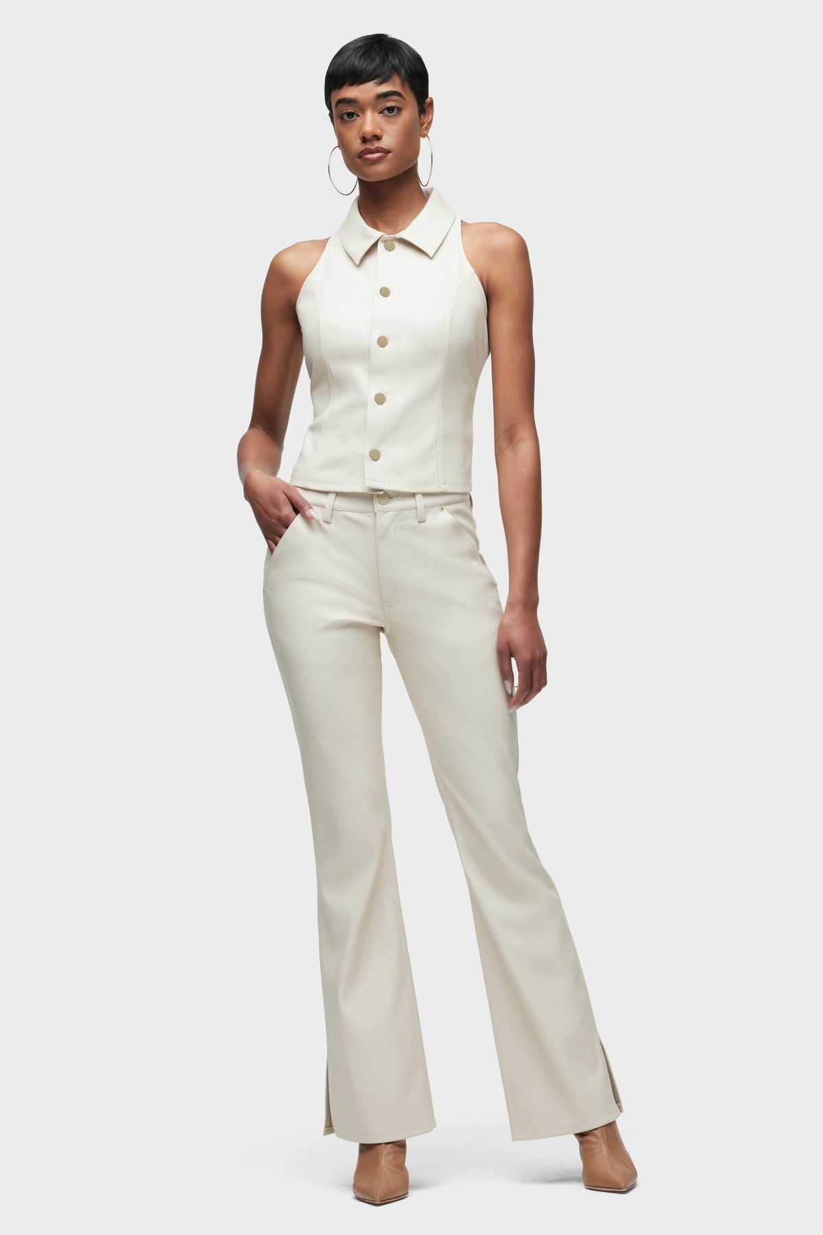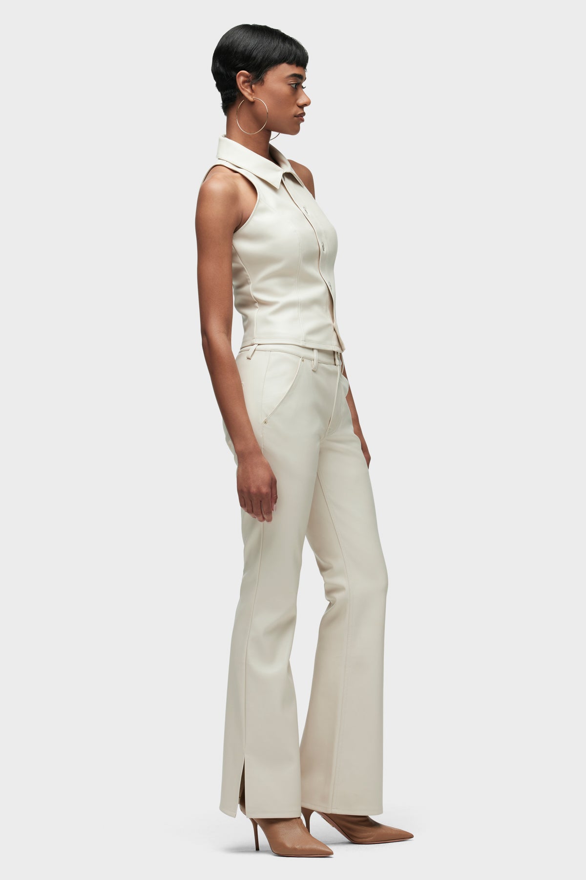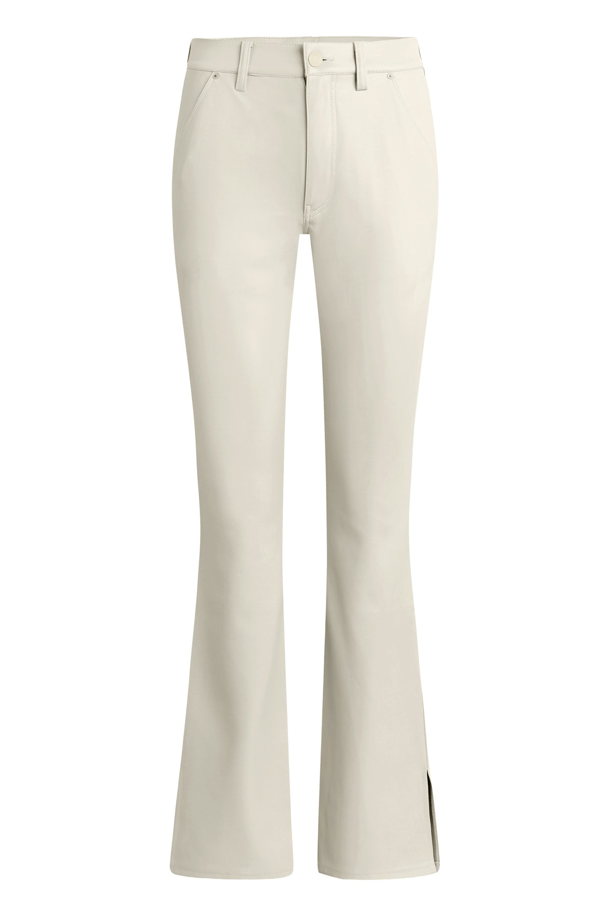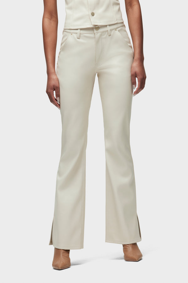 Streamlined and flattering, our Barbara High-Rise Bootcut Trouser in Creme is cut for a slim, contoured fit with an elevated waistline and a gently flared leg with outseam slits. It’s finished in Illusion vegan leather with a 32" inseam and trouser-pocket details. -