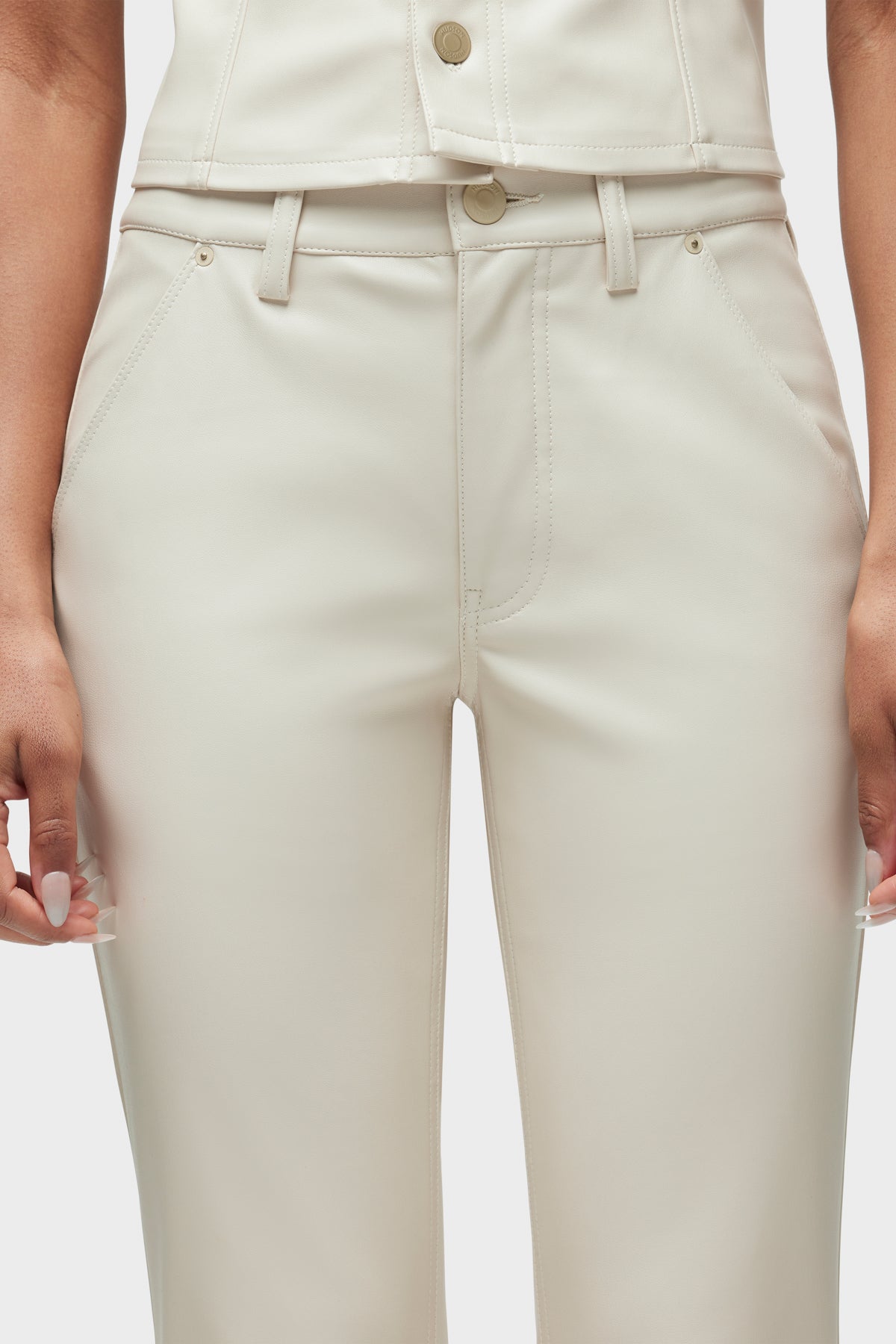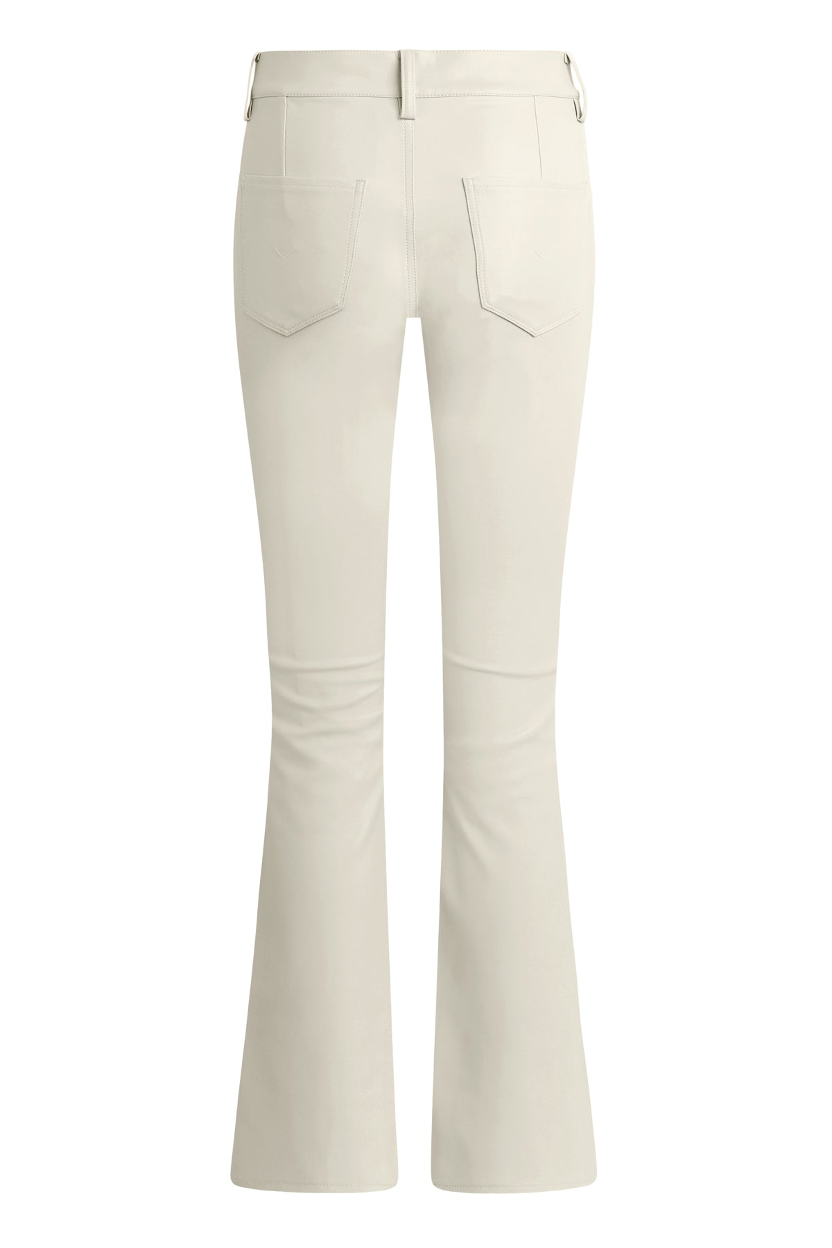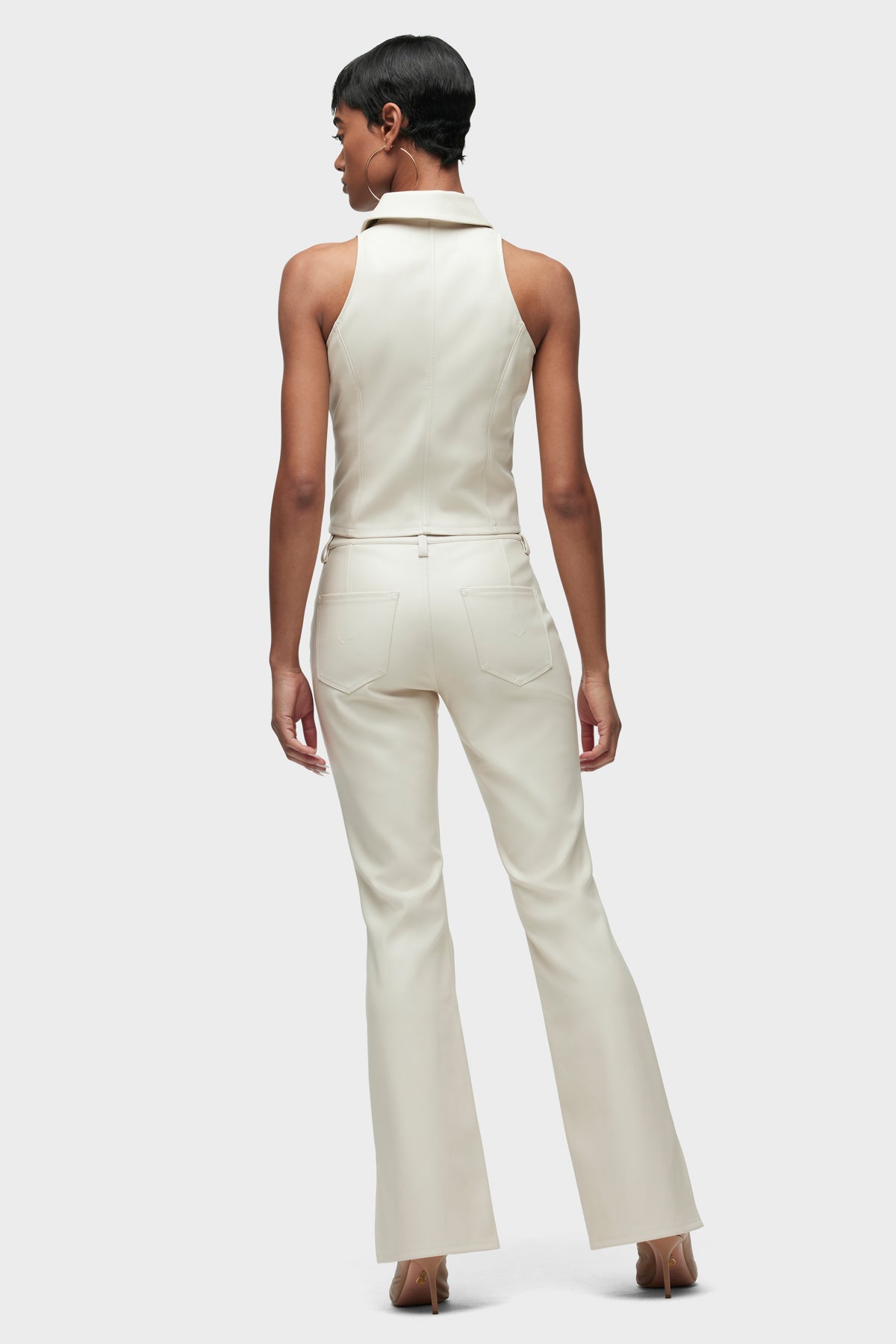 Streamlined and flattering, our Barbara High-Rise Bootcut Trouser in Creme is cut for a slim, contoured fit with an elevated waistline and a gently flared leg with outseam slits. It’s finished in Illusion vegan leather with a 32" inseam and trouser-pocket details. -