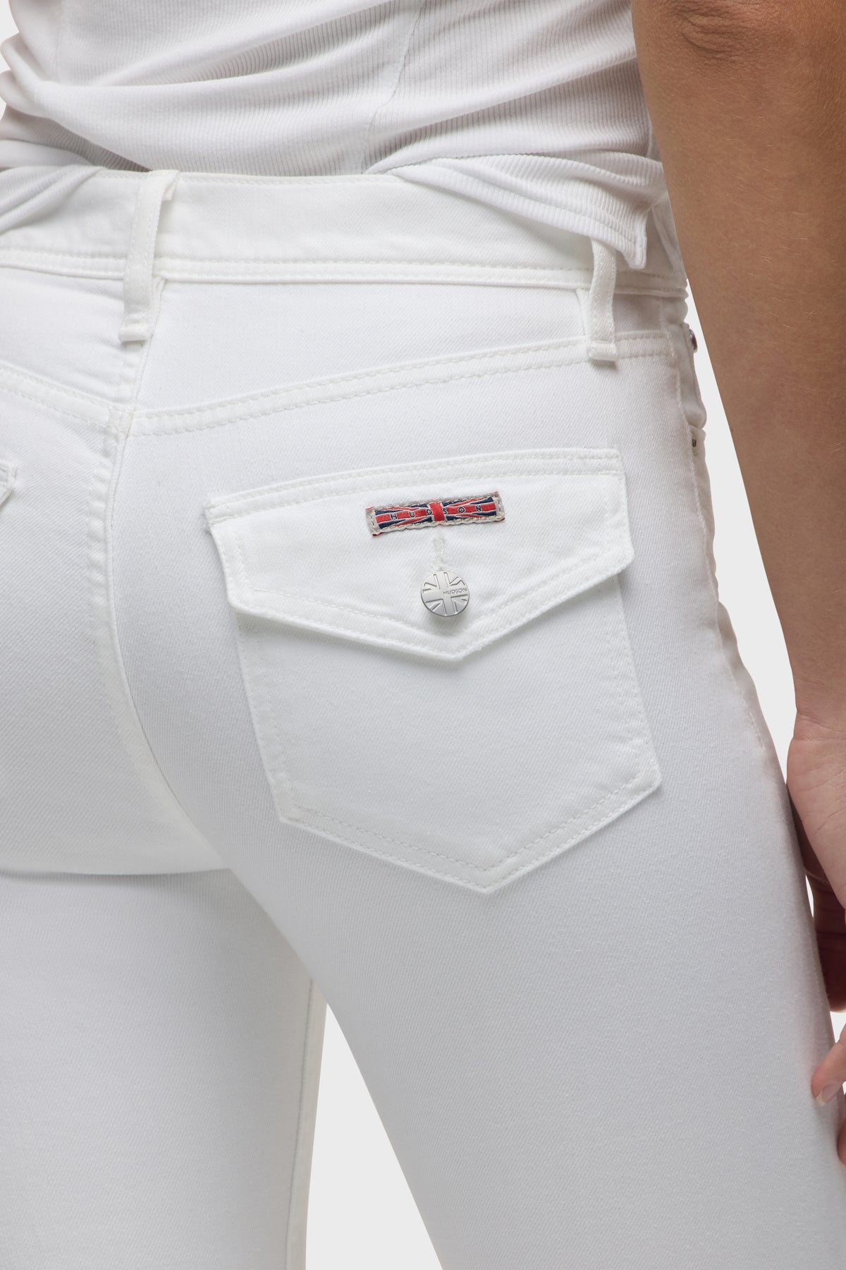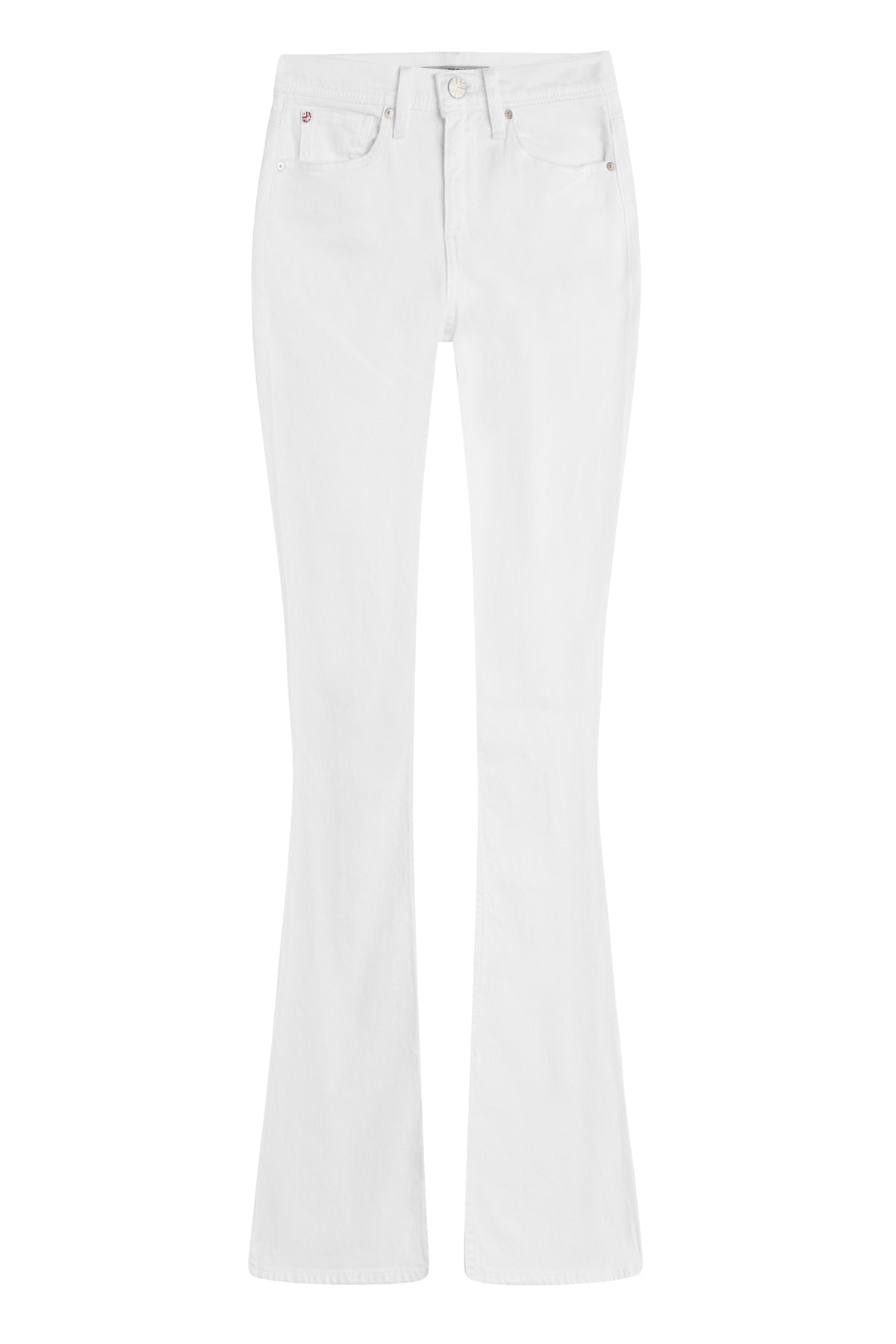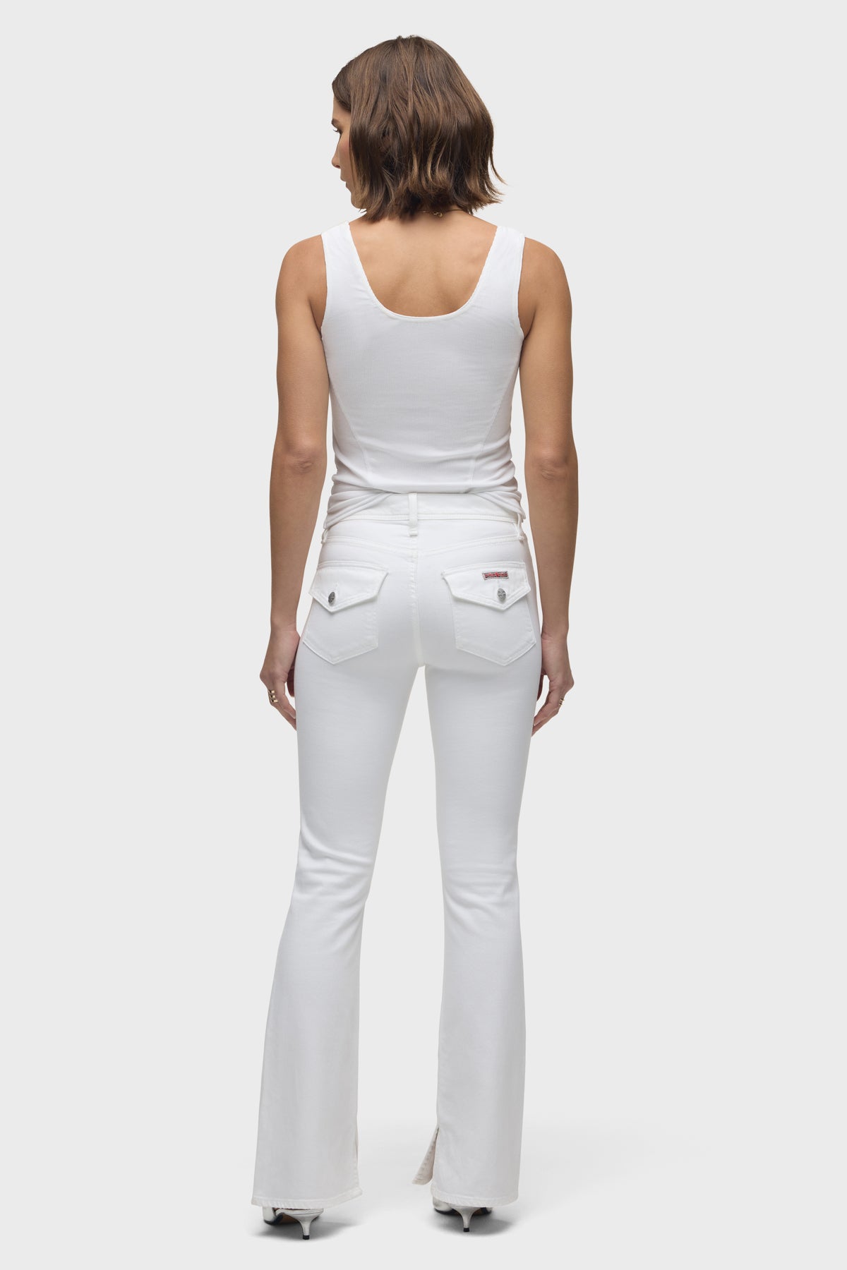 Streamlined and flattering, our Barbara High-Rise Bootcut Jean w/ Flap in White has a slim, contoured fit with an elevated waistline and a gently flared leg. This pair features our updated button-flap pocket with a new modern shape. Made of premium comfort stretch denim in a clean white shade, it is finished with a high rise, 32" inseam and 5" inseam slit with a clean finished hem. -