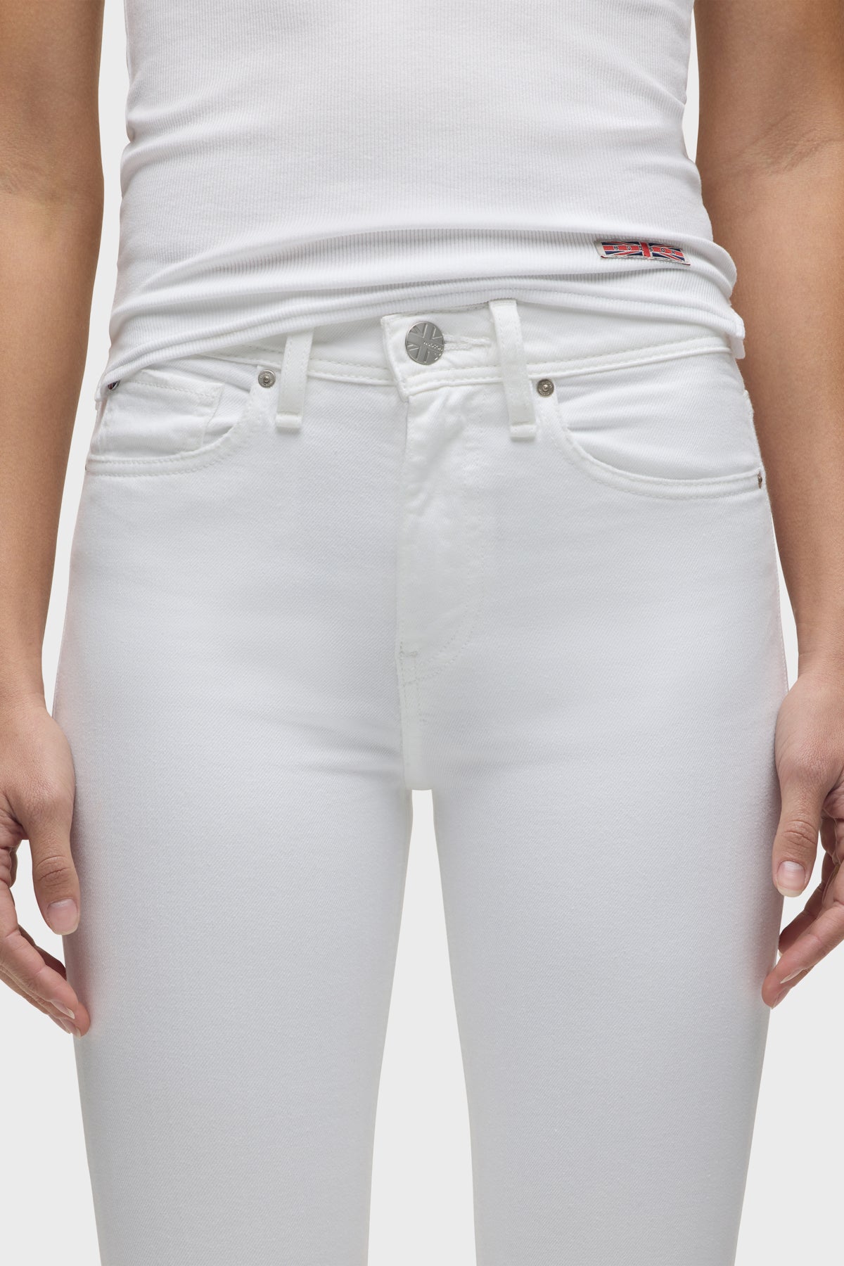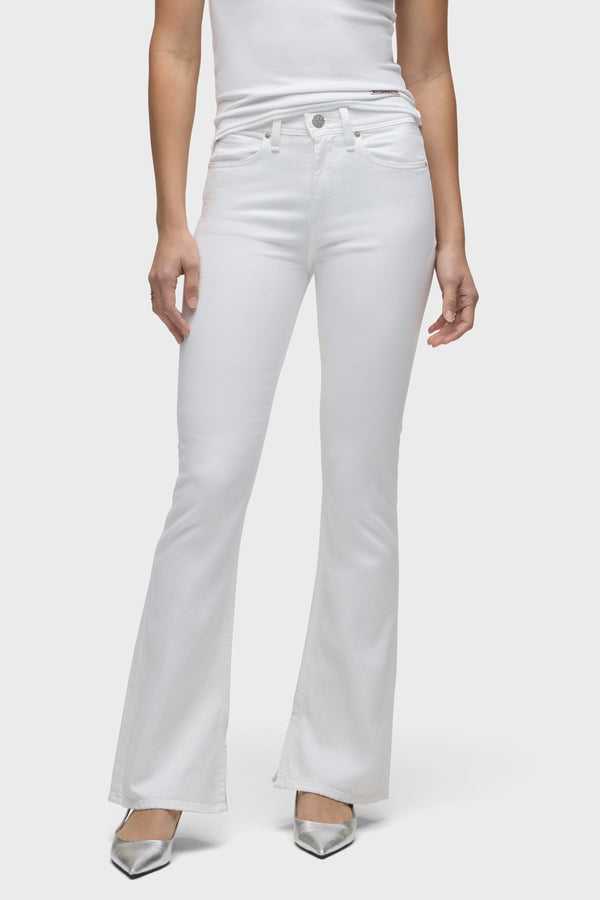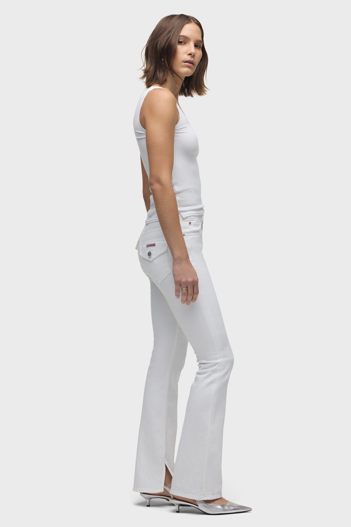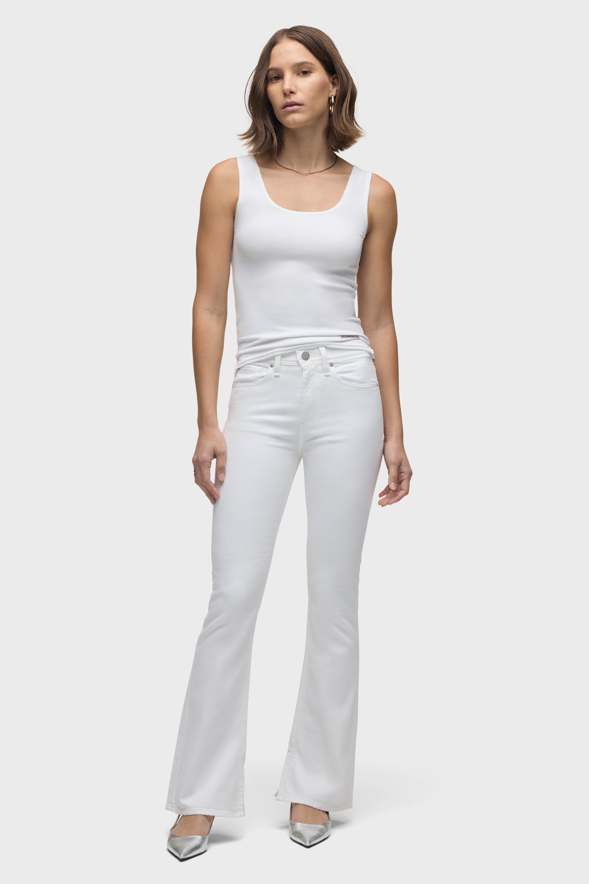 Streamlined and flattering, our Barbara High-Rise Bootcut Jean w/ Flap in White has a slim, contoured fit with an elevated waistline and a gently flared leg. This pair features our updated button-flap pocket with a new modern shape. Made of premium comfort stretch denim in a clean white shade, it is finished with a high rise, 32" inseam and 5" inseam slit with a clean finished hem. -