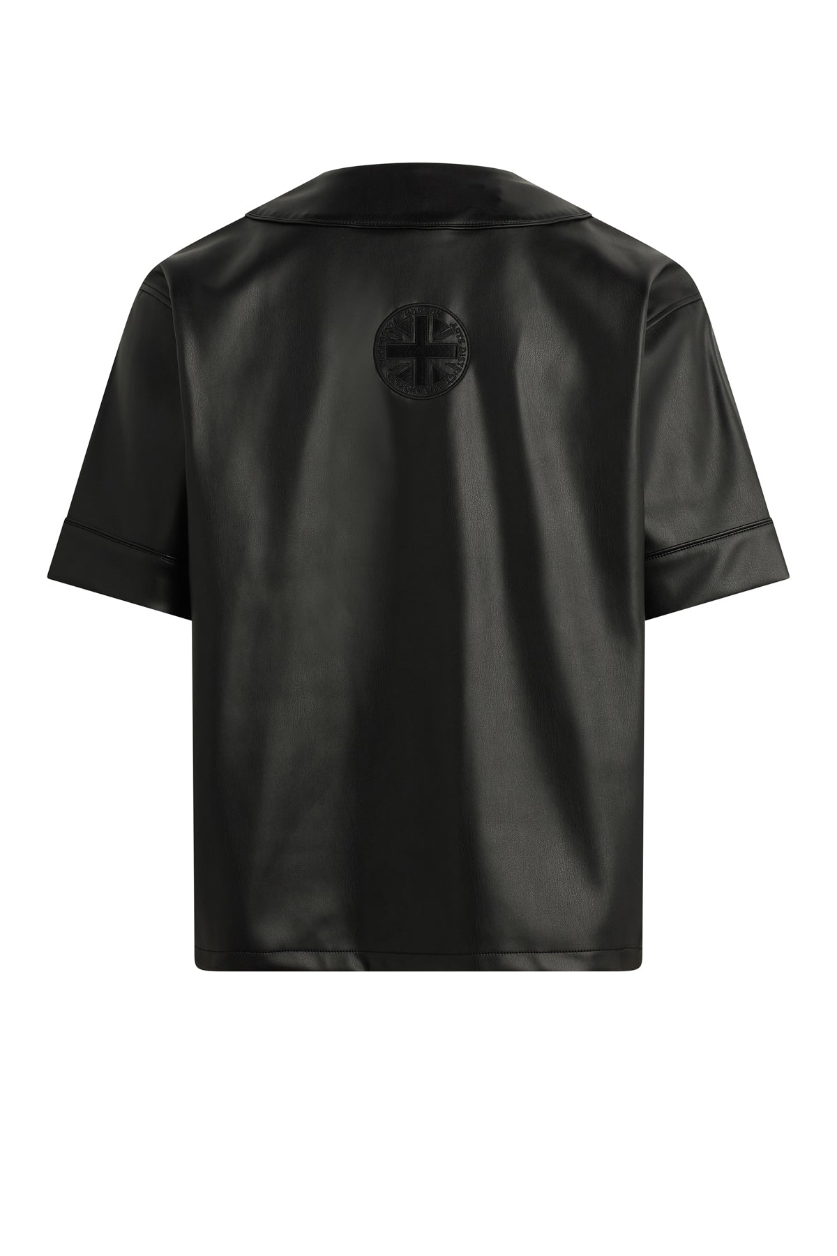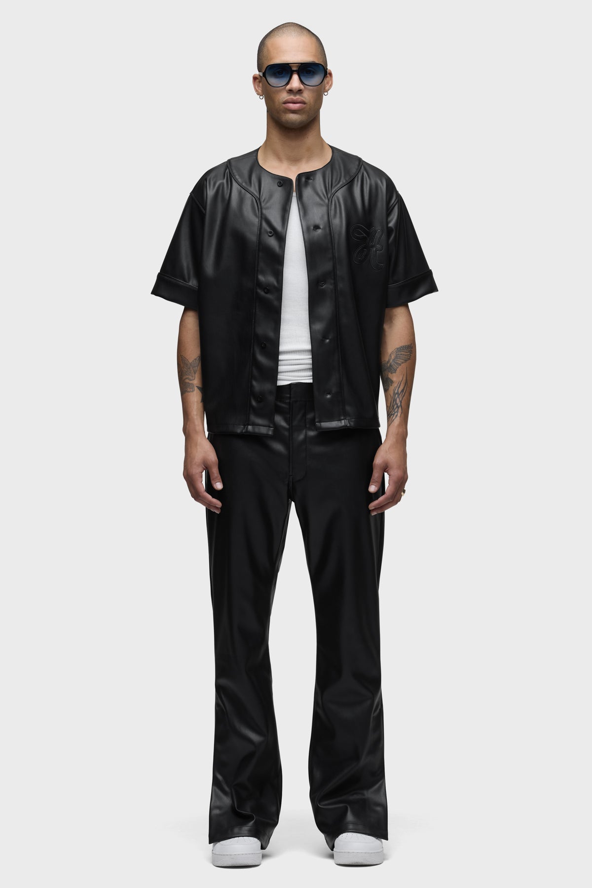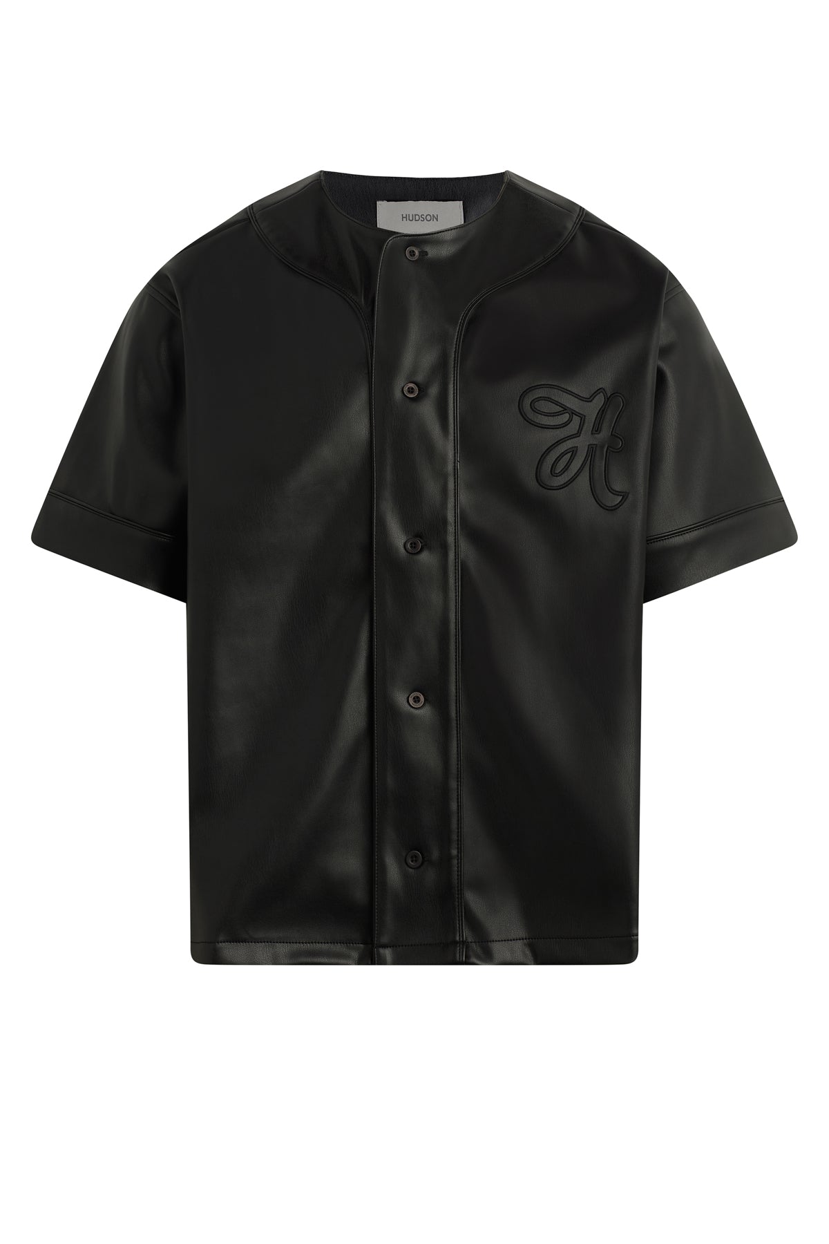 A classic reimagined, the Baseball Jersey in Black is a baseball-inspired jersey that is crafted from sleek black vegan leather. It is finished with bold Hudson embroidery on the chest and back. -