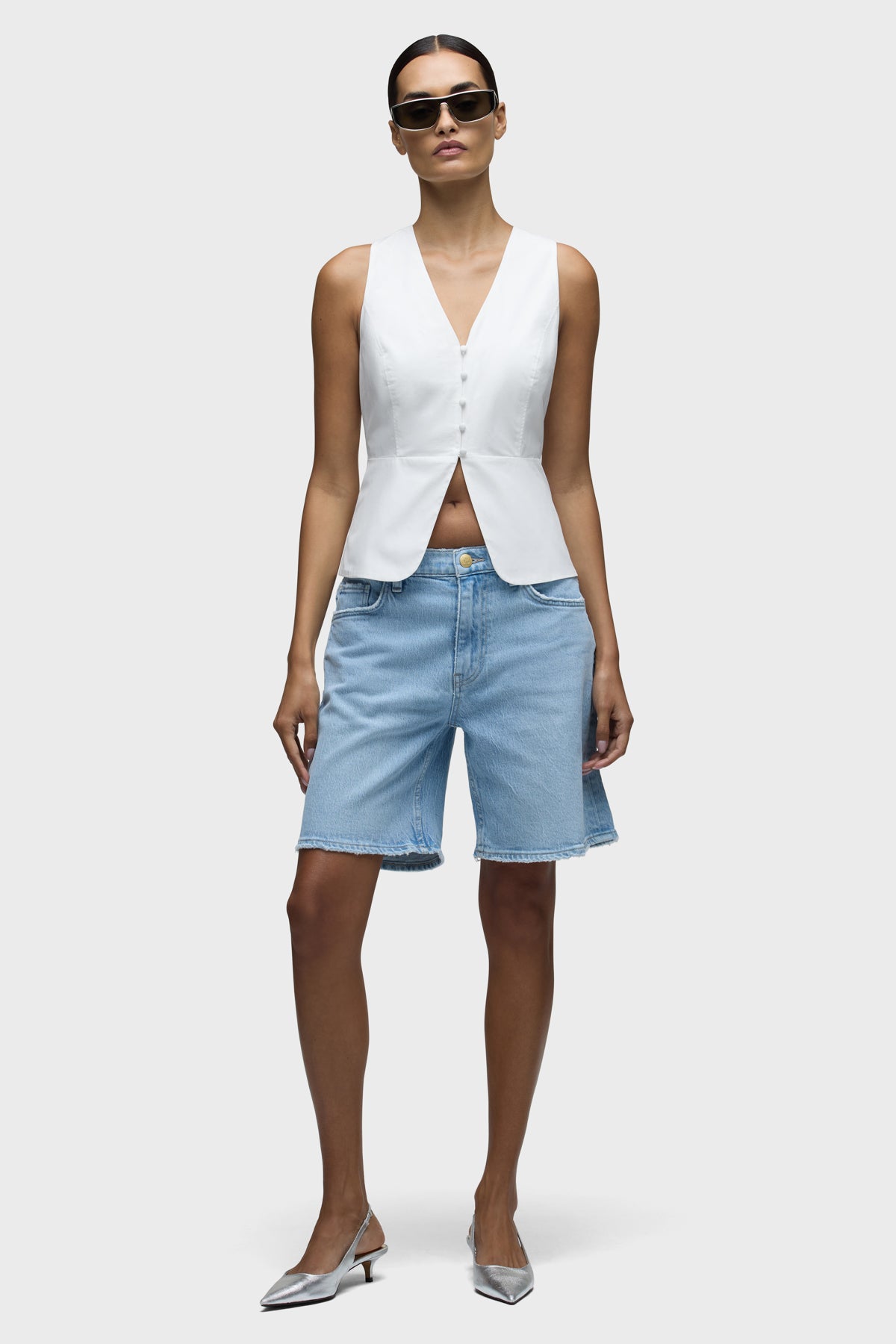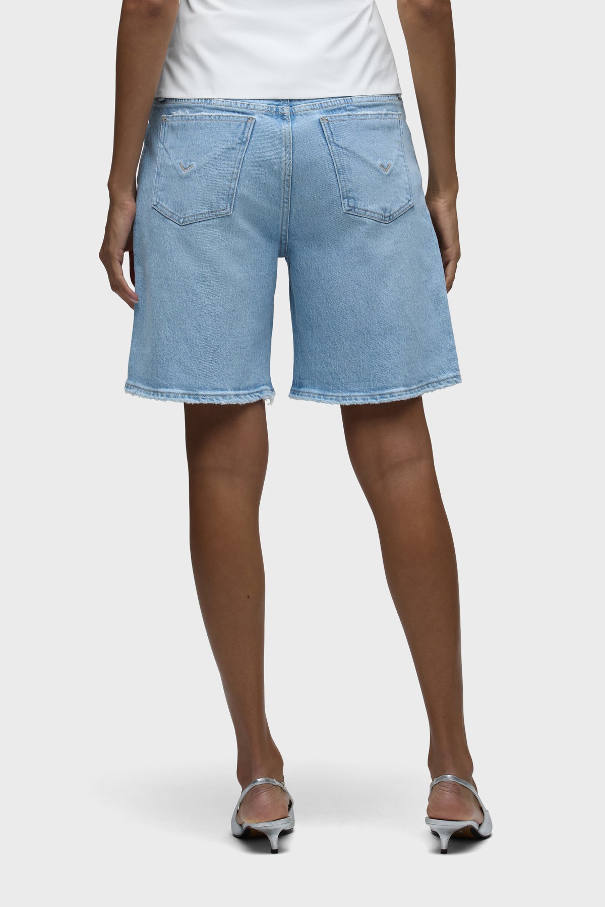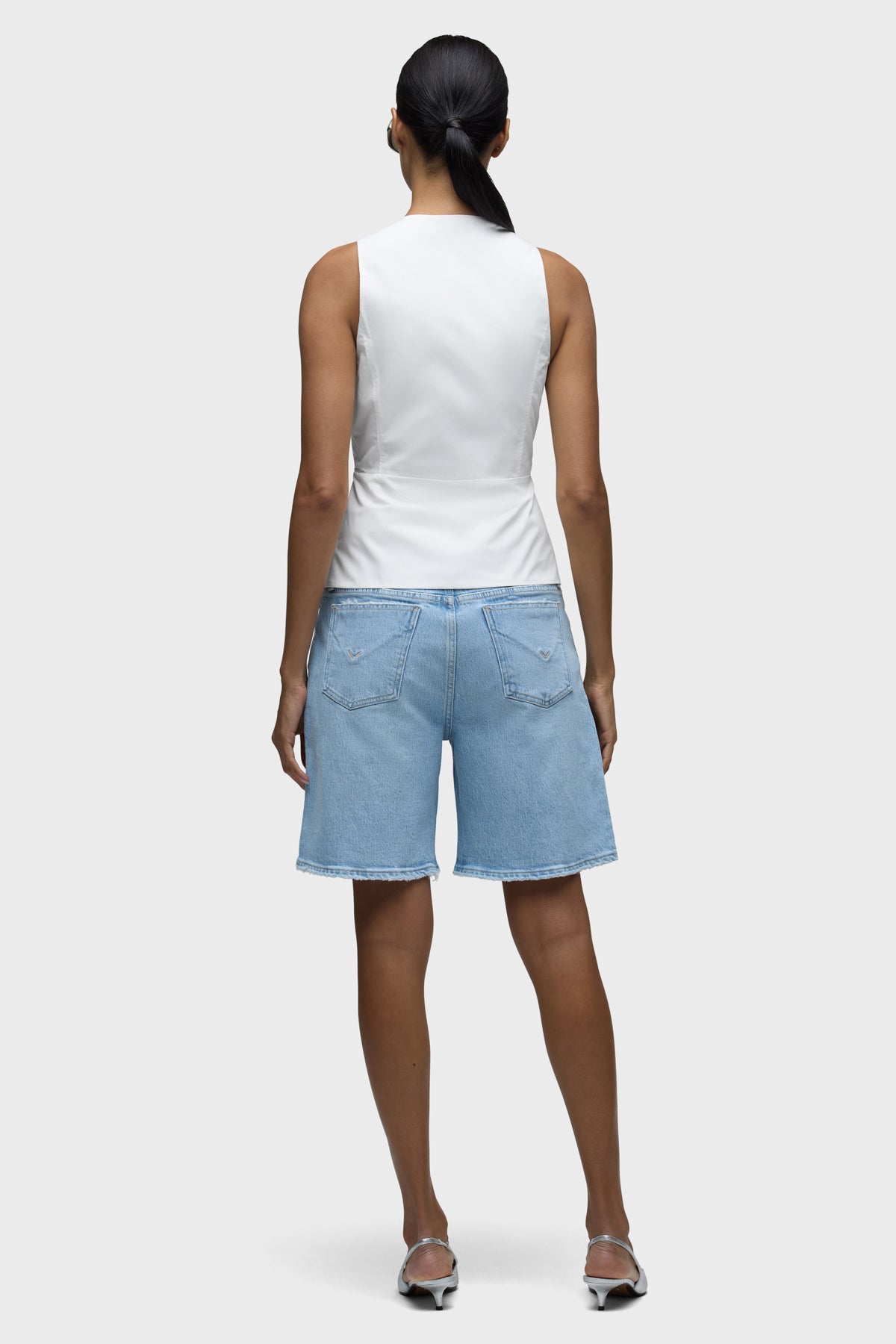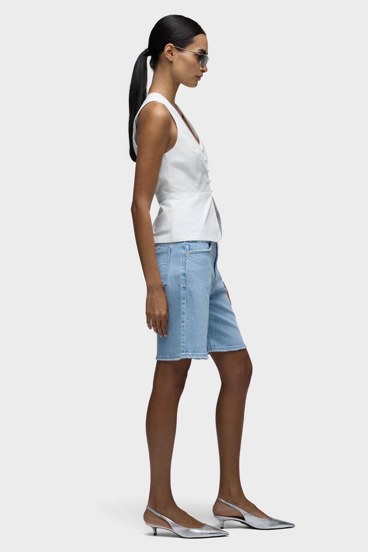 Part of our Brooks Nader collab capsule, the Bayou Boyfriend Short in Basin Bridge is a relaxed short that is meant to be worn loose on the hips with a clean finished hem. To elevate the look, we added gold branded buttons and a branded leather patch to the back waistband. This pair is made of comfort stretch denim in a light indigo wash with heavy stone washing, bleaching, whiskering and edge grinding. This capsule was curated by model Brooks Nader and features her personal closet must-haves. -
