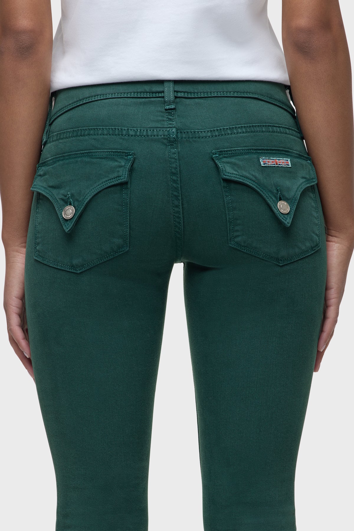 Cut from premium comfort stretch denim, our Beth Mid-Rise Baby Bootcut Jean in Darkest Spruce features a subtly flared silhouette, our signature button-flap back pockets with the Union Jack flag, and a clean-finished hem. This pair is updated for the season in a deep green color. -