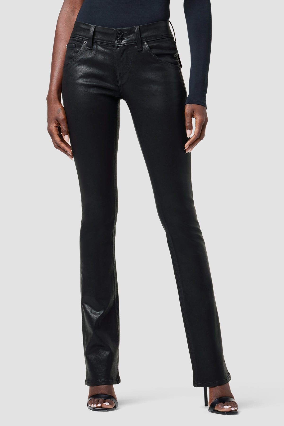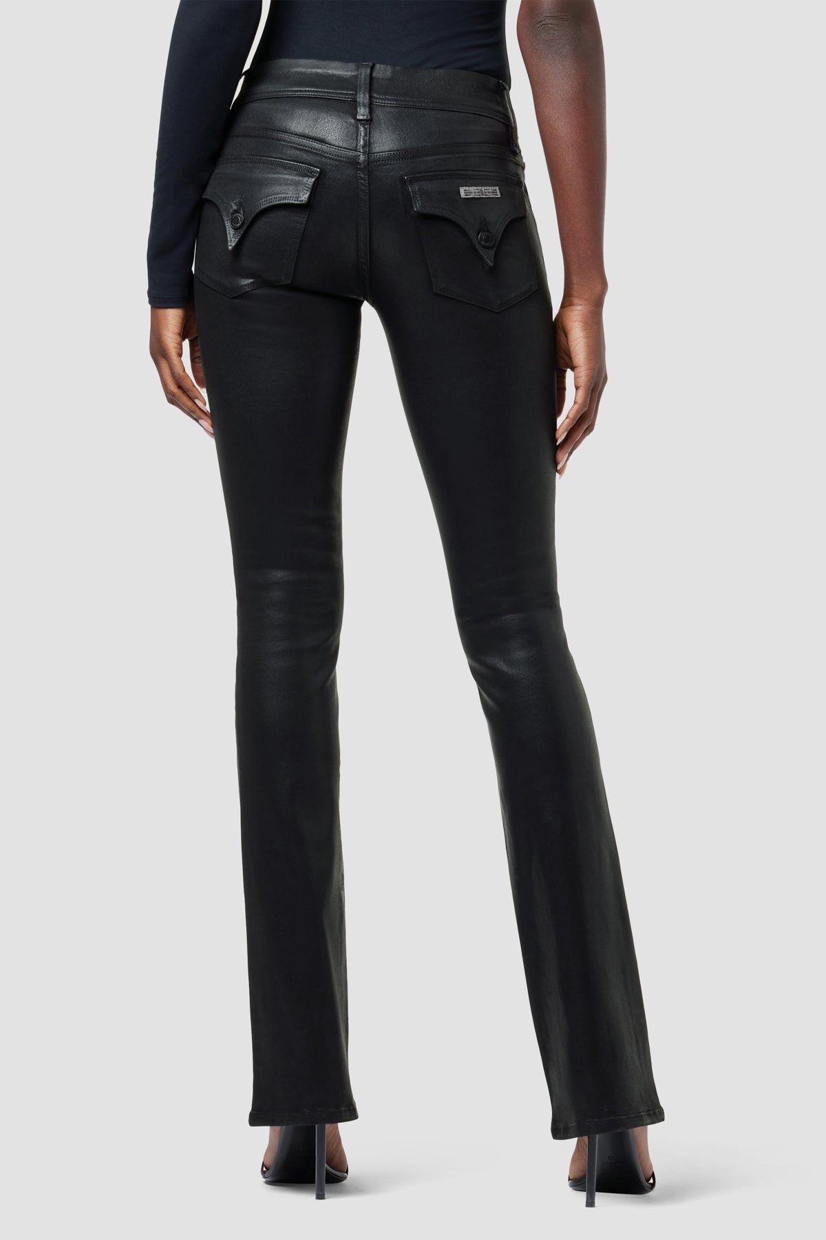 Cut with premium super stretch denim, our Beth Mid-Rise Baby Bootcut Jean in Coated Black Beauty features a subtly flared silhouette and our signature button-flap back pockets. -