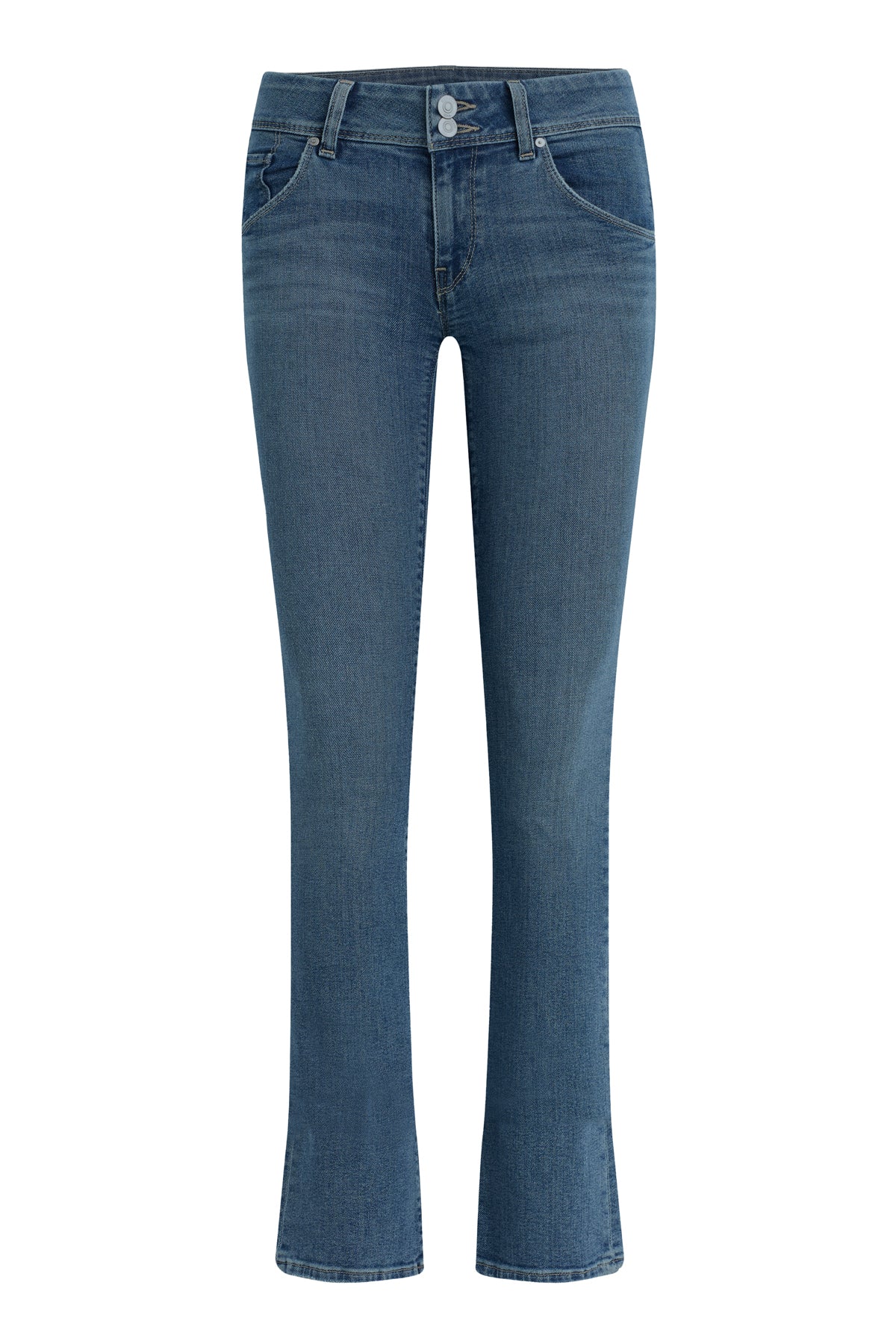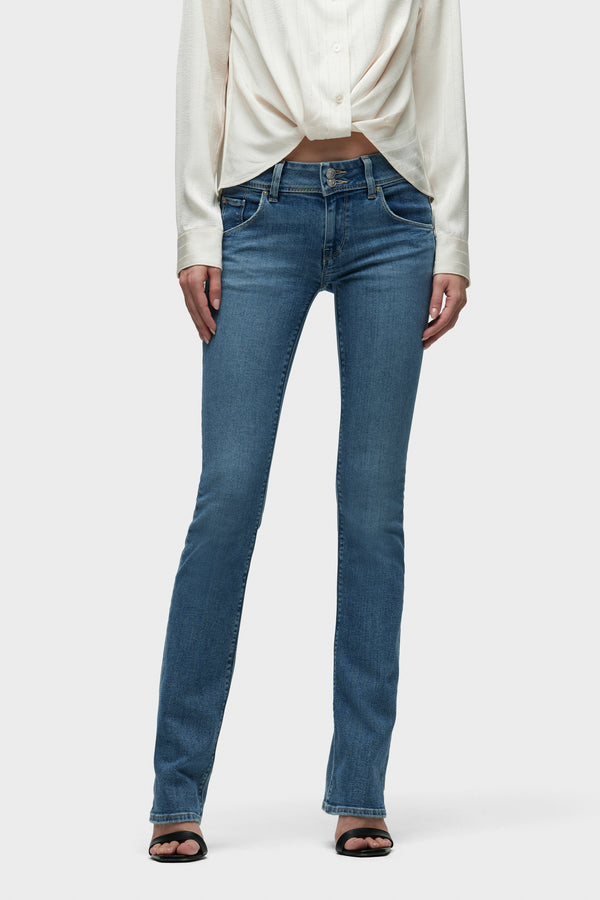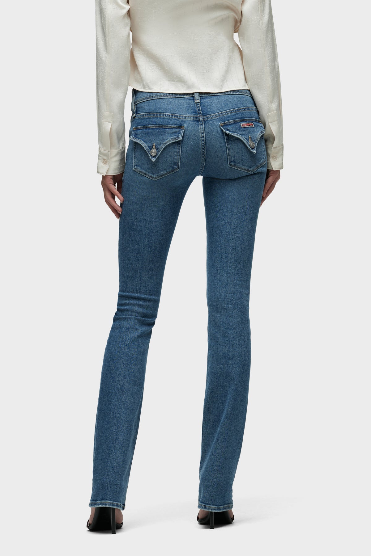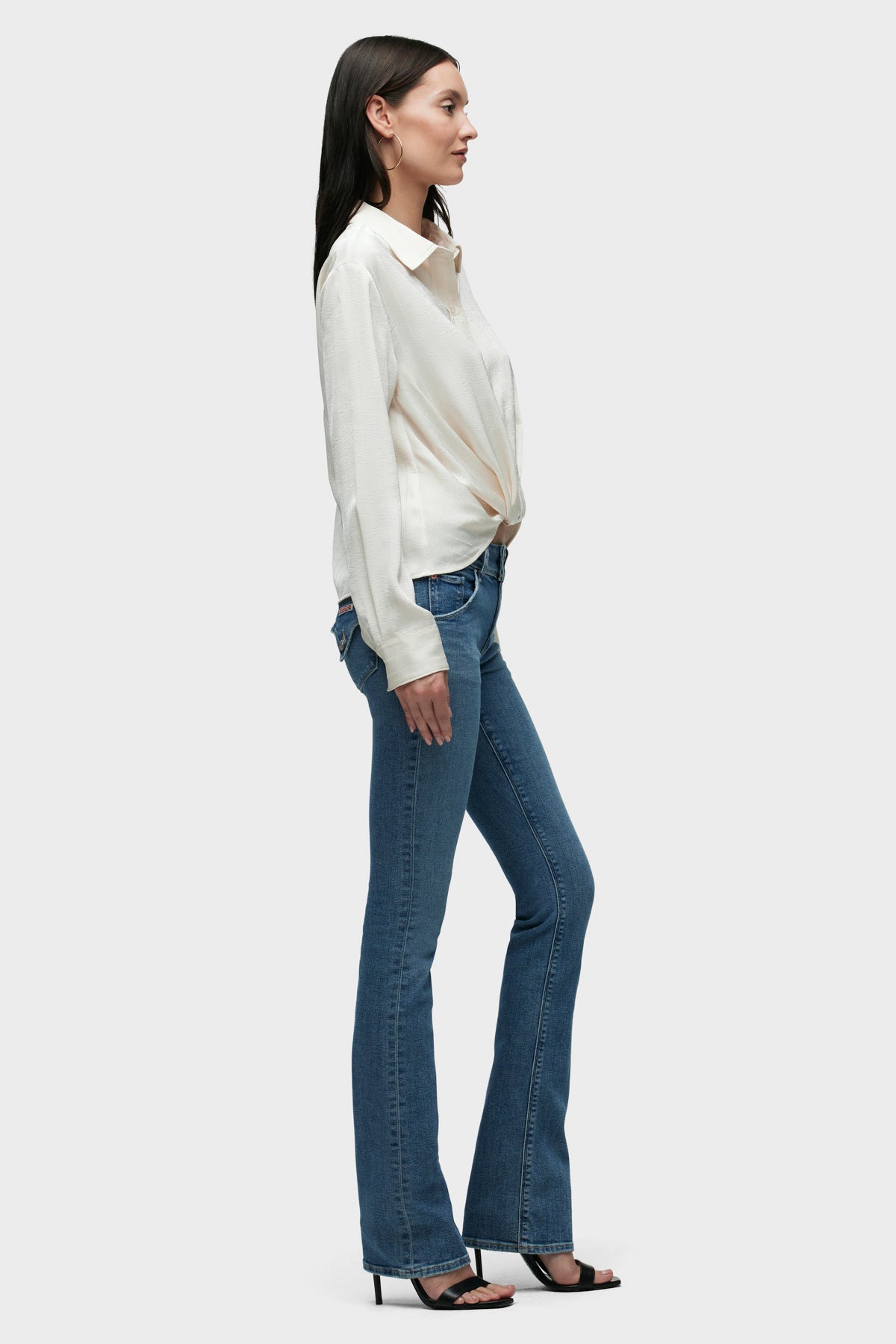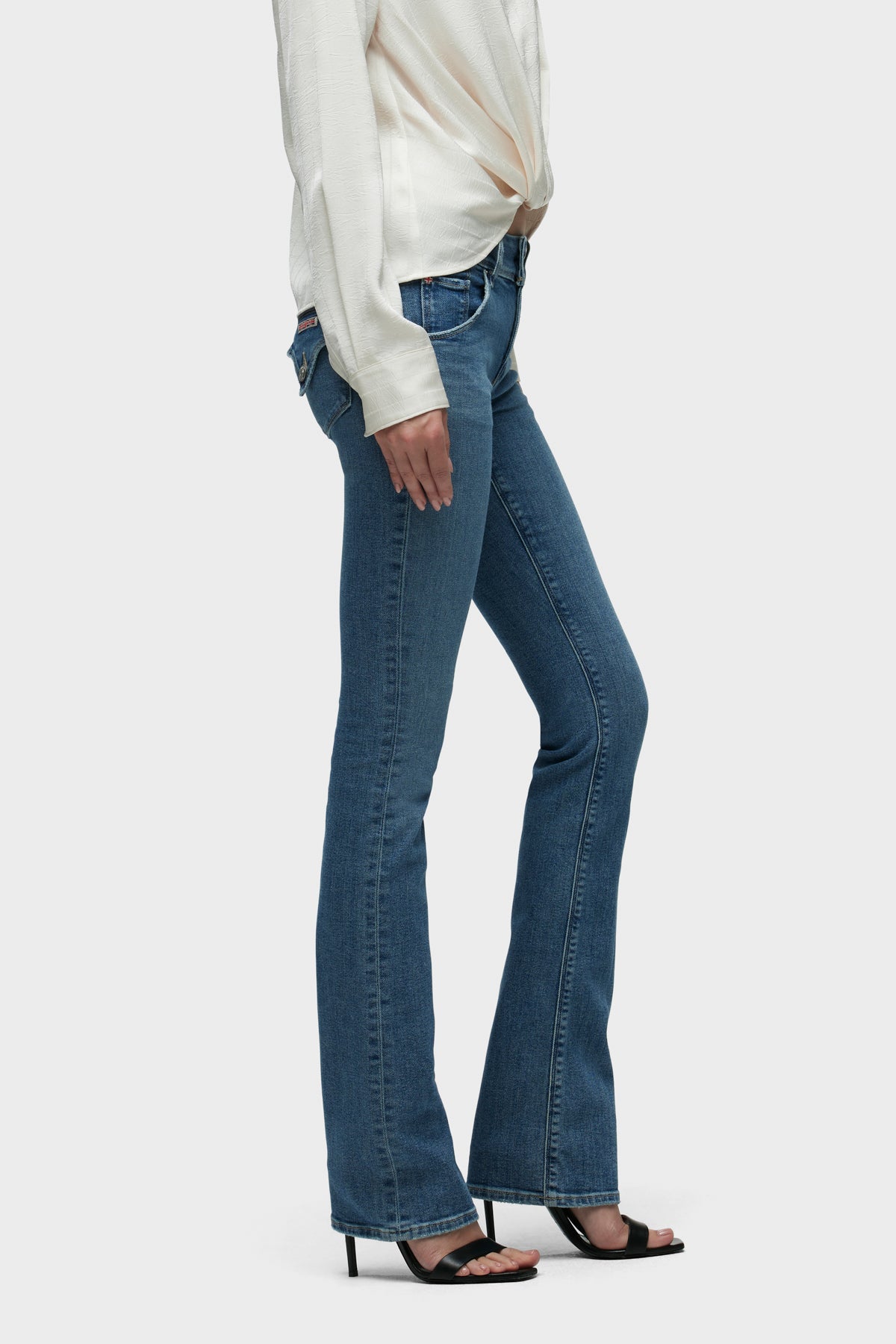 Cut with premium stretch denim, our Beth Mid-Rise Baby Bootcut Jean in medium-light Promise features a subtly flared silhouette, a clean hem, grinding on the edges and our signature button-flap back pockets. -
