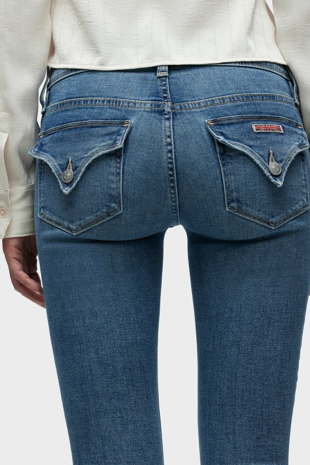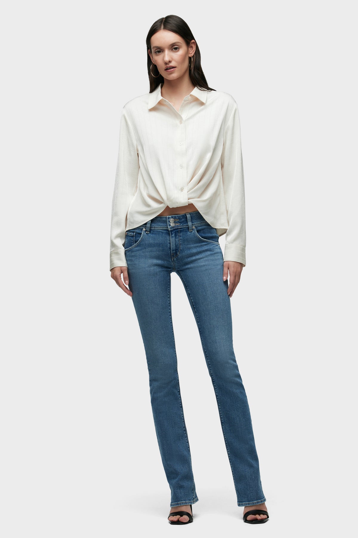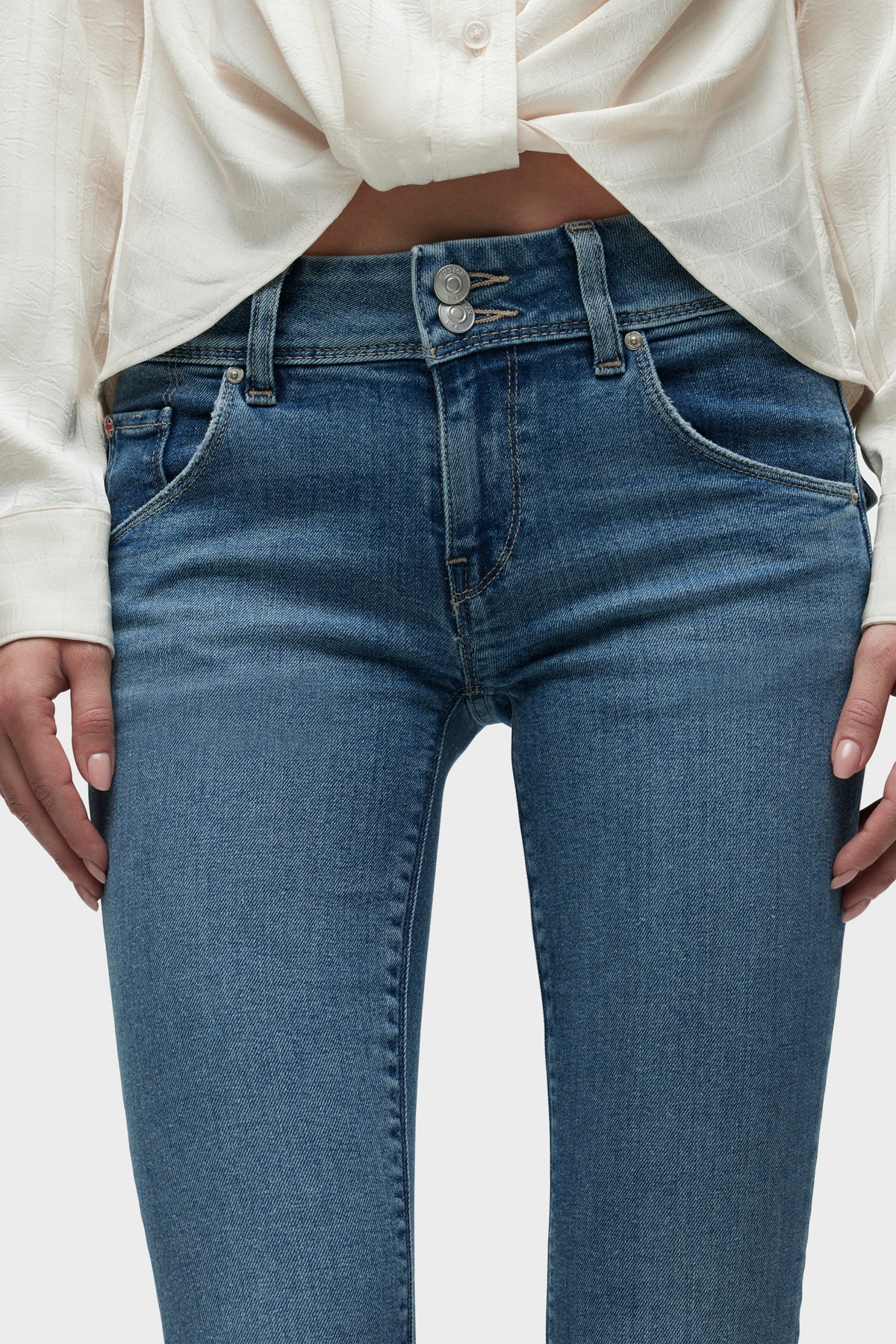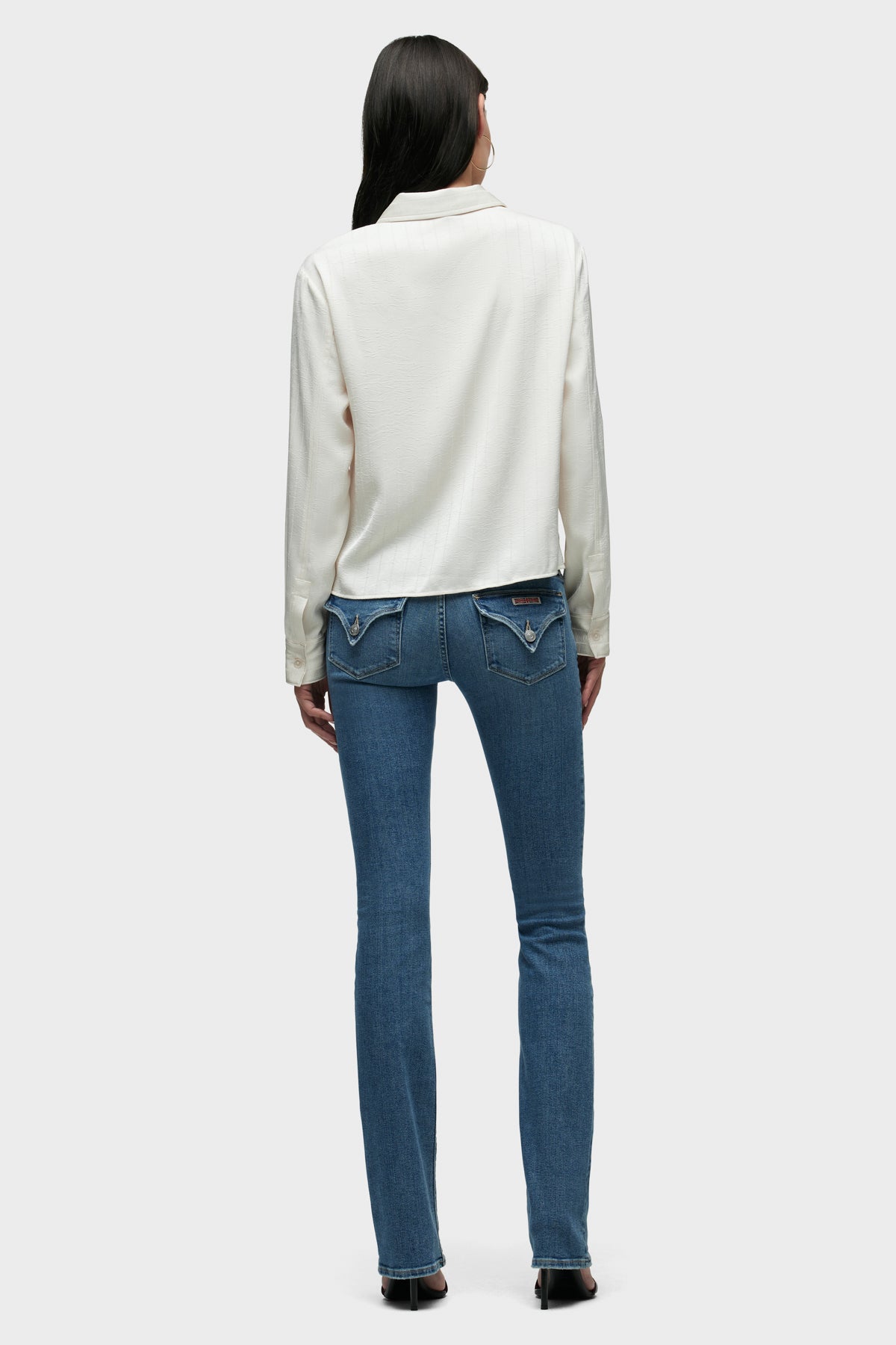 Cut with premium stretch denim, our Beth Mid-Rise Baby Bootcut Jean in medium-light Promise features a subtly flared silhouette, a clean hem, grinding on the edges and our signature button-flap back pockets. -