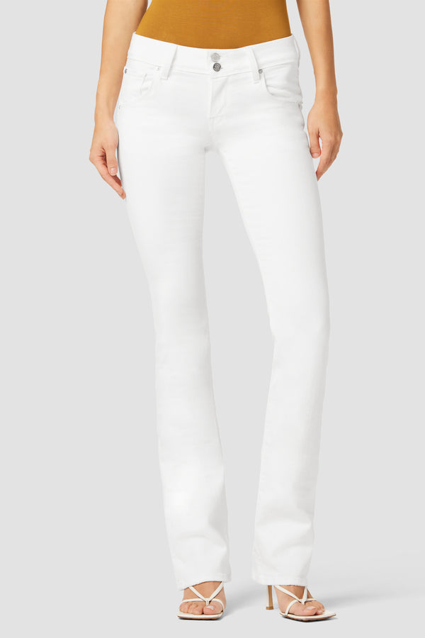 Cut with premium super stretch denim that smooths, sculpts, and will never sag, our Beth Mid-Rise Baby Bootcut Jean in White features a subtly flared silhouette and our signature button-flap back pockets. -