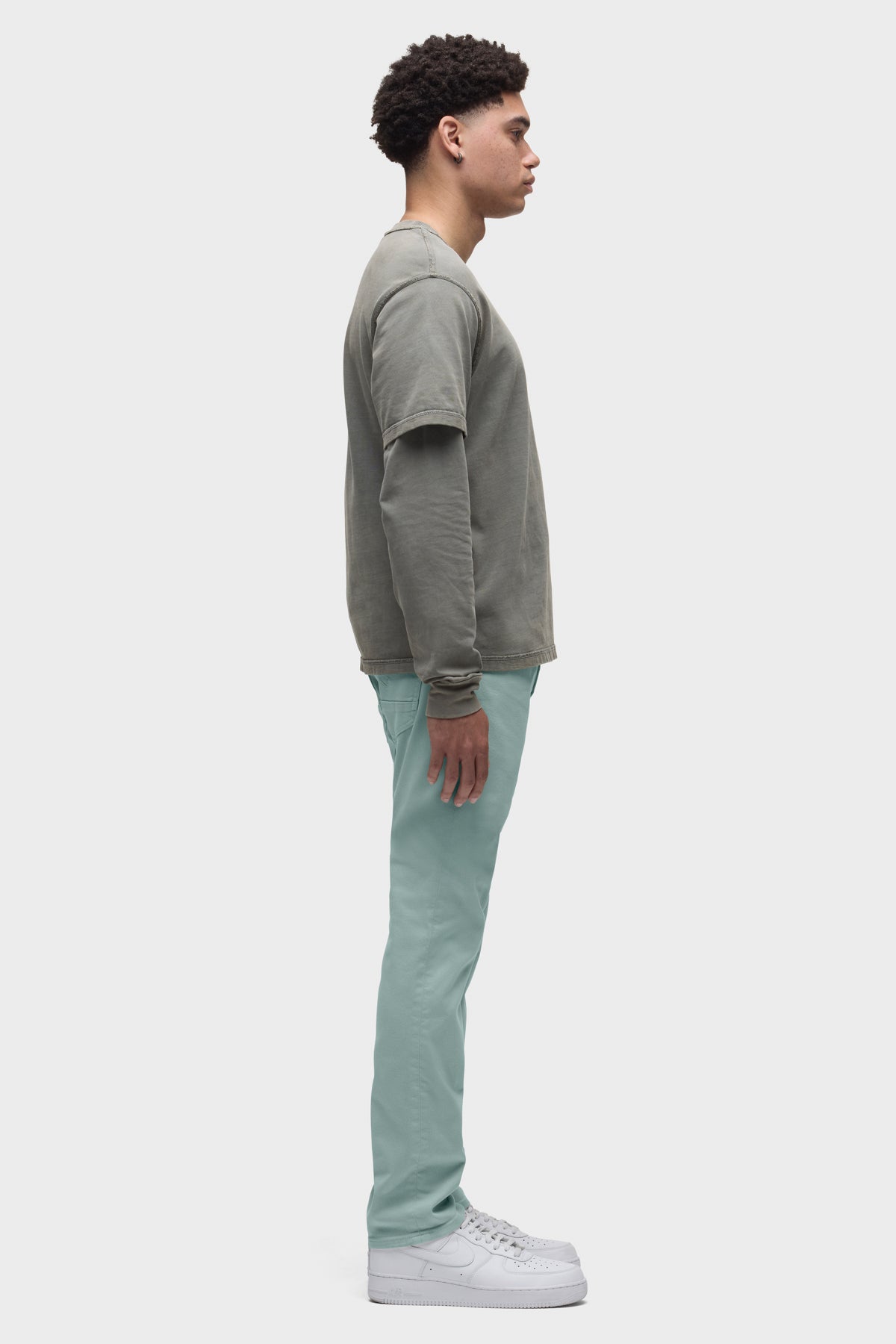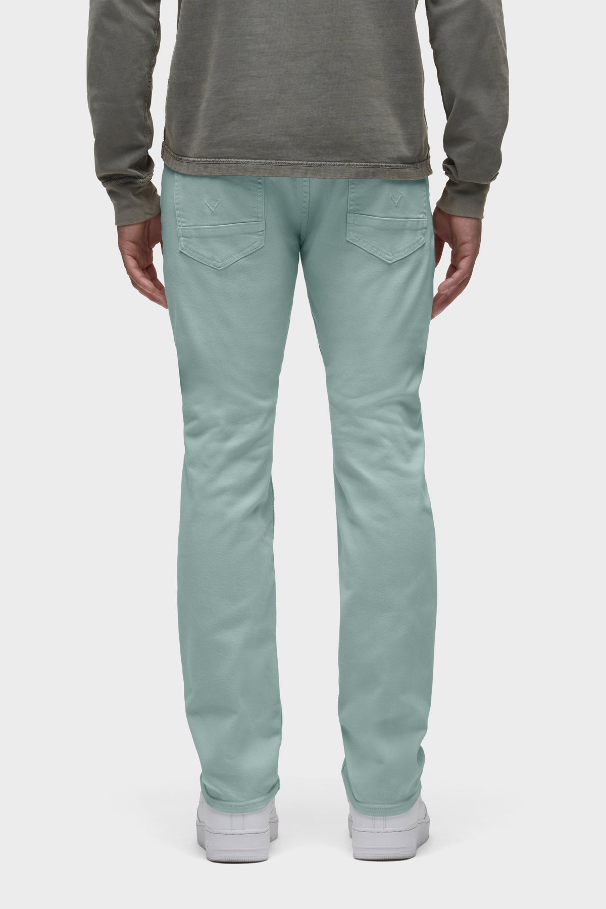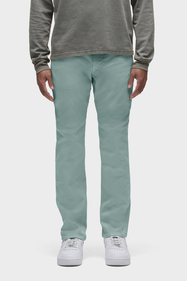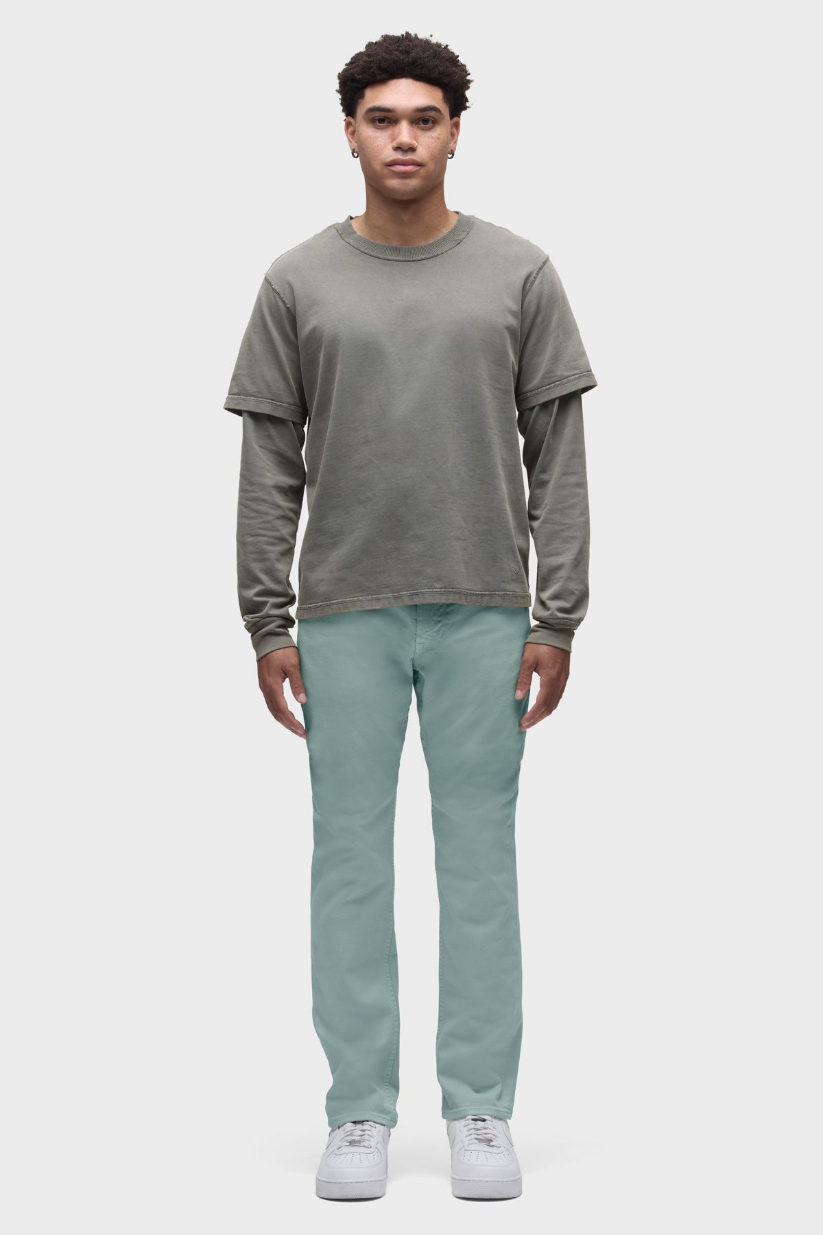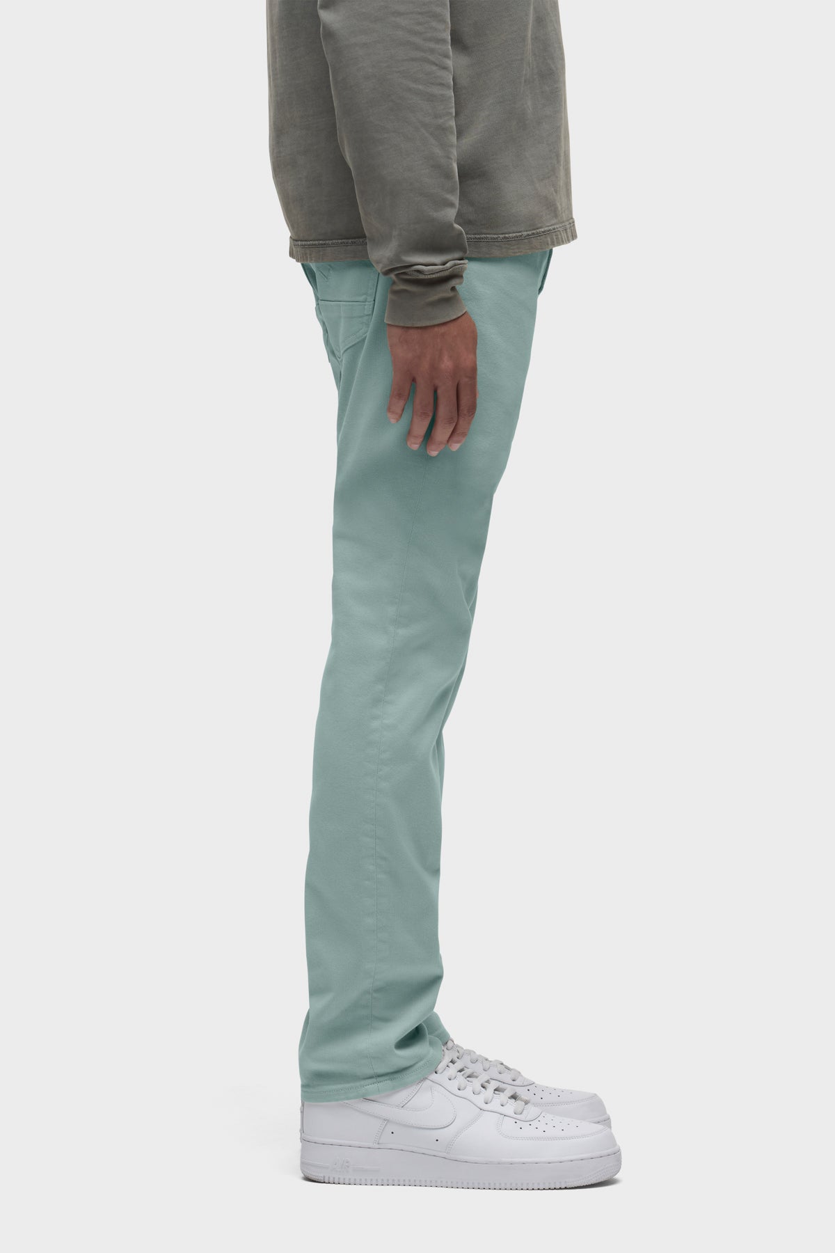 Can’t beat Blake, our modern, just-right fit. Mid-rise, slim through the hip and thigh with a tapered leg. A classic. This pair features an overdyed light green wash, Agave, and is made of our Textured Twill, a soft, mid-weight twill fabric with medium stretch. Classic five-pocket detailing, grey hardware and a black leather back patch finish the look. -