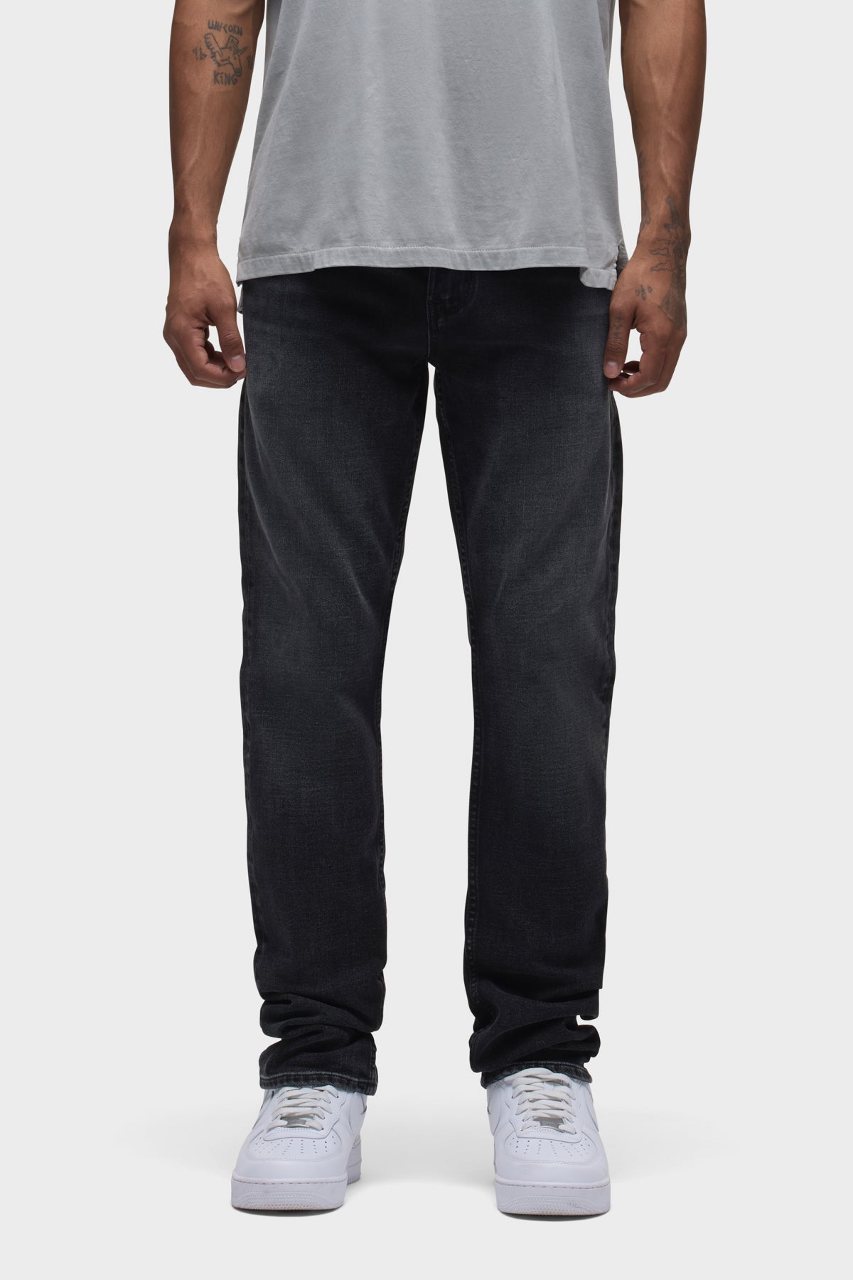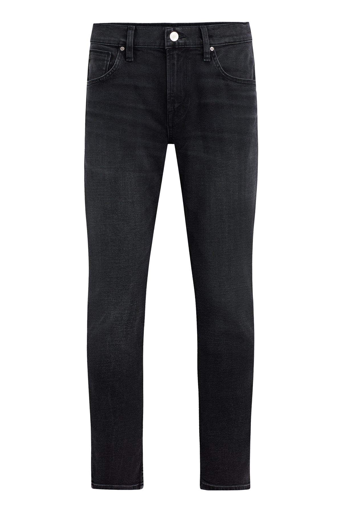 Can’t beat Blake, our modern, just-right fit. Mid-rise, slim through the hip and thigh with a tapered leg. A classic. The washed-black Caviar shade with whiskering and edge grinding is cut from premium comfort stretch denim that is super soft for a worn-in look. The pair is finished with dull nickel hardware and black leather back patch. -