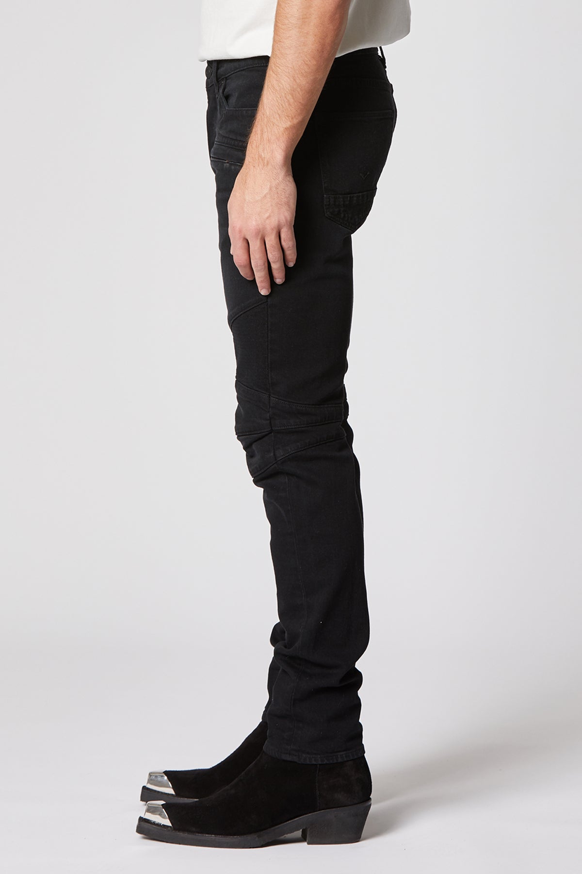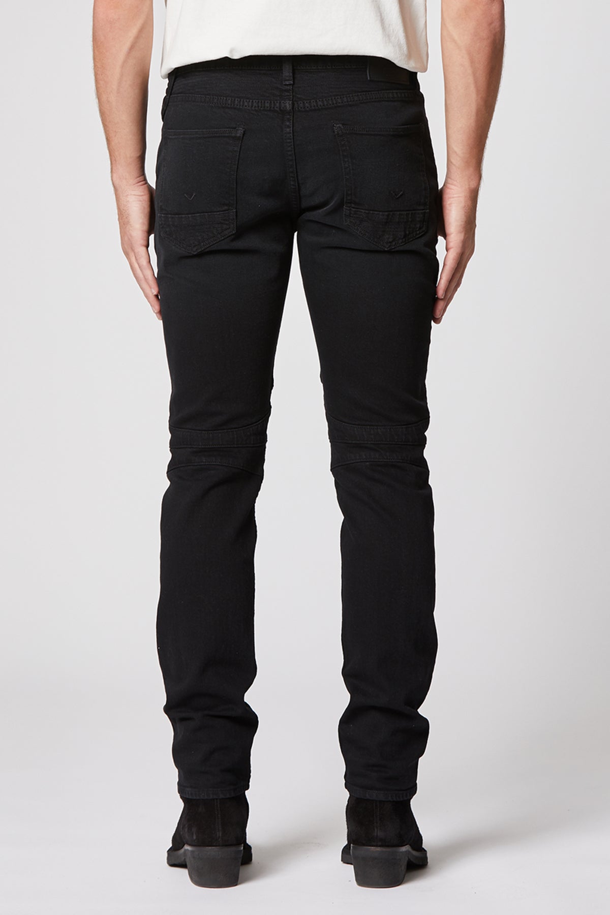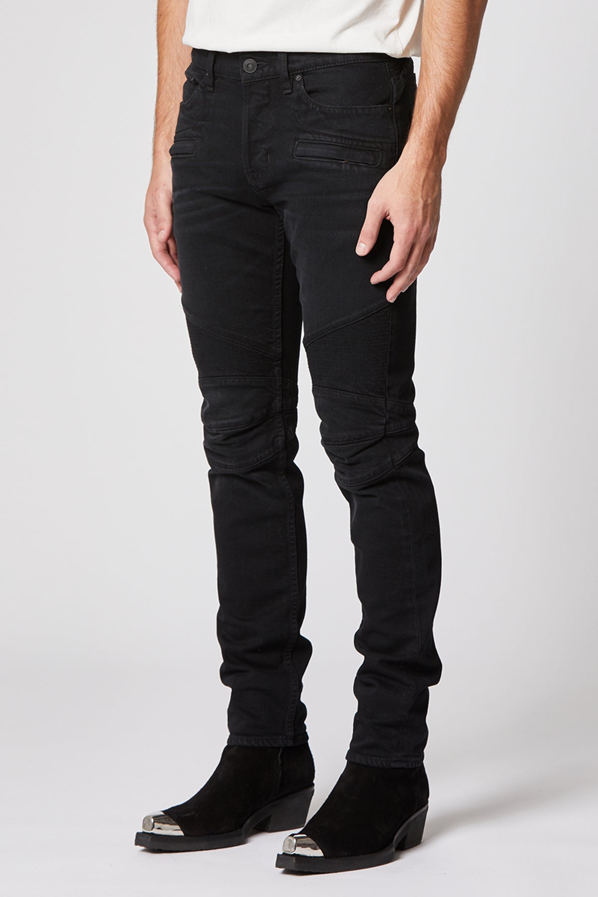 Inspired by moto styles, our Blinder Biker Skinny Jean is crafted from 12-ounce Italian denim with a hint of stretch for added softness, comfort, and flexibility. The overdyed black Season wash features two front zip pockets, ribbed leg panels, and subtle wear.