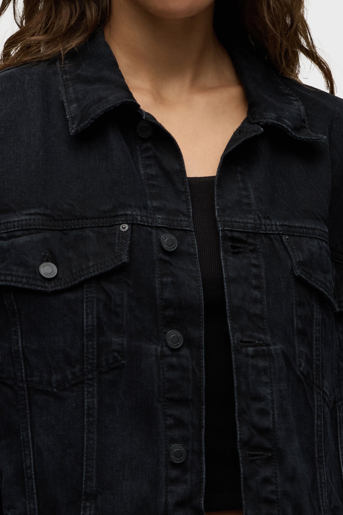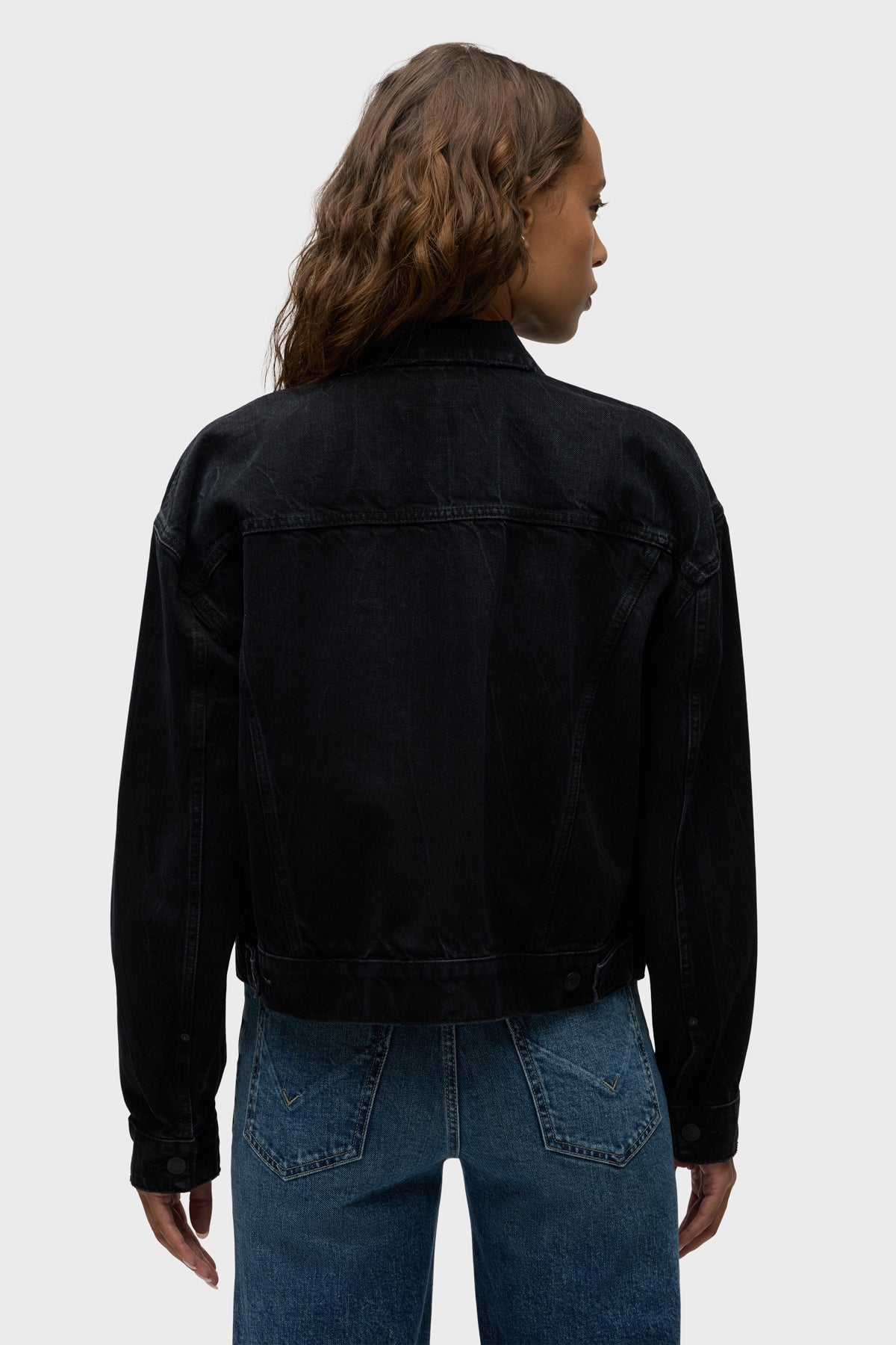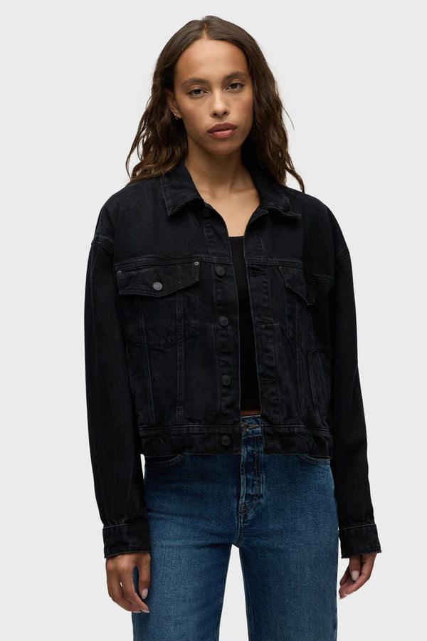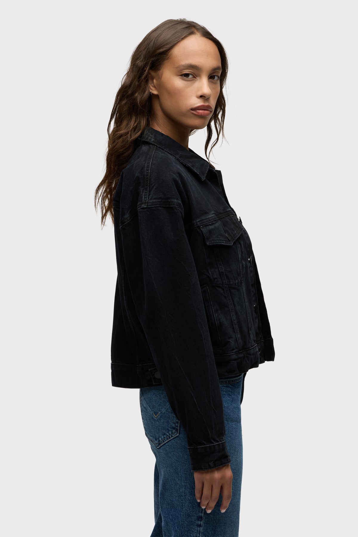 Our Brea Swing Trucker Jacket is cut for an easy fit with front welt pockets. Made from premium Italian rigid denim in deep Black Thunder wash. -