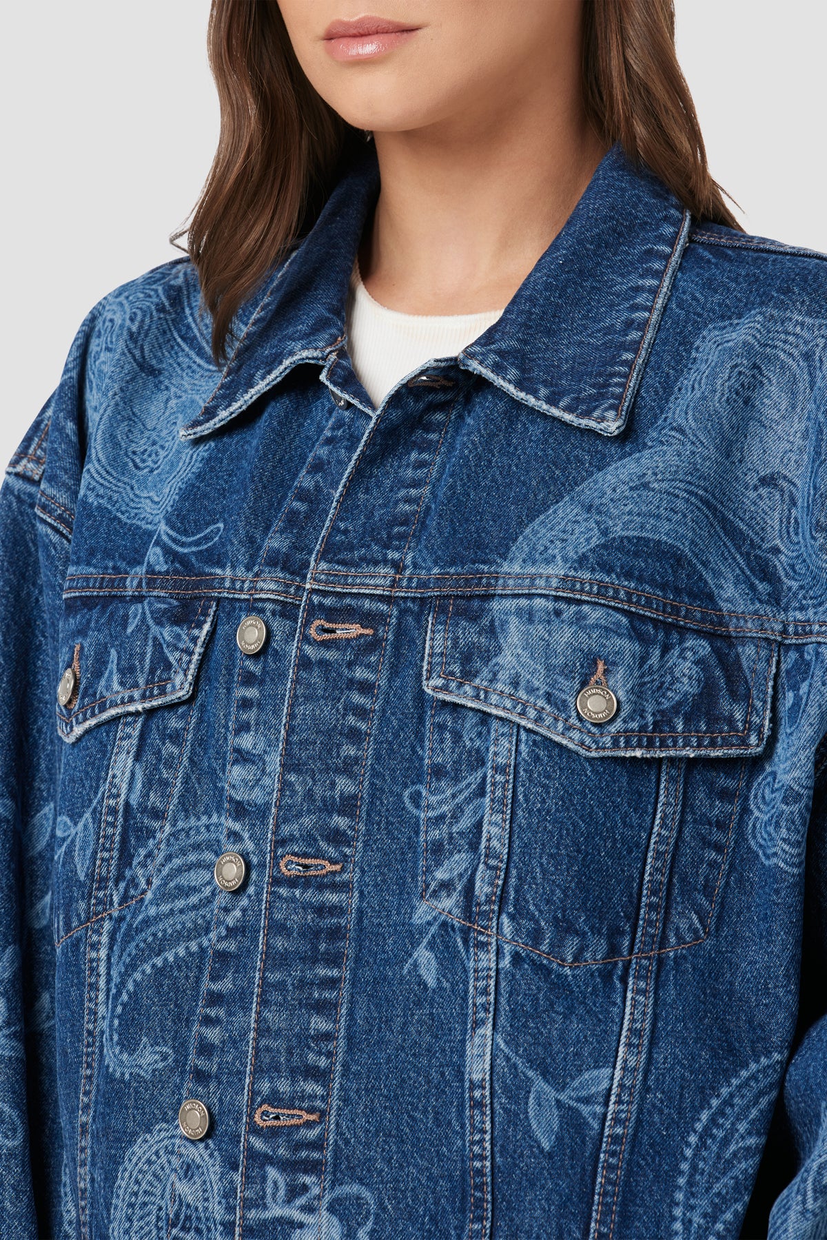 Our Brea Swing Trucker Jacket is cut for an easy fit from 100% cotton, rigid denim in medium-dark Laser Paisley. -