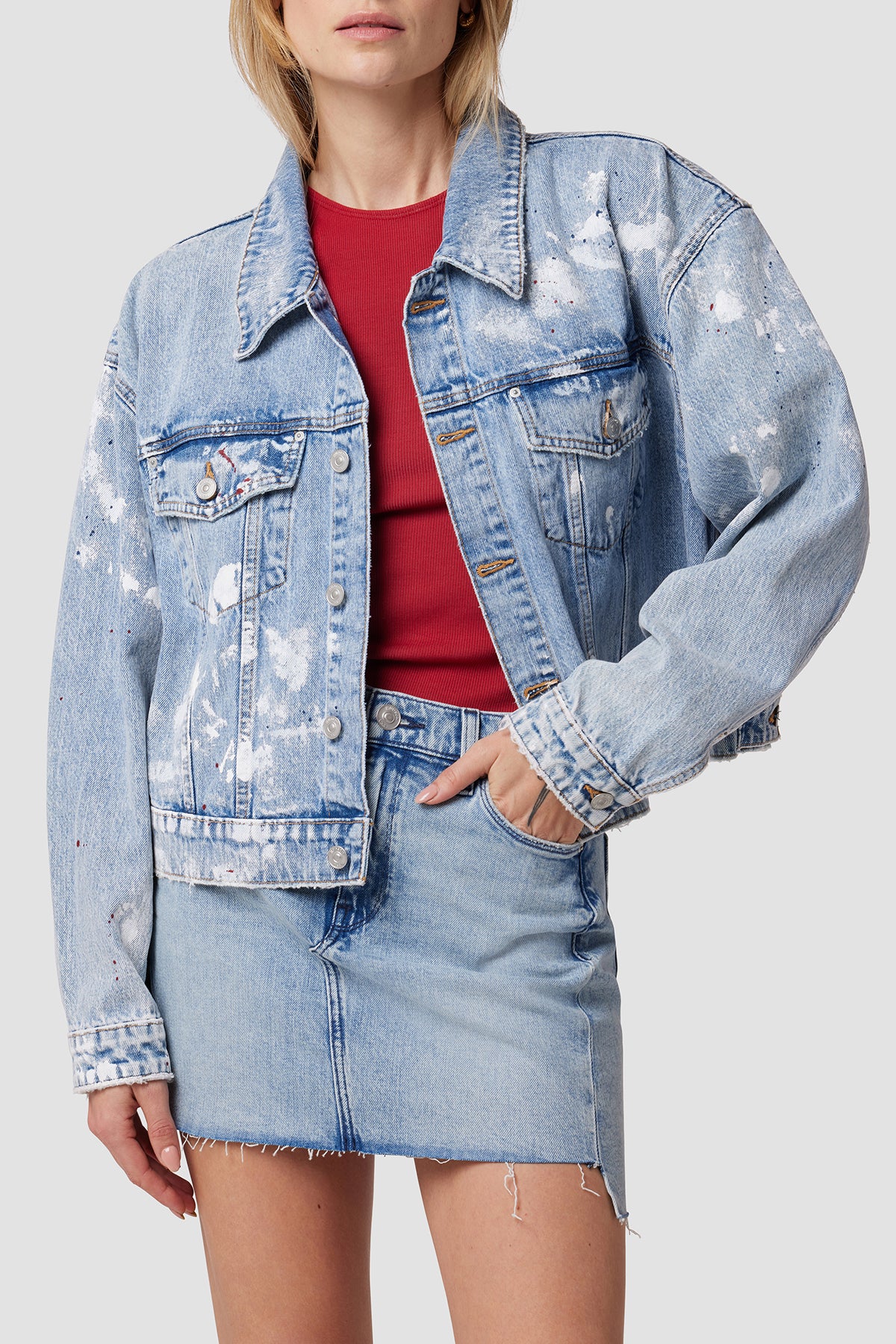 Our Brea Swing Trucker Jacket is your classic jacket reworked with a loose silhouette. The medium indigo Pigment Explosion wash is paint-splattered to imperfection and cut from 100% cotton denim that’ll only get better with wear. -