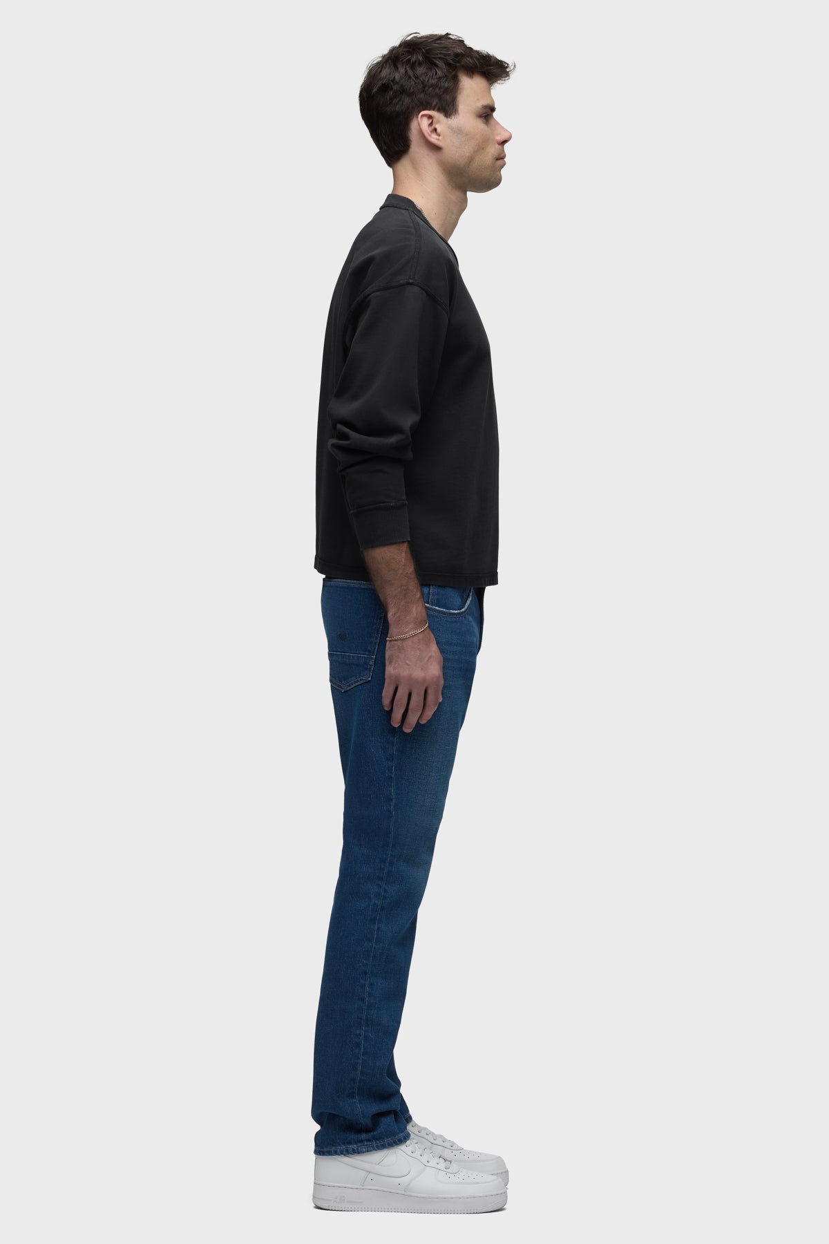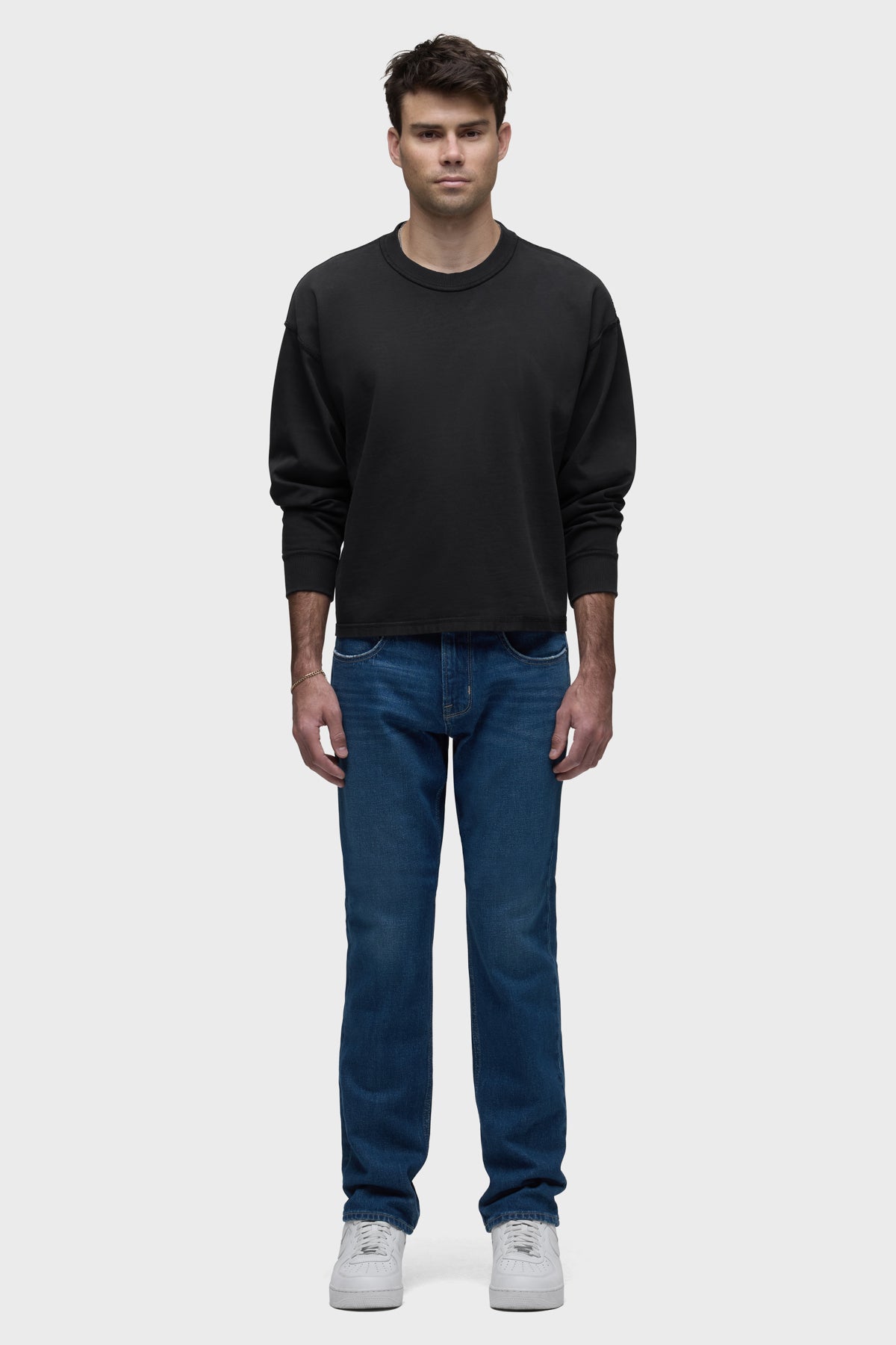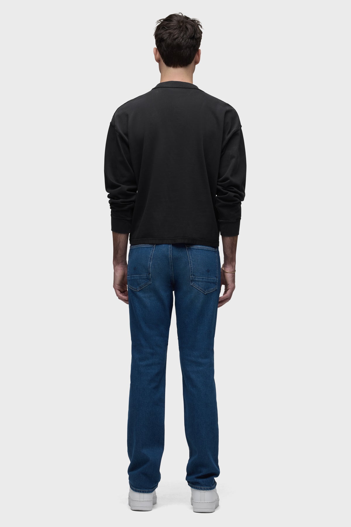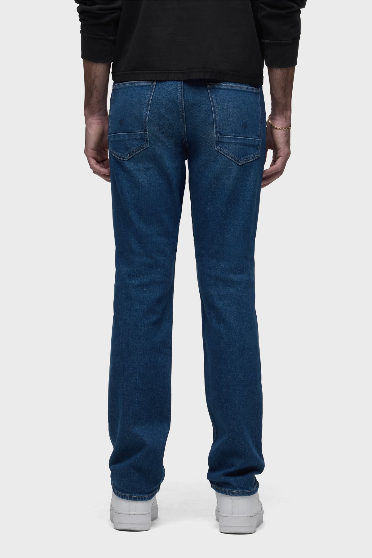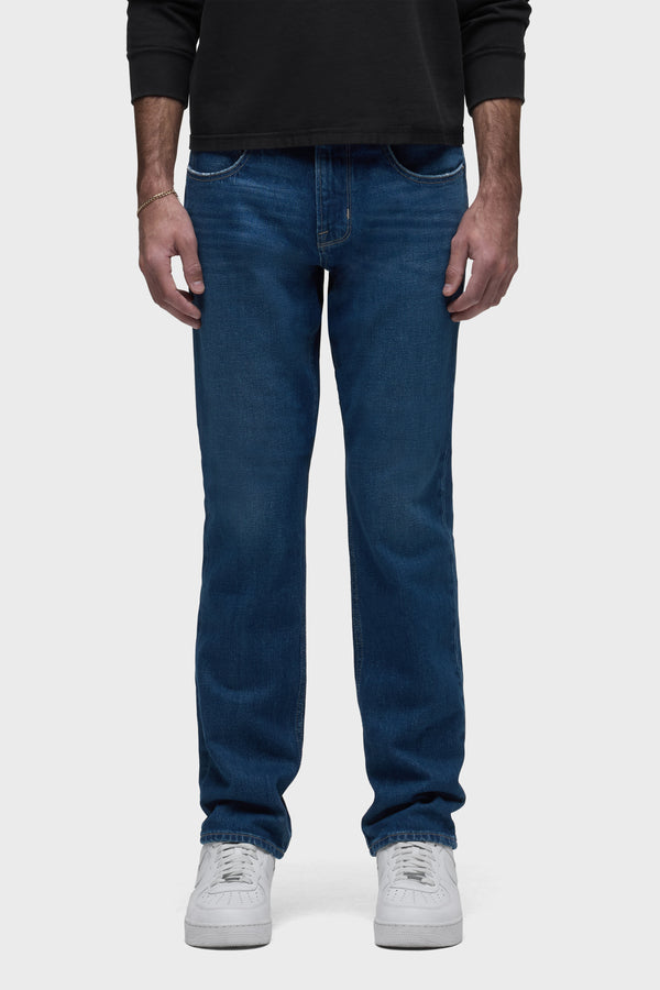 The Byron is our most relaxed fit. Mid-rise, straight through the hip and thigh with a slim-straight leg. A classic. This pair features a medium-dark indigo wash, Sutton, and it is made of premium comfort stretch denim with classic five-pocket detailing. -