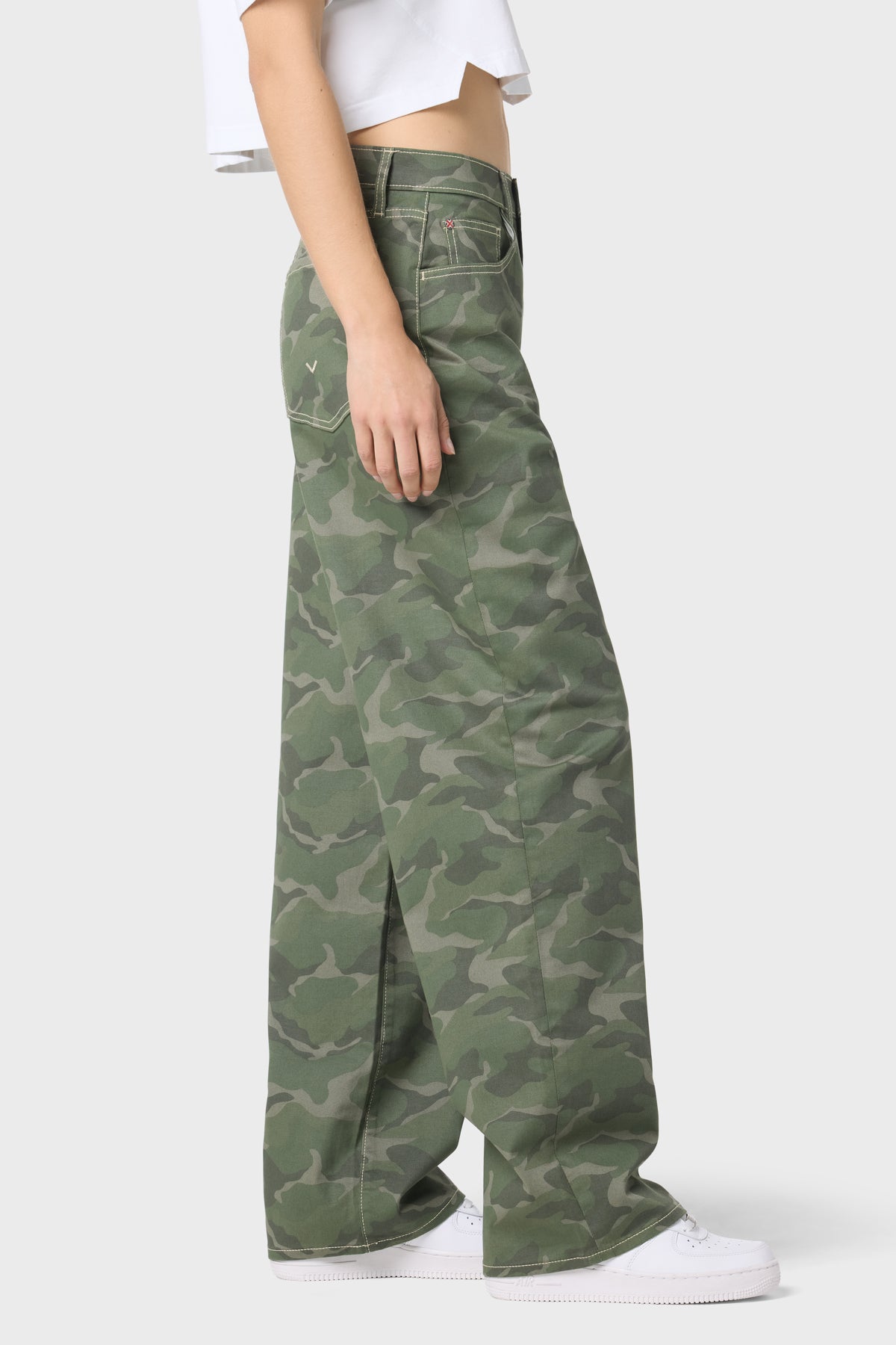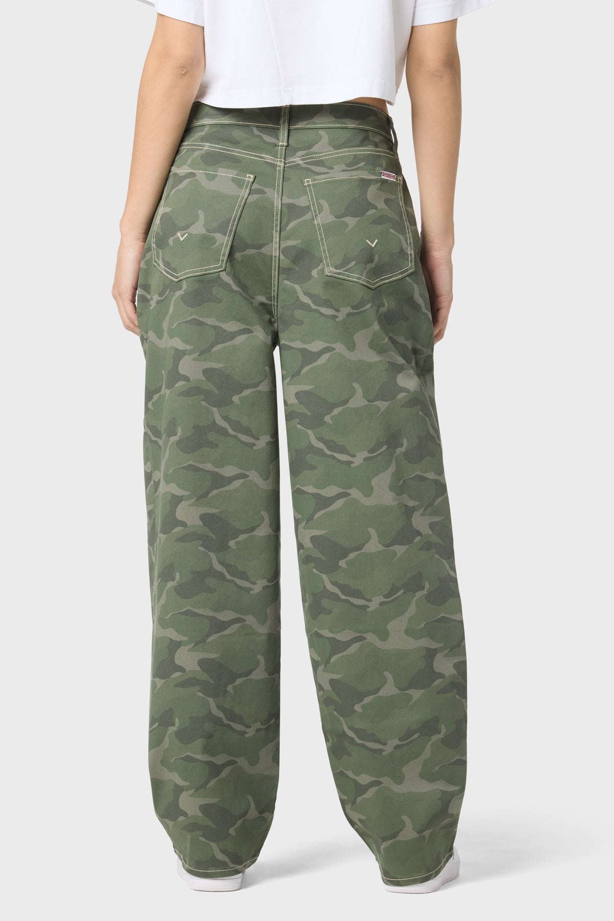 Contrast stitching and a camo print bring a utilitarian aesthetic to these barrel-leg jeans.