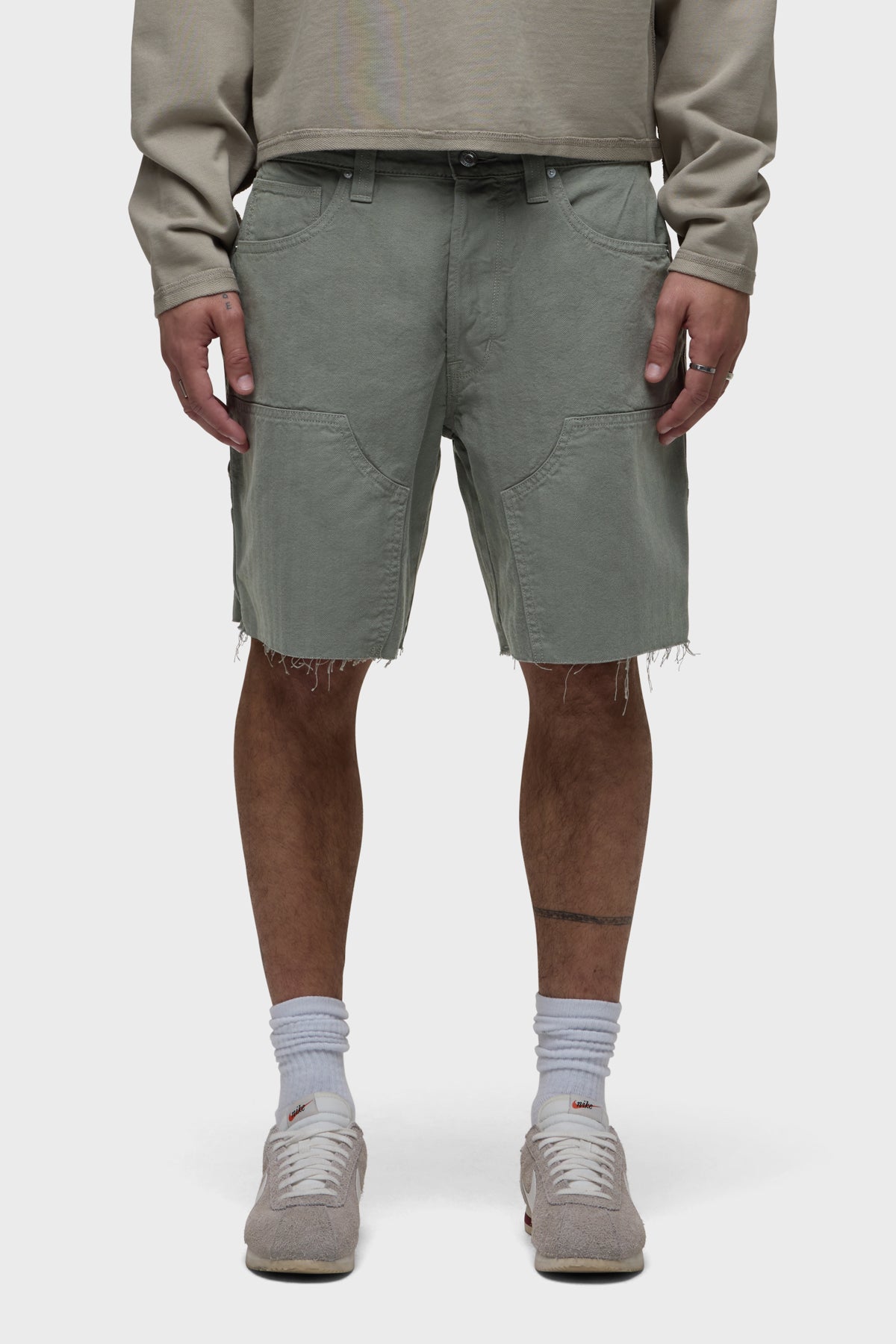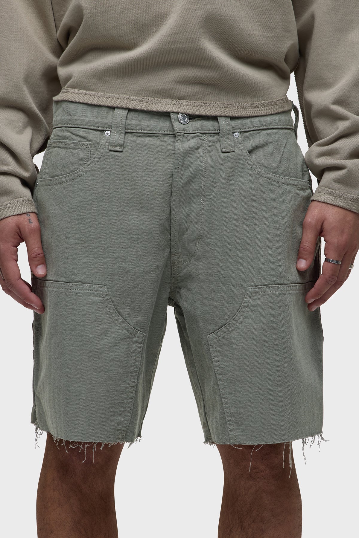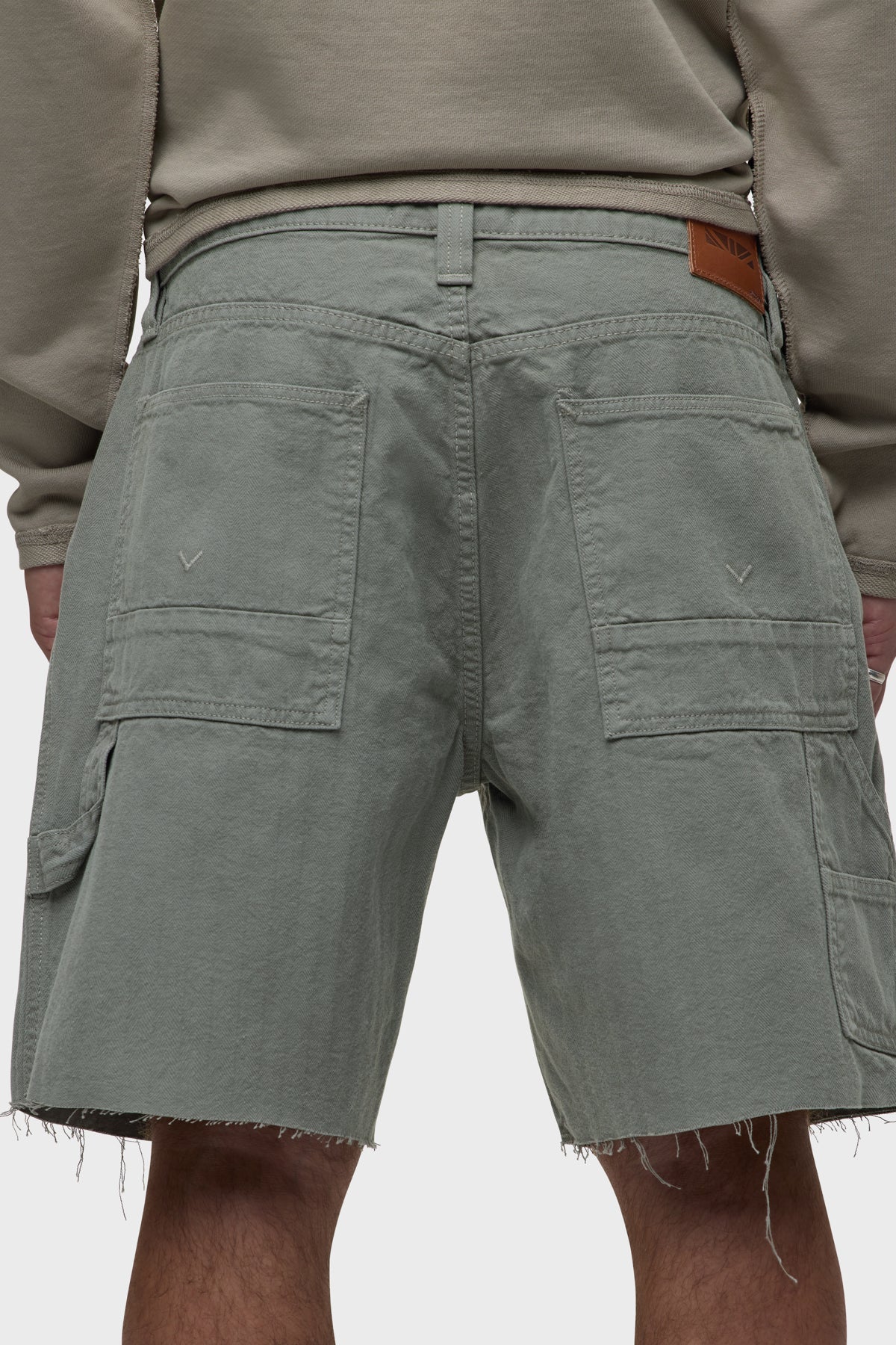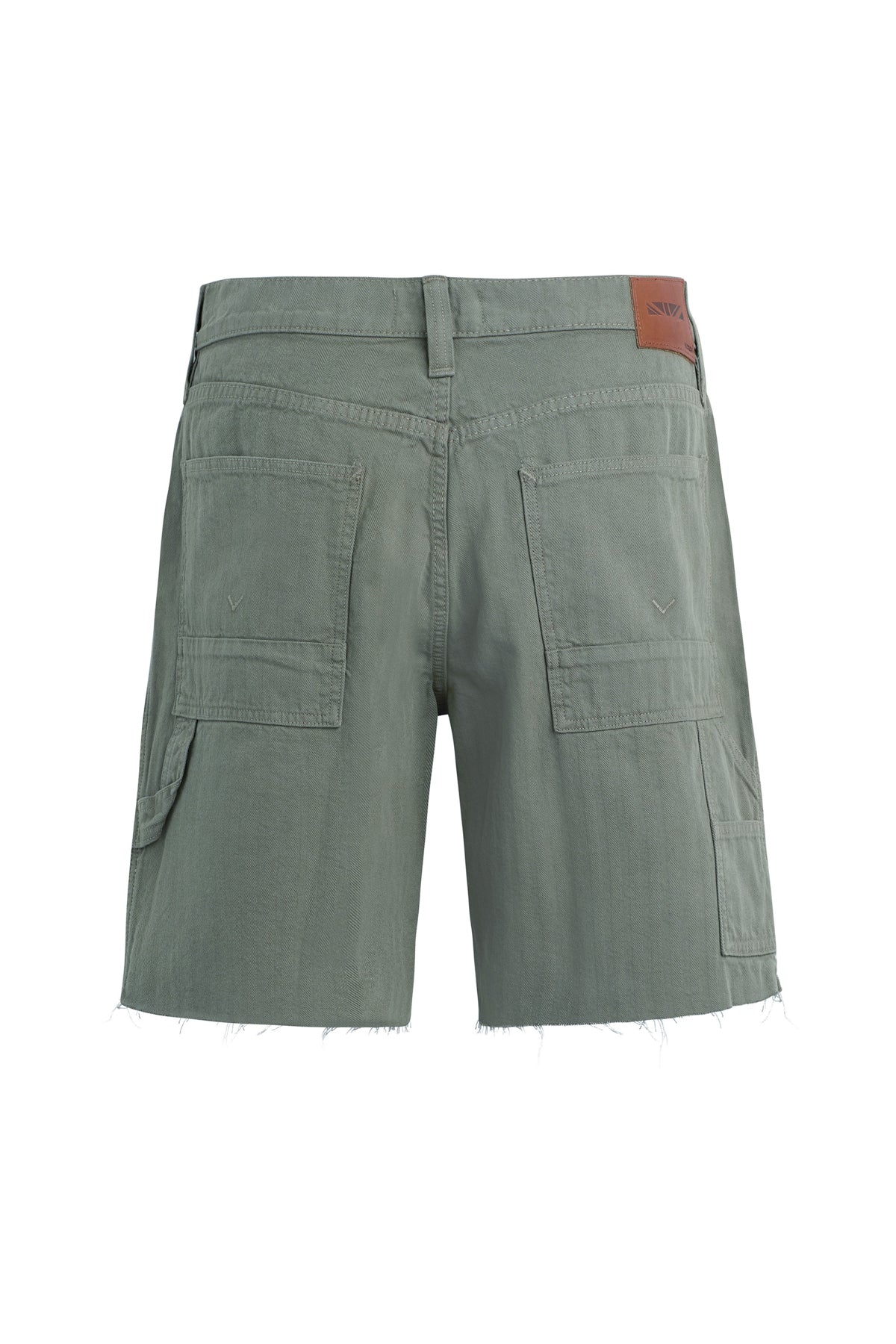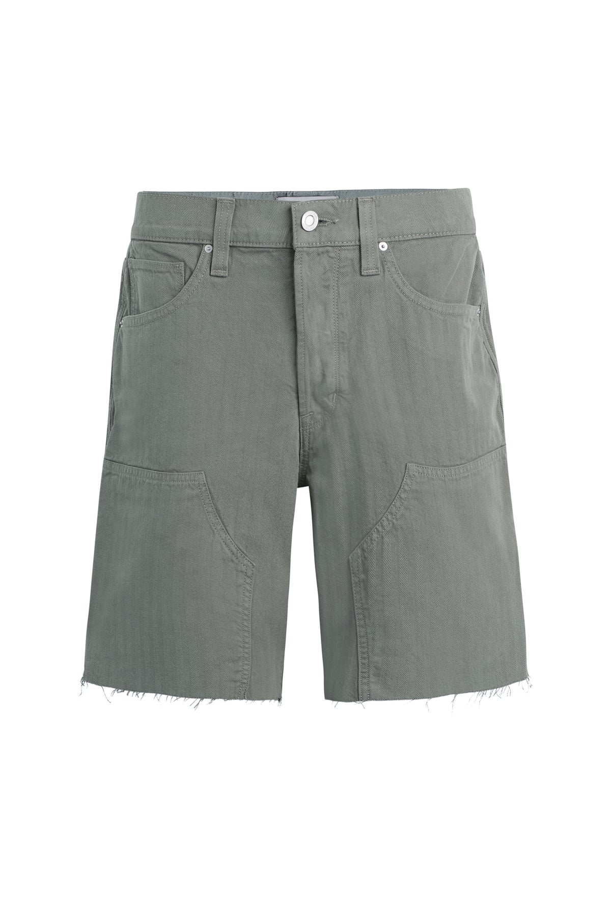 Our workwear-inspired Carpenter Short in Sage is cut from non-denim herringbone fabric. This pair is finished with a cut hem, reinforced leg panels and a hammer loop.
