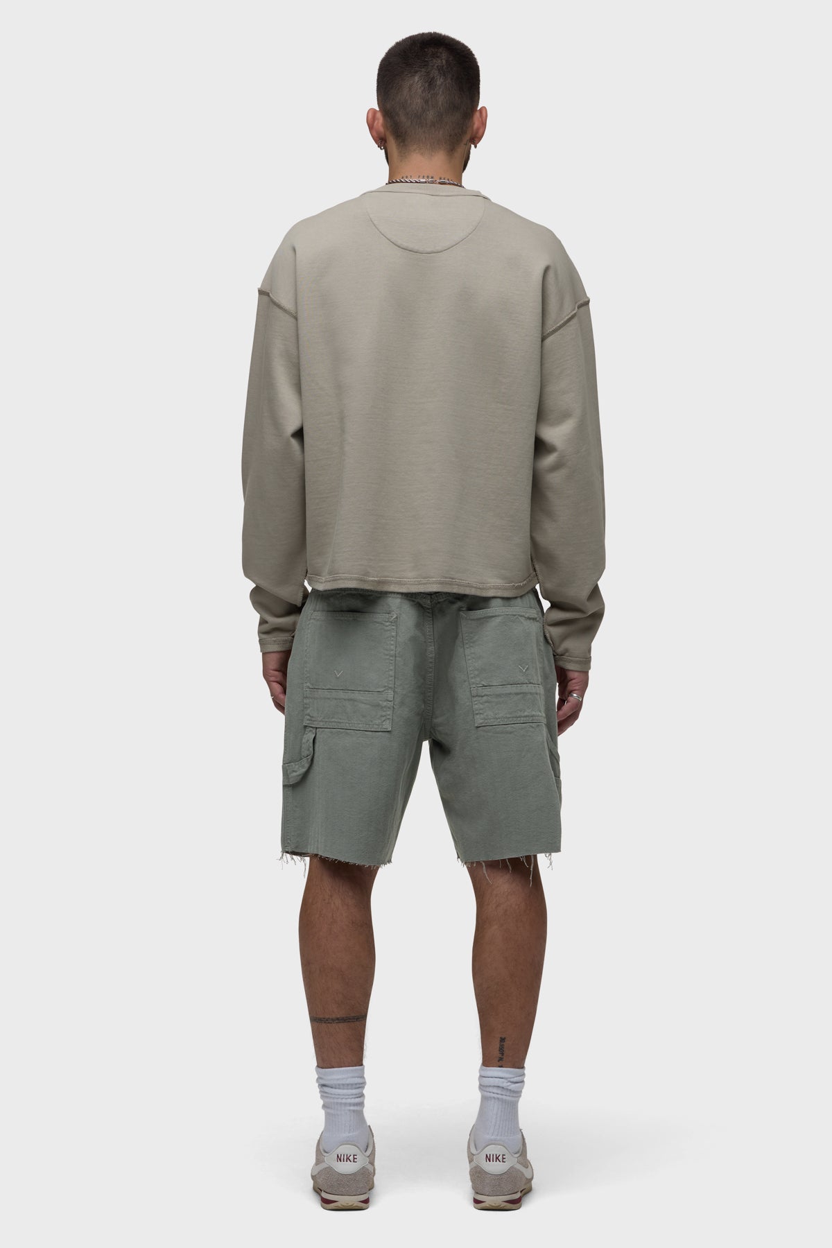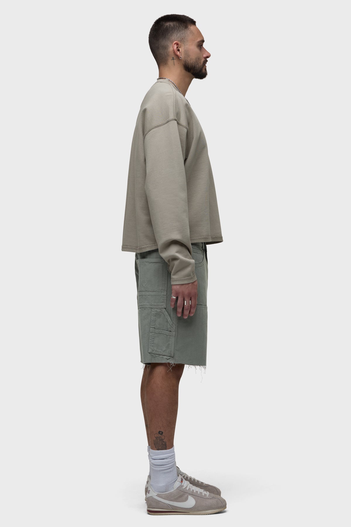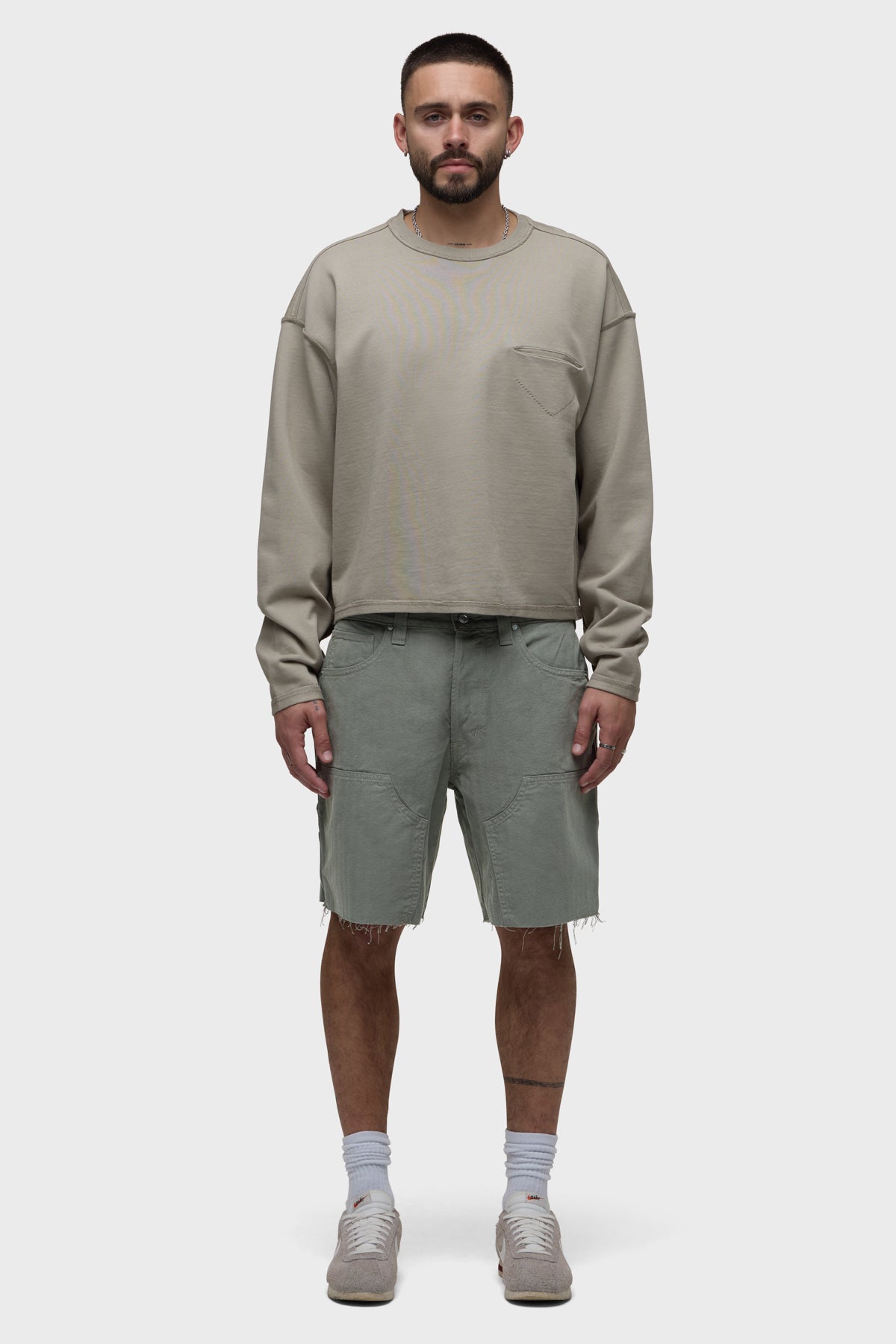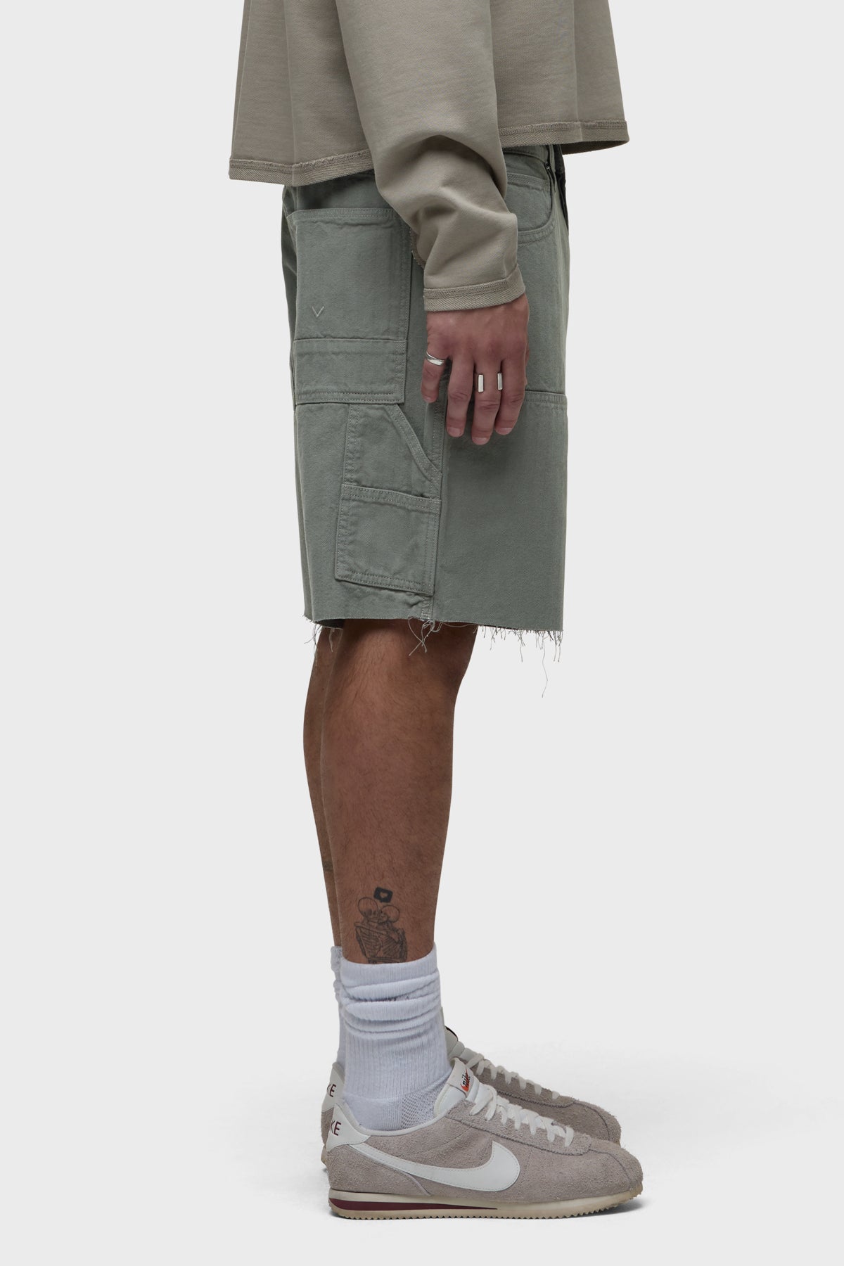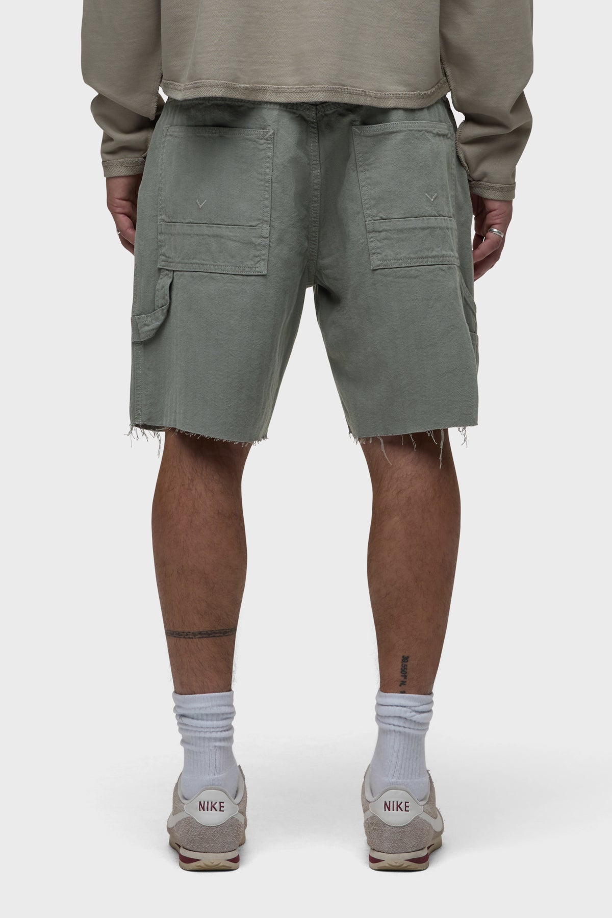 Our workwear-inspired Carpenter Short in Sage is cut from non-denim herringbone fabric. This pair is finished with a cut hem, reinforced leg panels and a hammer loop.