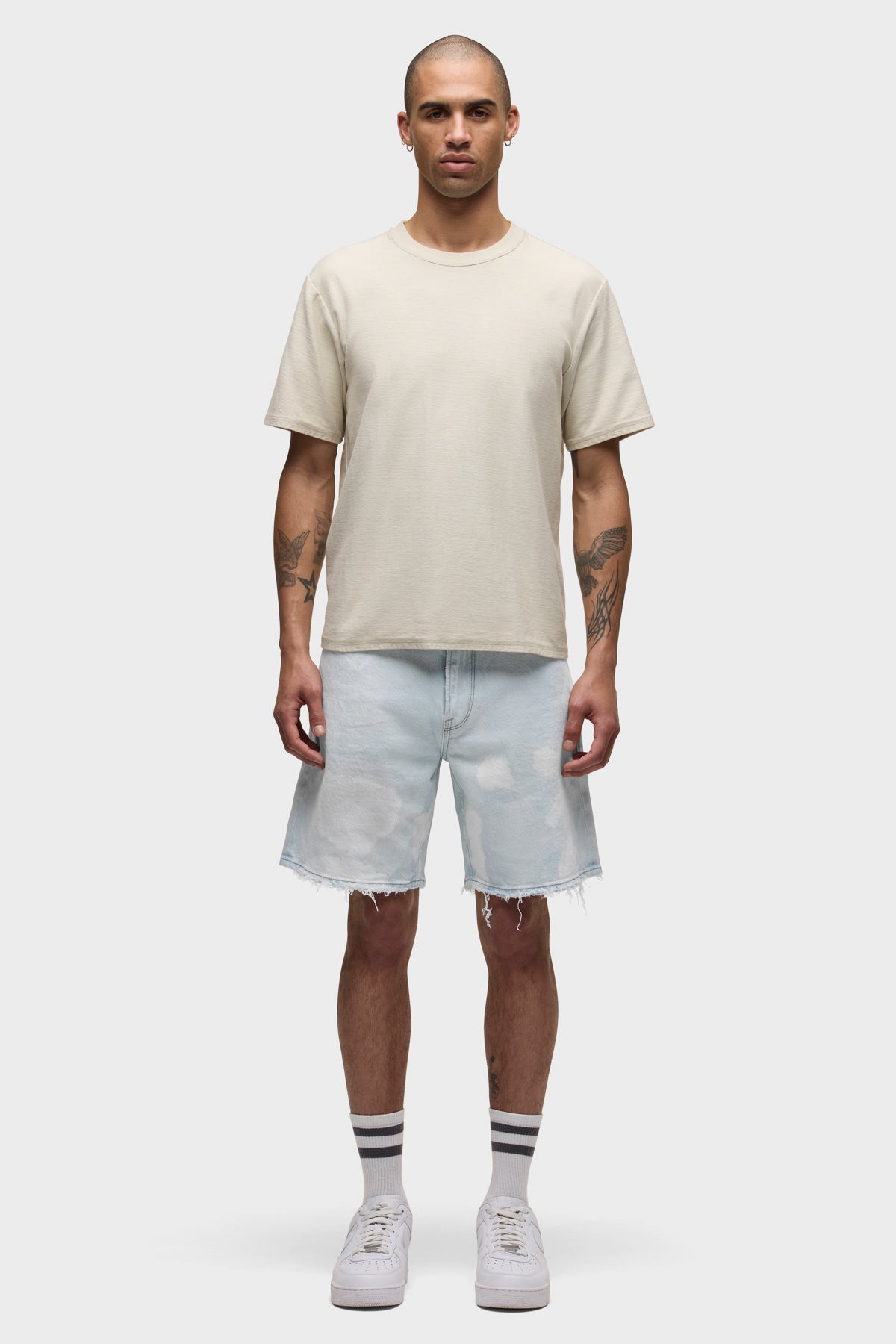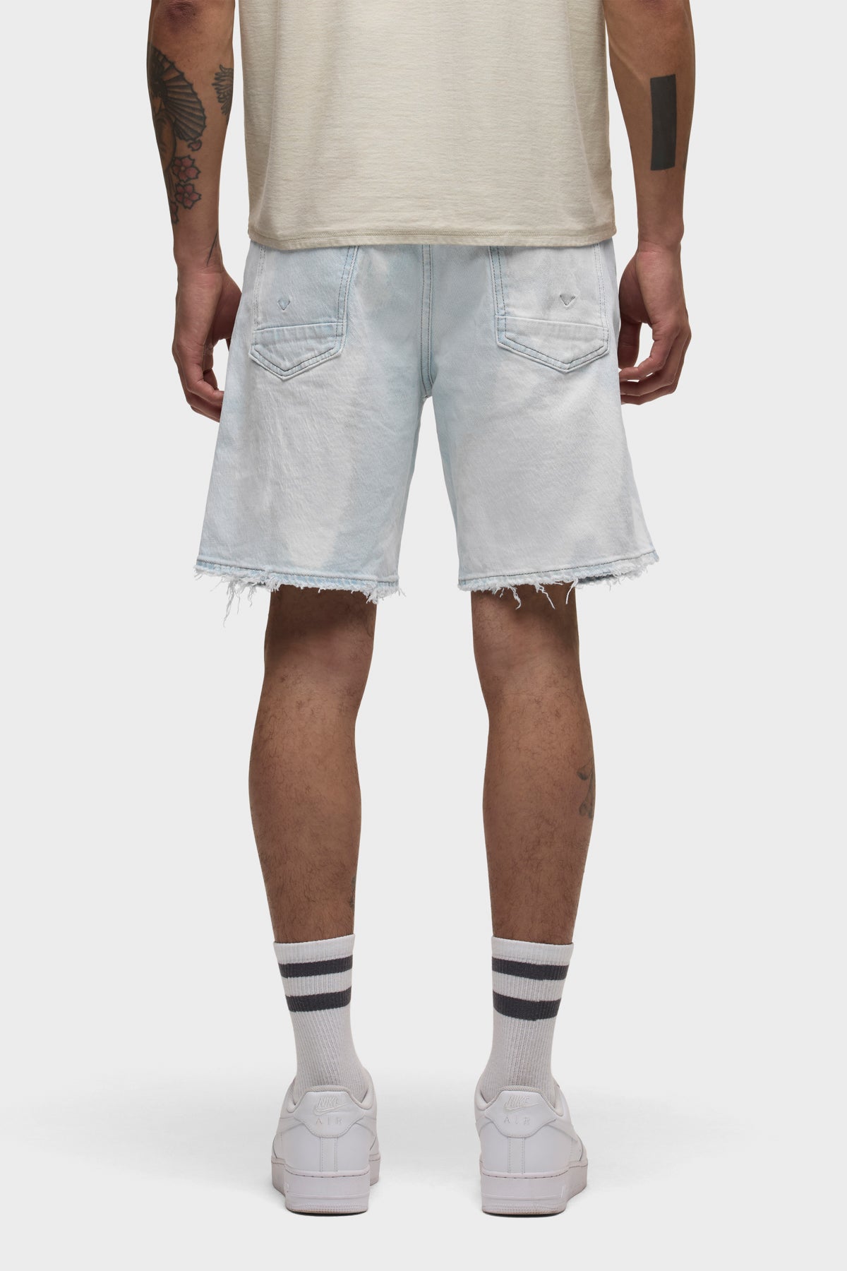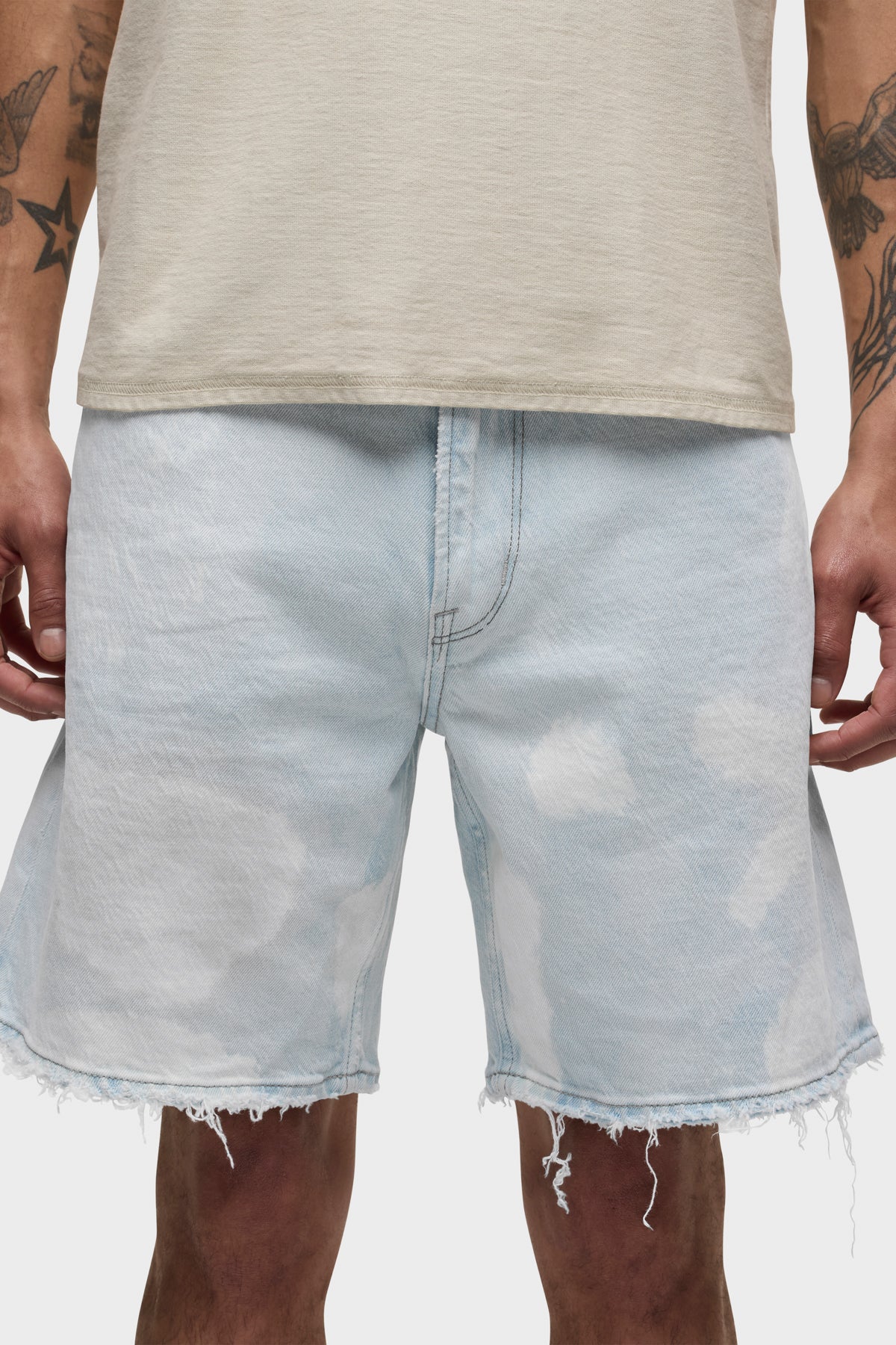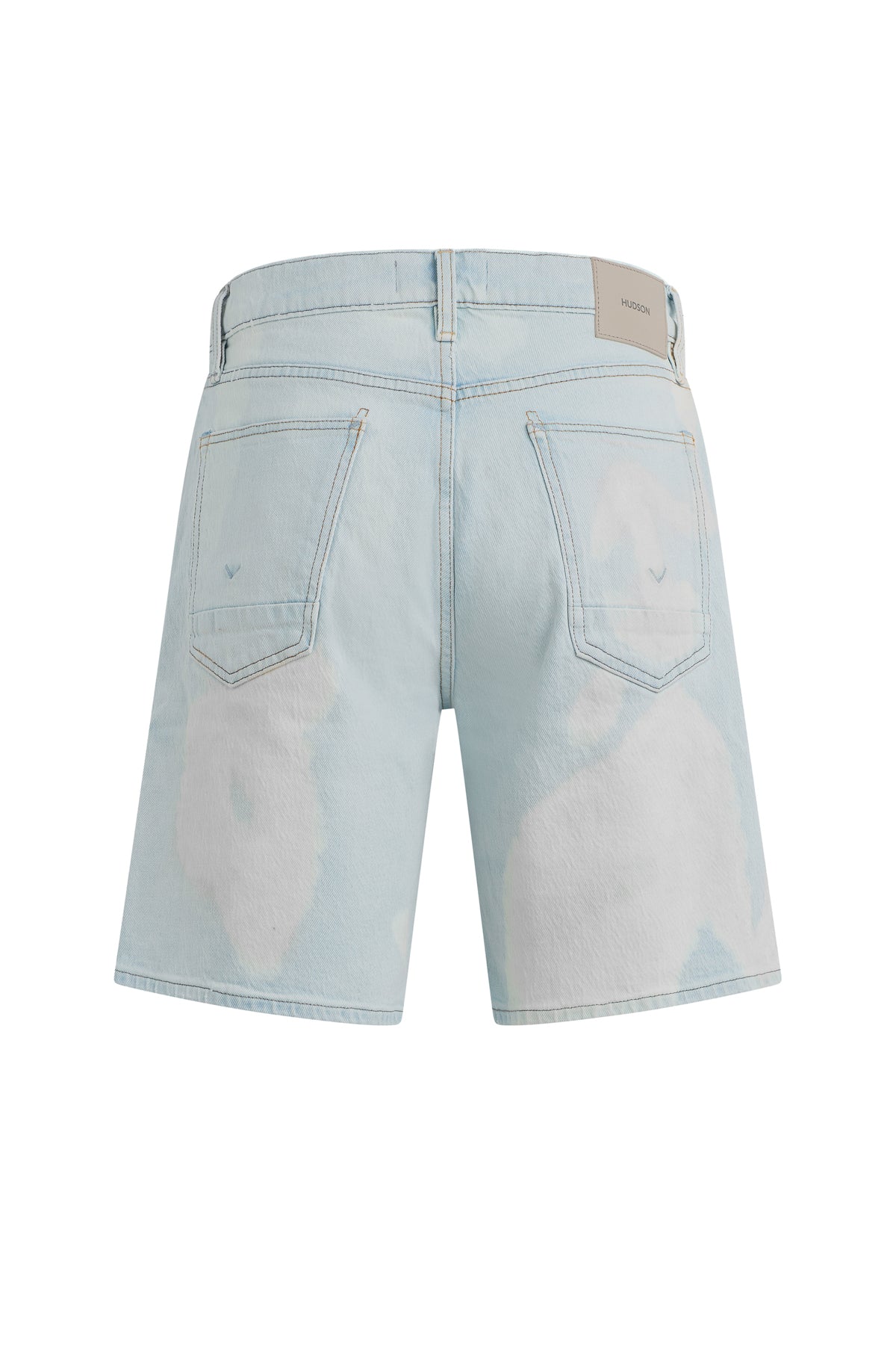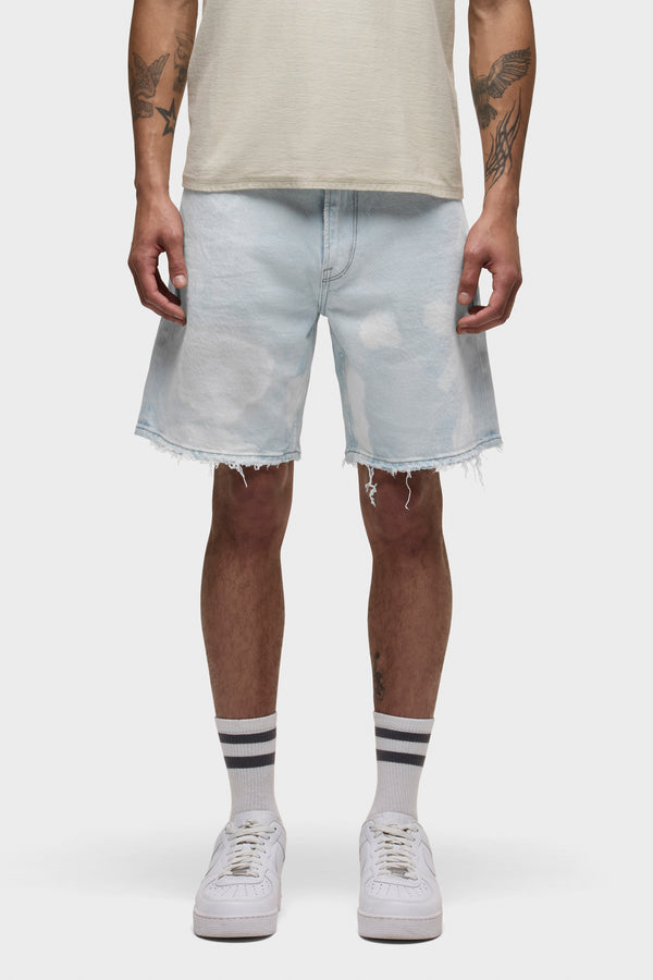 The Clint Relaxed Short in Bleached Cloud is a versatile essential, offering a laid-back straight fit. This pair features a super light indigo wash with an all-over uneven treatment made to look like dirty stains and spots. Each short is custom dyed, and one of a kind. The dying process can vary from piece to piece and is what makes this garment unique. -