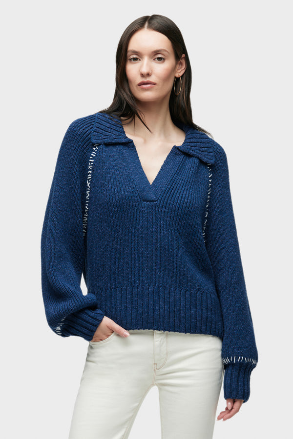 Our Collared Pullover, knitted from a cotton-blend, is a V-neck sweater with a relaxed, cozy fit. Finished with contrast whipstitching at the raglan sleeve seams and cuffs for a pop of color. -