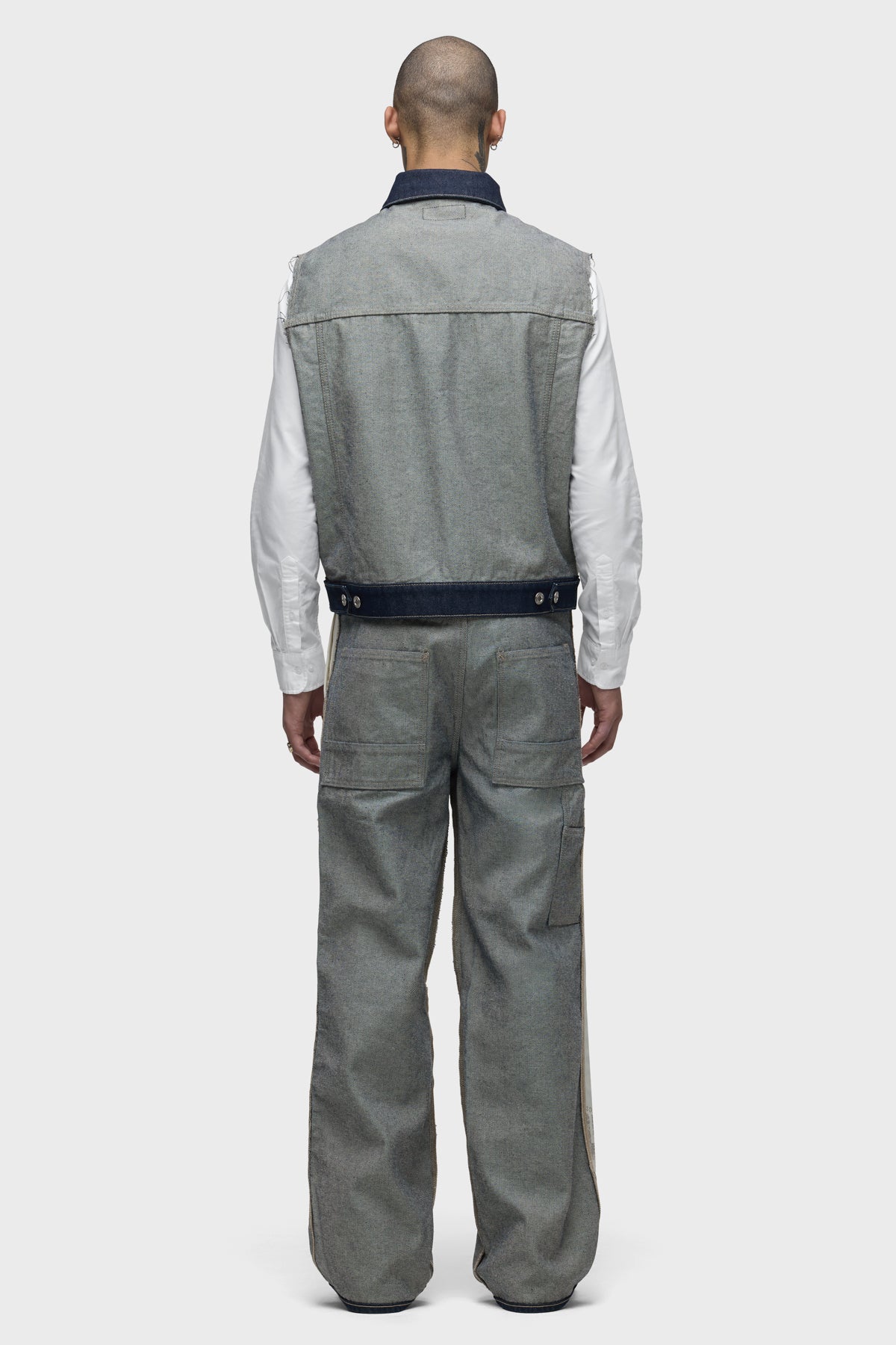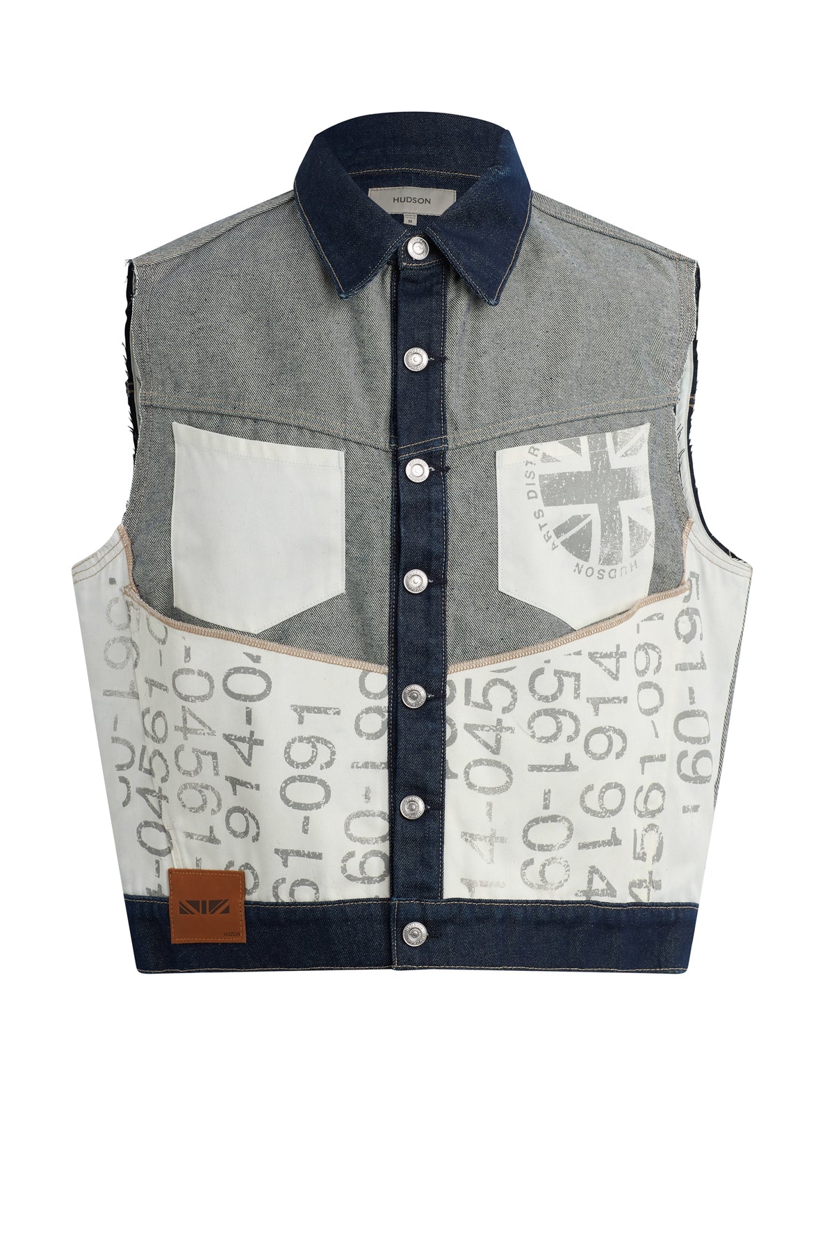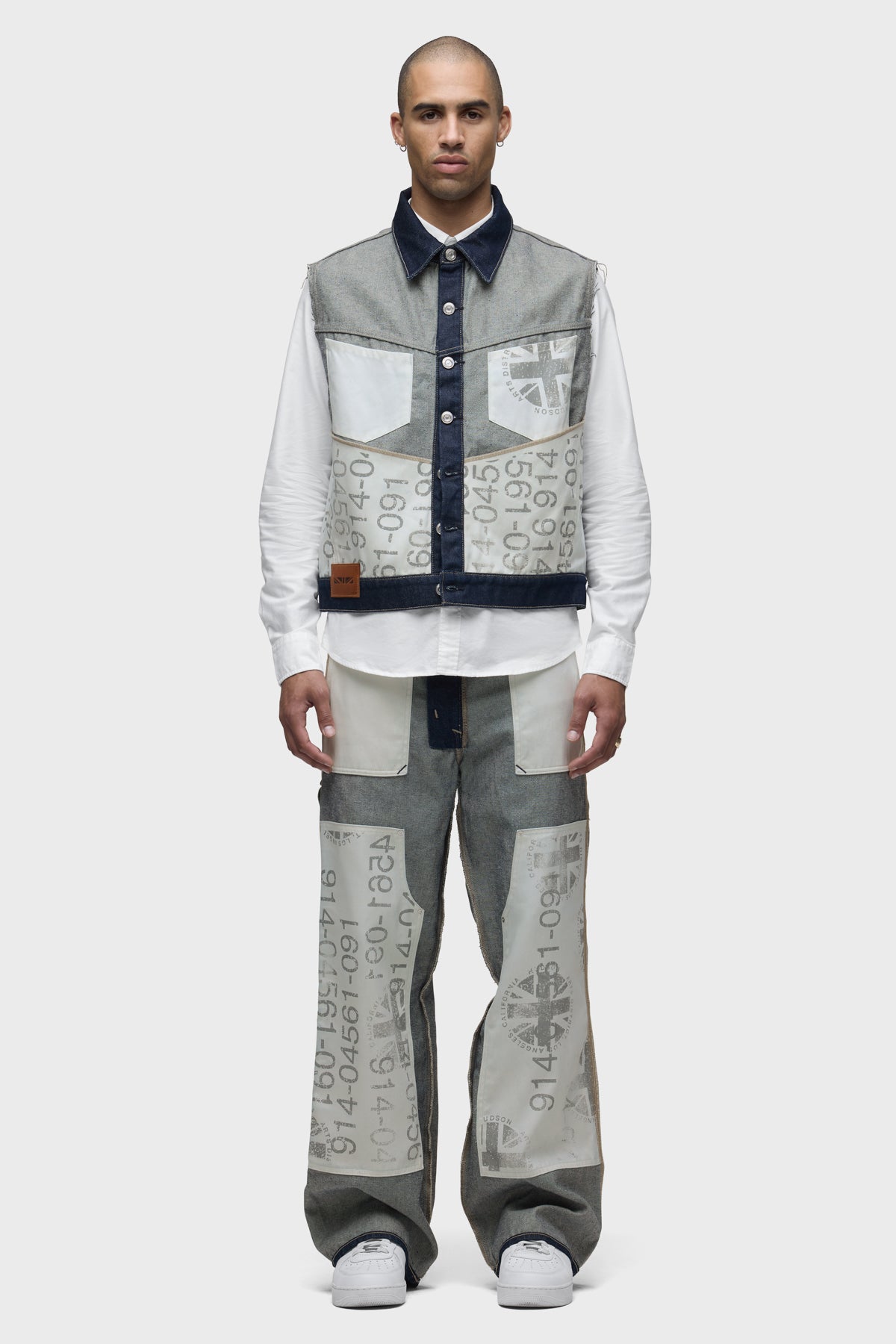 Our new fashion vest silhouette, the Columbus Vest in City, features a reverse, inside-out design with a screen printed logo detail on the front and back of vest. Pair it with the coordinating Columbus Wide Leg Jean for a complete look. . -