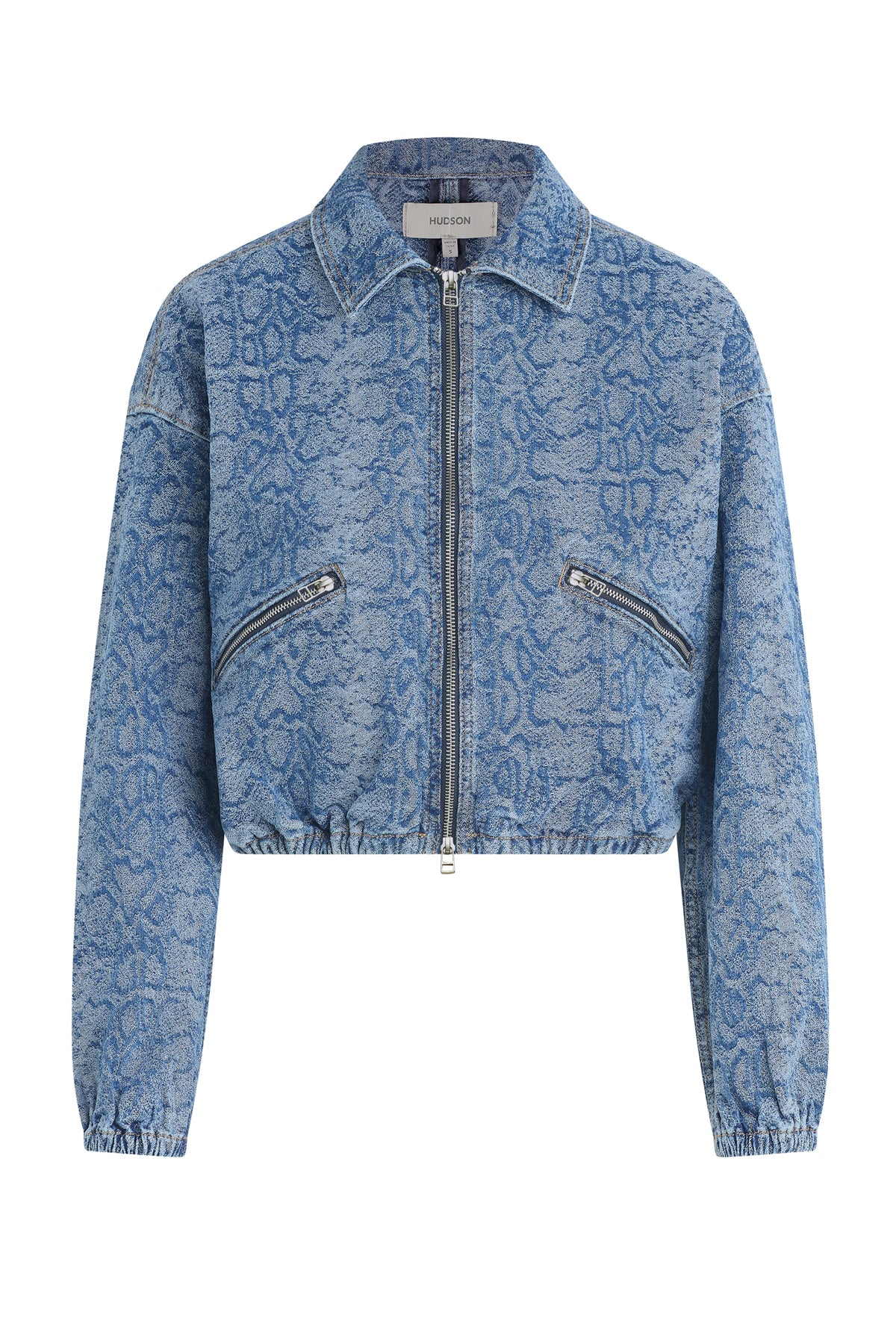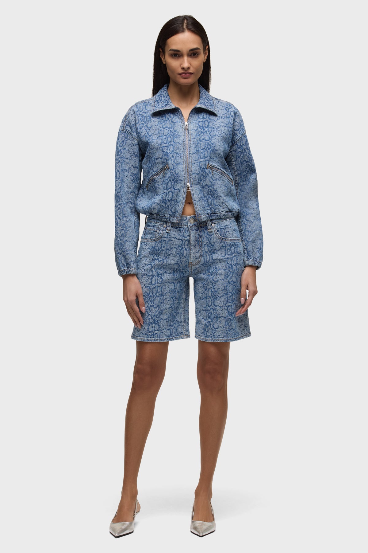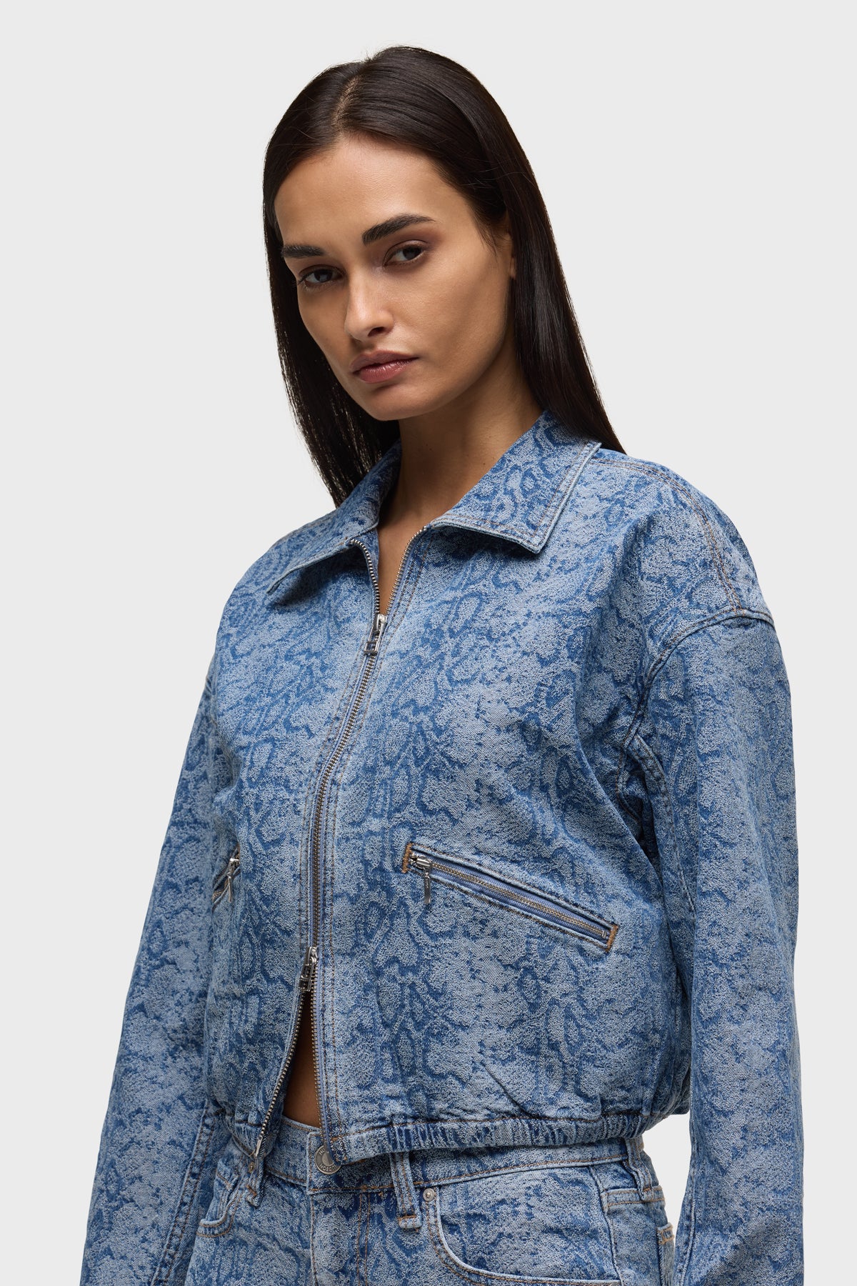 The Cropped Zip-Up Jacket in Venom is a bomber-inspired unlined jacket. The star of this style is the snake jacquard in a medium indigo wash on slightly stretchy denim. It is finished with a two-way zipper at the center front with zipper pockets. -